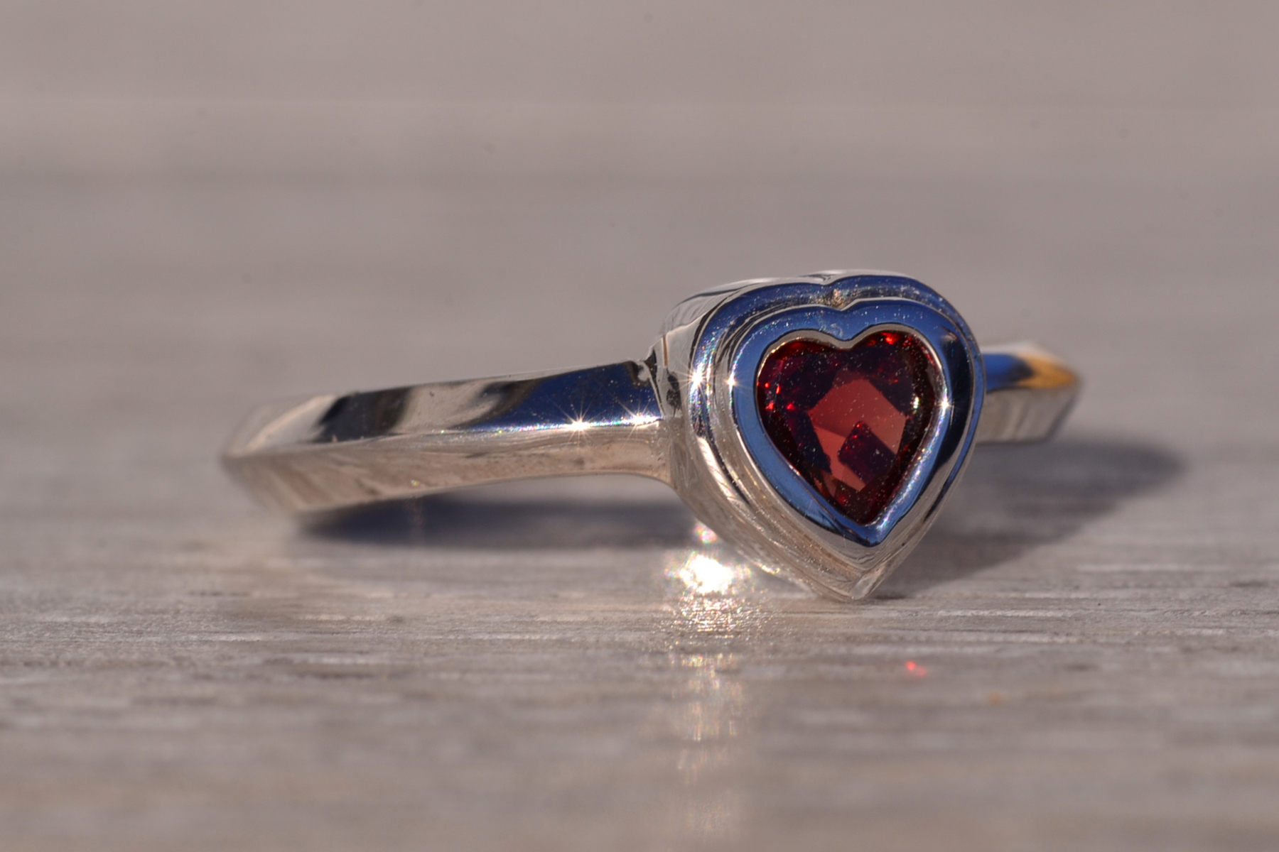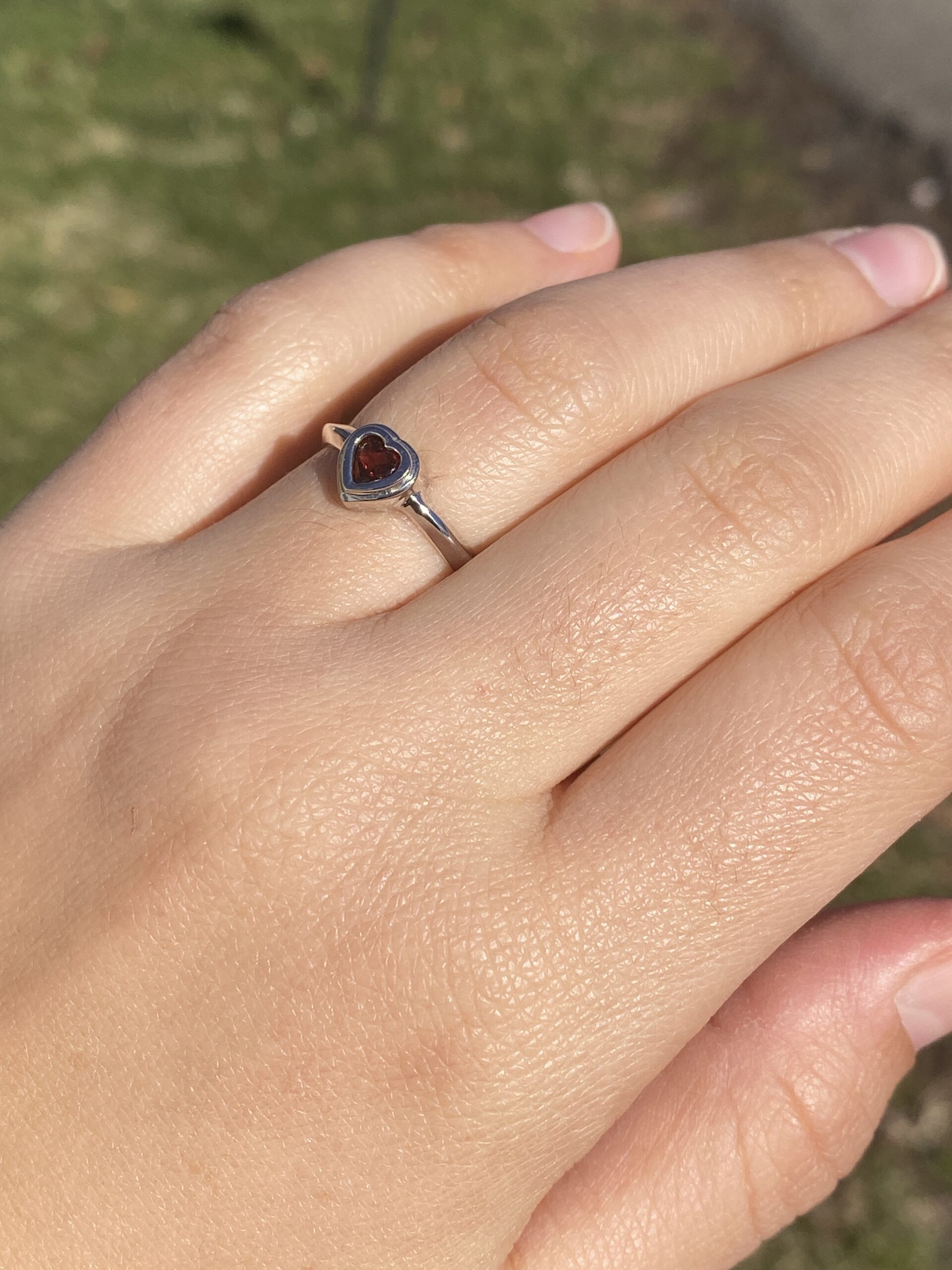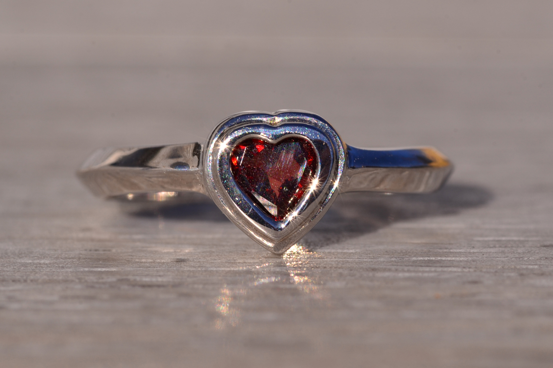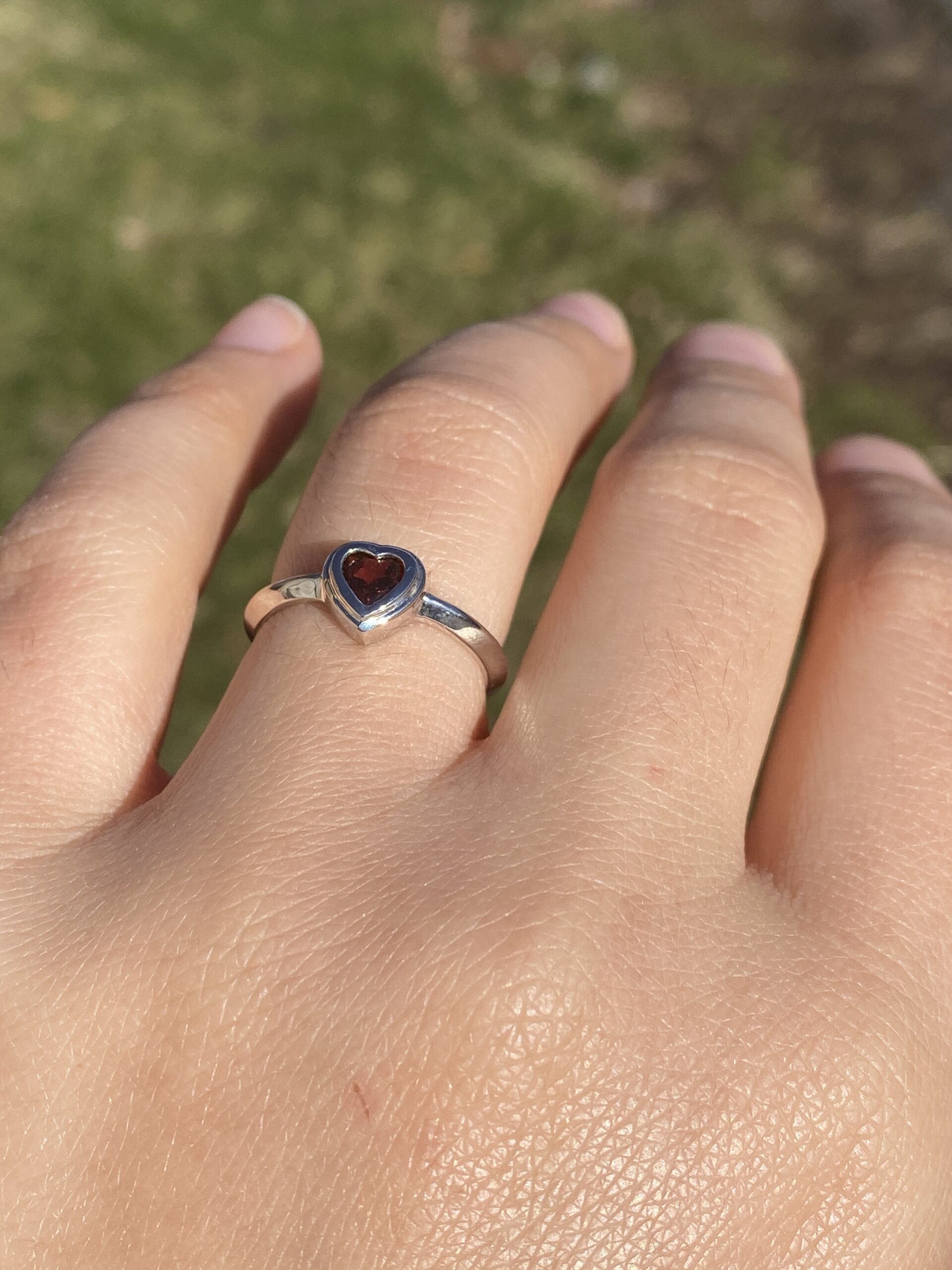 The Tene: Bezel Set Natural Garnet in White Gold. The ring showcases a central bezel-set heart brilliant-cut natural garnet, radiating deep, rich color. It is elegantly finished with a knife-edge style shank, adding a contemporary touch to the design. Crafted in 14 karat white gold, this exquisite piece is currently a finger size 5.75, with the option to adjust to any finger size for an additional charge upon request, ensuring a perfect fit for your unique style.