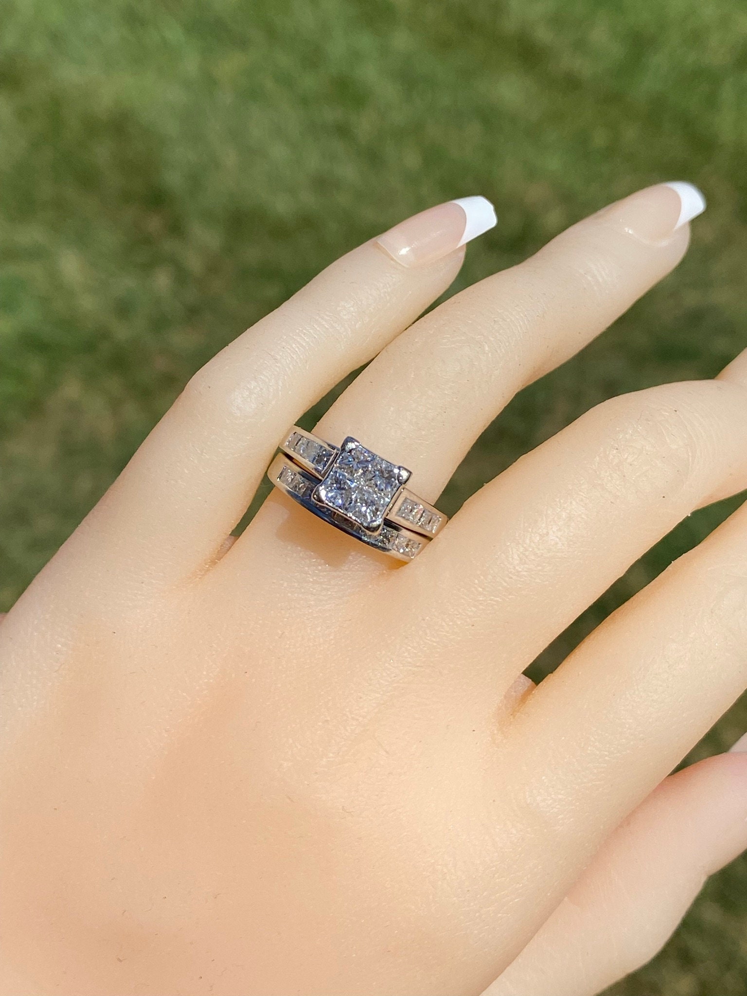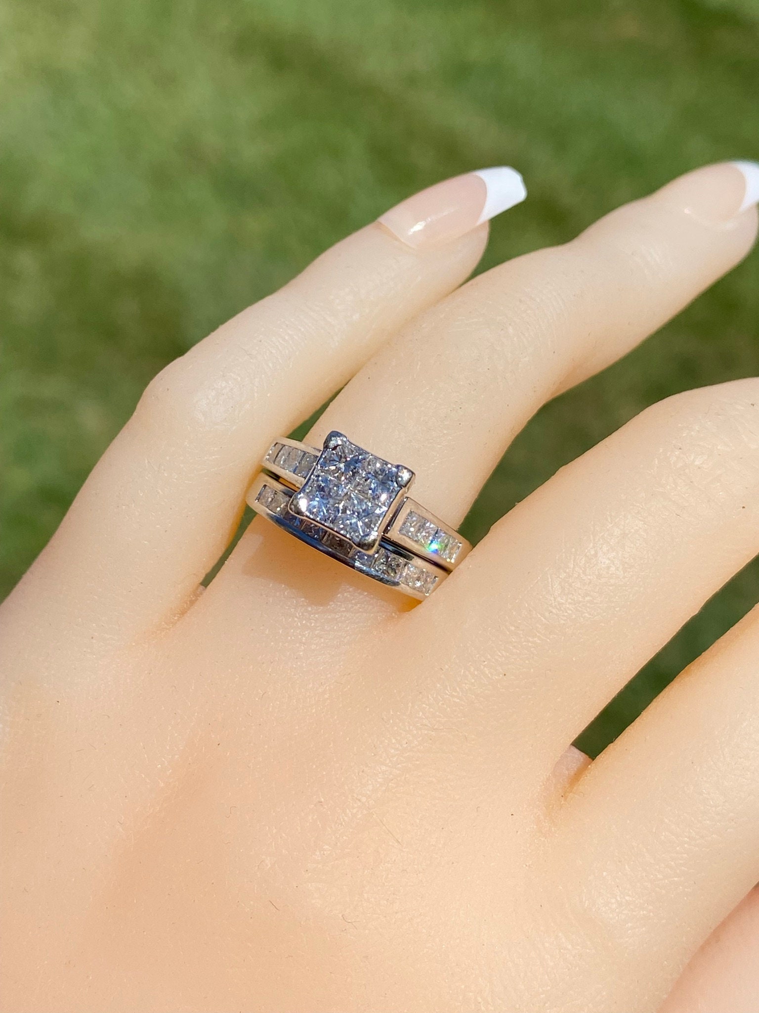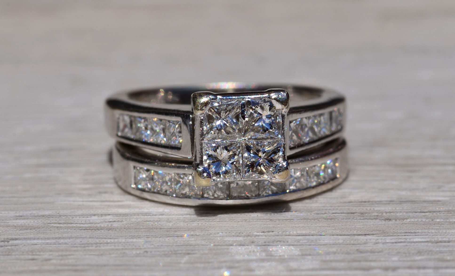 SKU: 23400353 Categories: Contemporary Jewelry, Engagement Rings, Final Sale Items Tags: 14 karat, 14 karat white, bridal set, diamond, diamond engagement, engagement ring, Gold, illusion set, infinity set, Ladies, ladies' ring, matching band, mystery set, mystery set ring, princess cut, vintage, vintage engagement, white, white gold ring, white gold set, women, women's ring