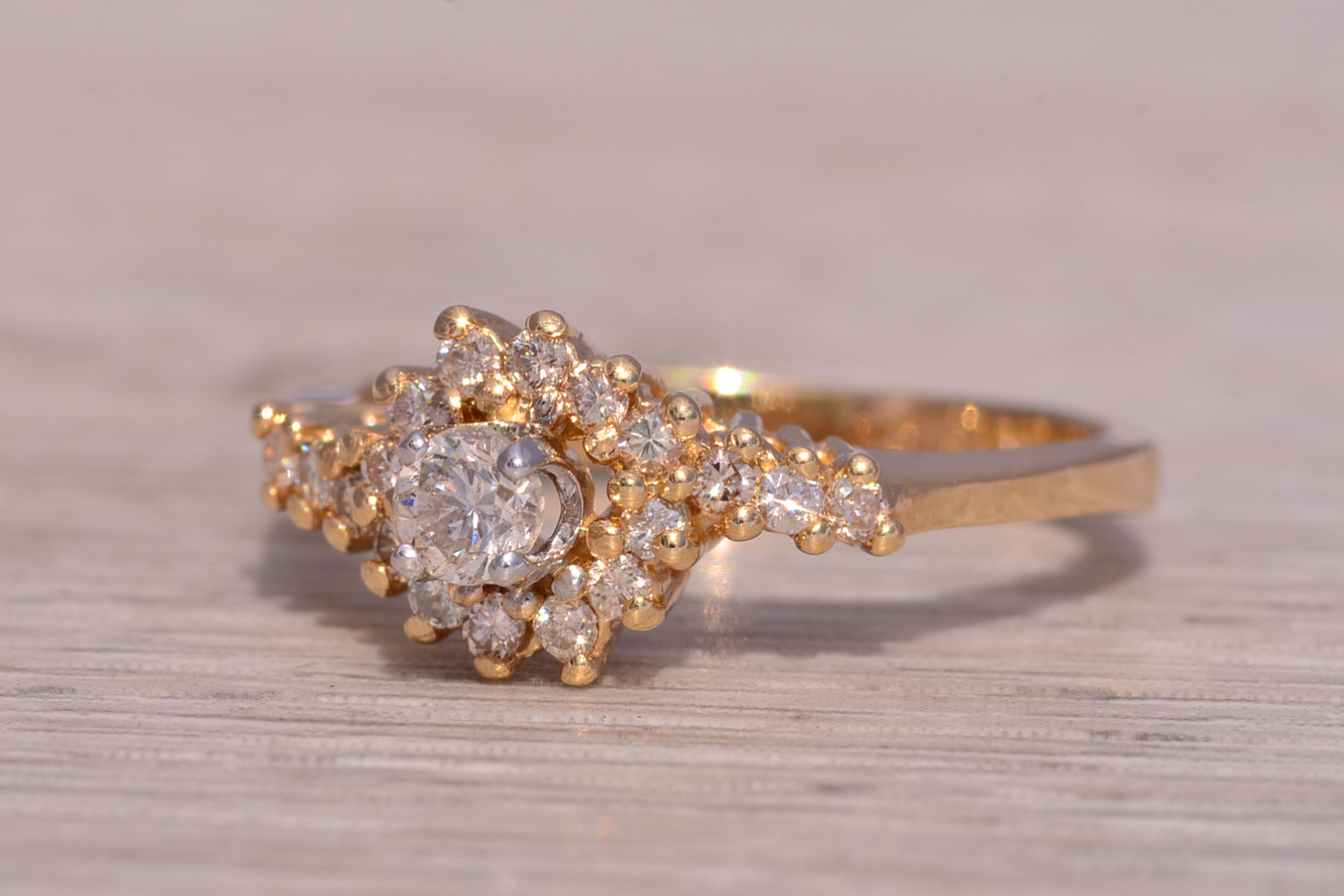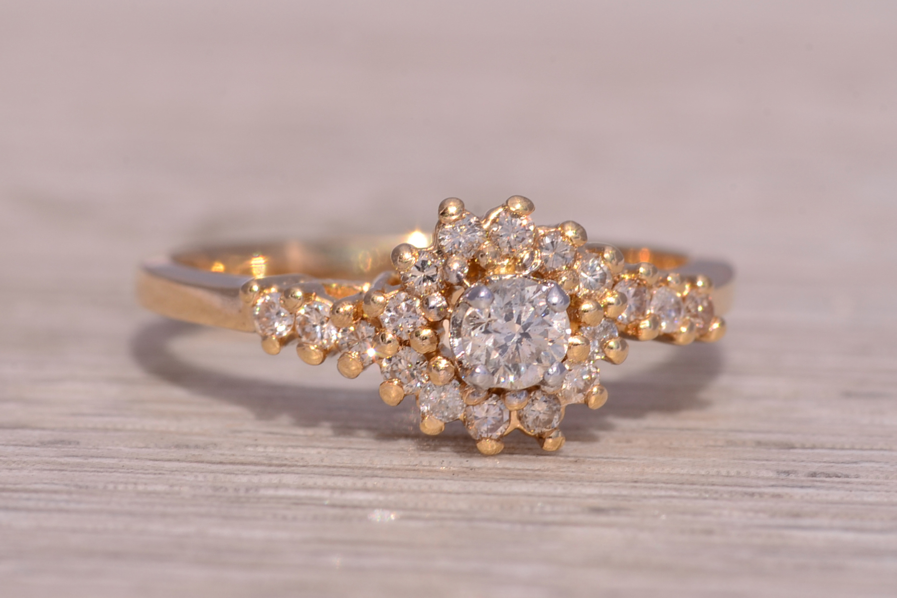 This stunning piece, known as The Timeless Bloom, features a captivating natural diamond at its center, complemented by additional sparkling natural diamonds in the mounting. The 1980’s style engagement ring showcases a 0.14 carat round brilliant cut natural diamond at the center, surrounded by 0.18 carats of natural diamonds set in yellow gold. The natural diamonds, with their sparkling brilliance, are perfectly complemented by the luxurious yellow gold setting, making this piece an exquisite addition to any jewelry collection. The ring is crafted in 14 karat yellow gold and is currently a finger size 6 but can be adjusted to any finger size for an additional charge upon request, ensuring a perfect fit.