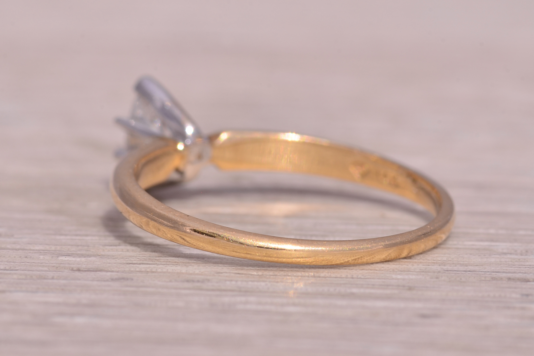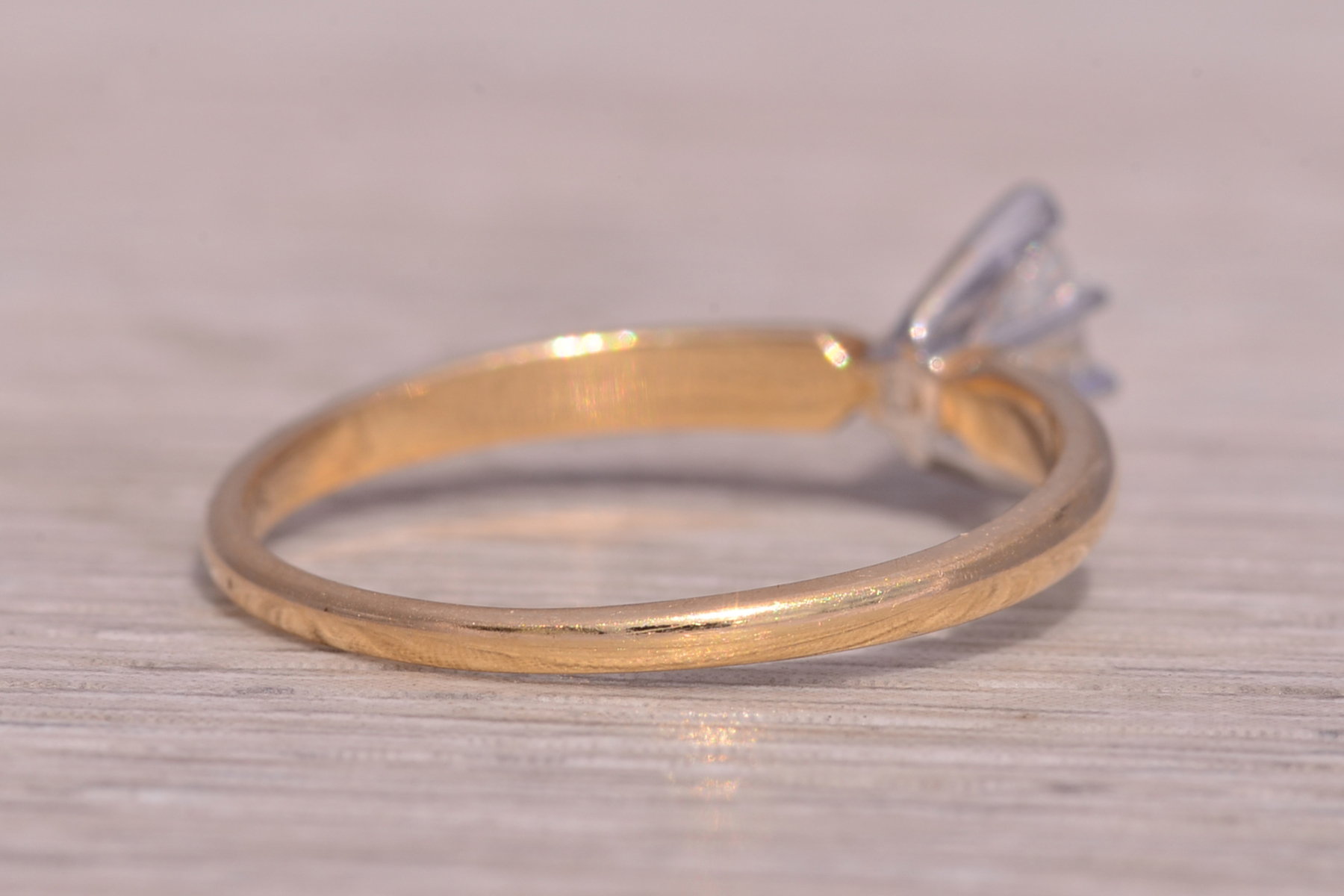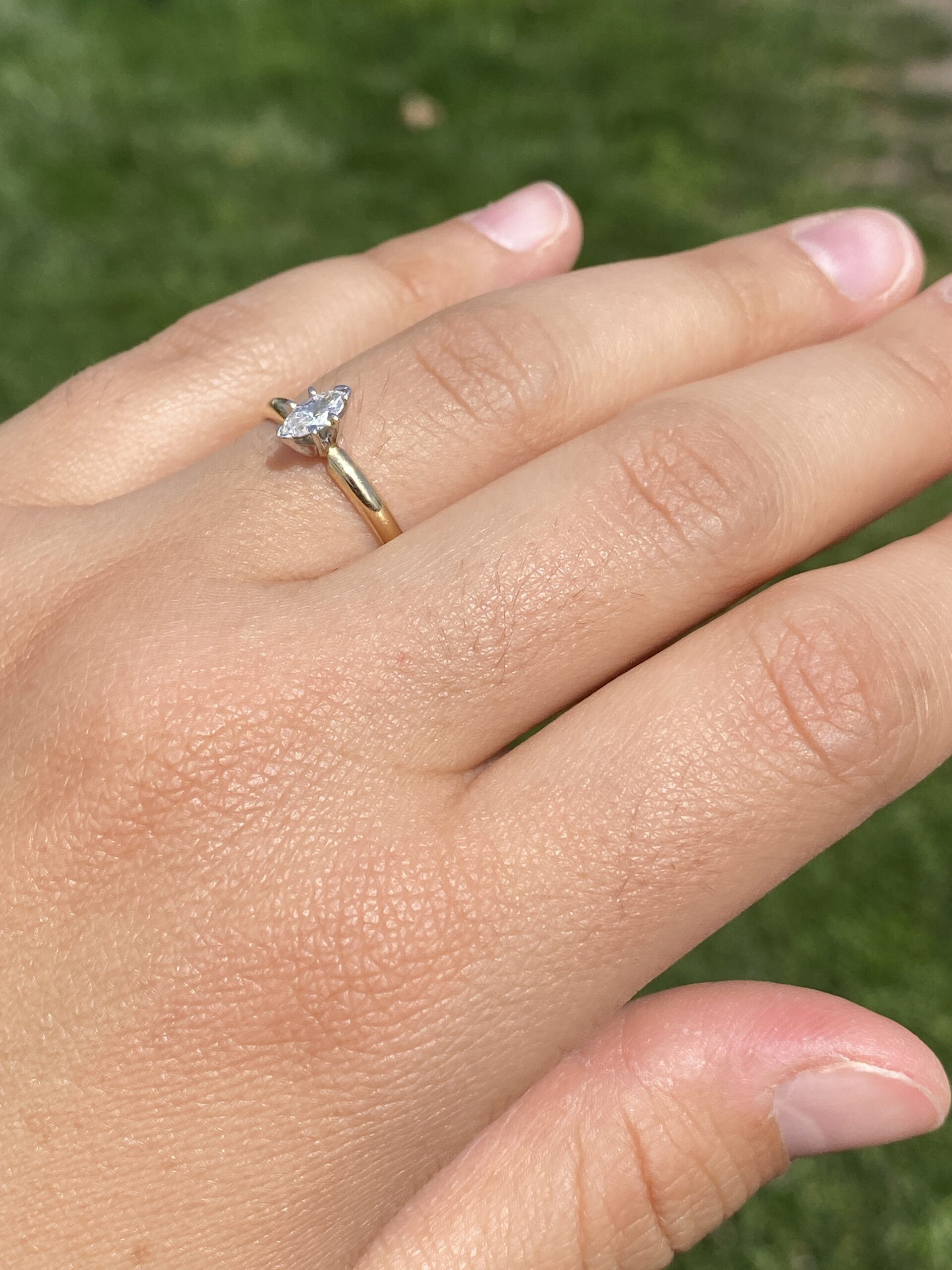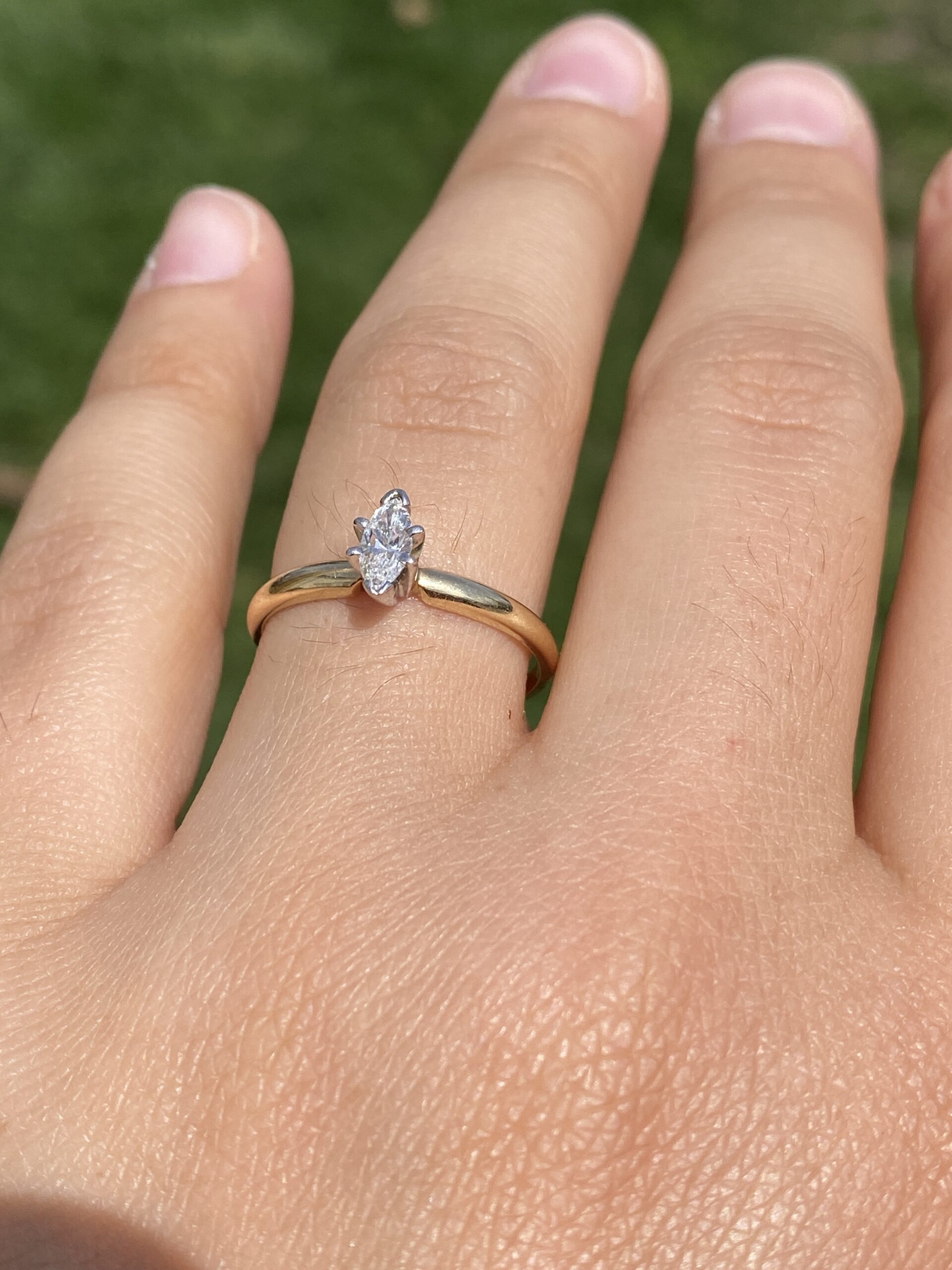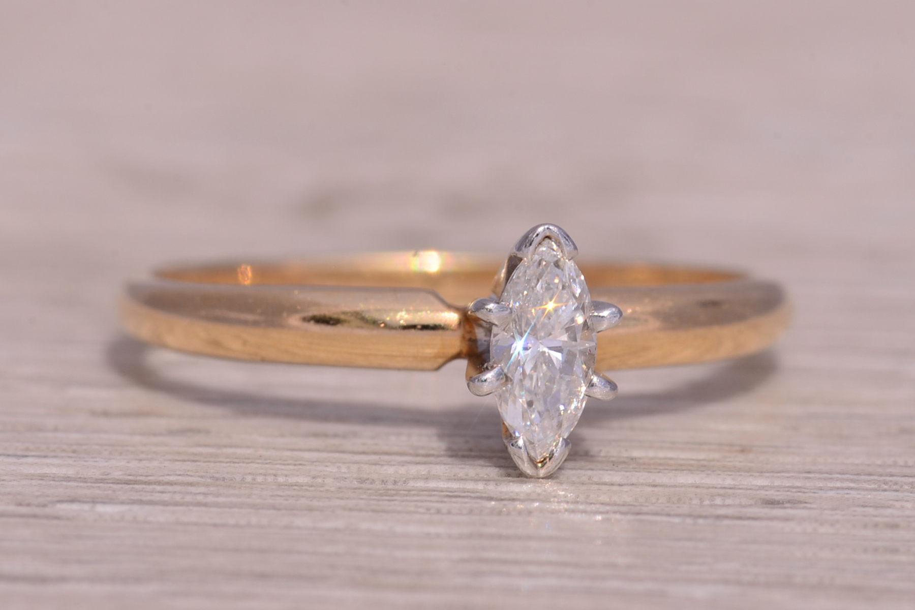 This stunning piece, known as The Timeless Marquise, features a captivating natural diamond totaling 0.34 carats. The diamond has an approximate Gemological Institute of America clarity grade of I1 and a color grade of I. The marquise brilliant cut natural diamond is elegantly set in 14 karat yellow gold, designed with a classic and sophisticated motif. The ring is crafted in 14 karat yellow gold and is currently a finger size 7.25 but can be adjusted to any finger size for an additional charge upon request, ensuring a perfect fit.