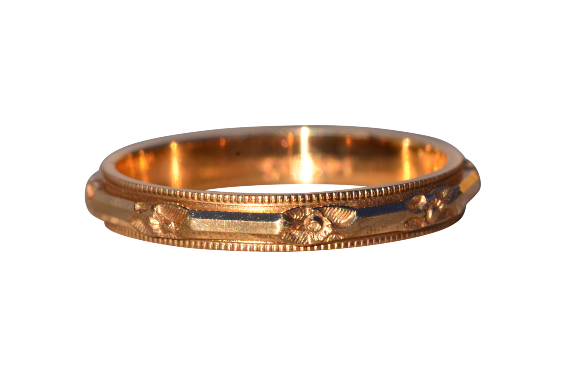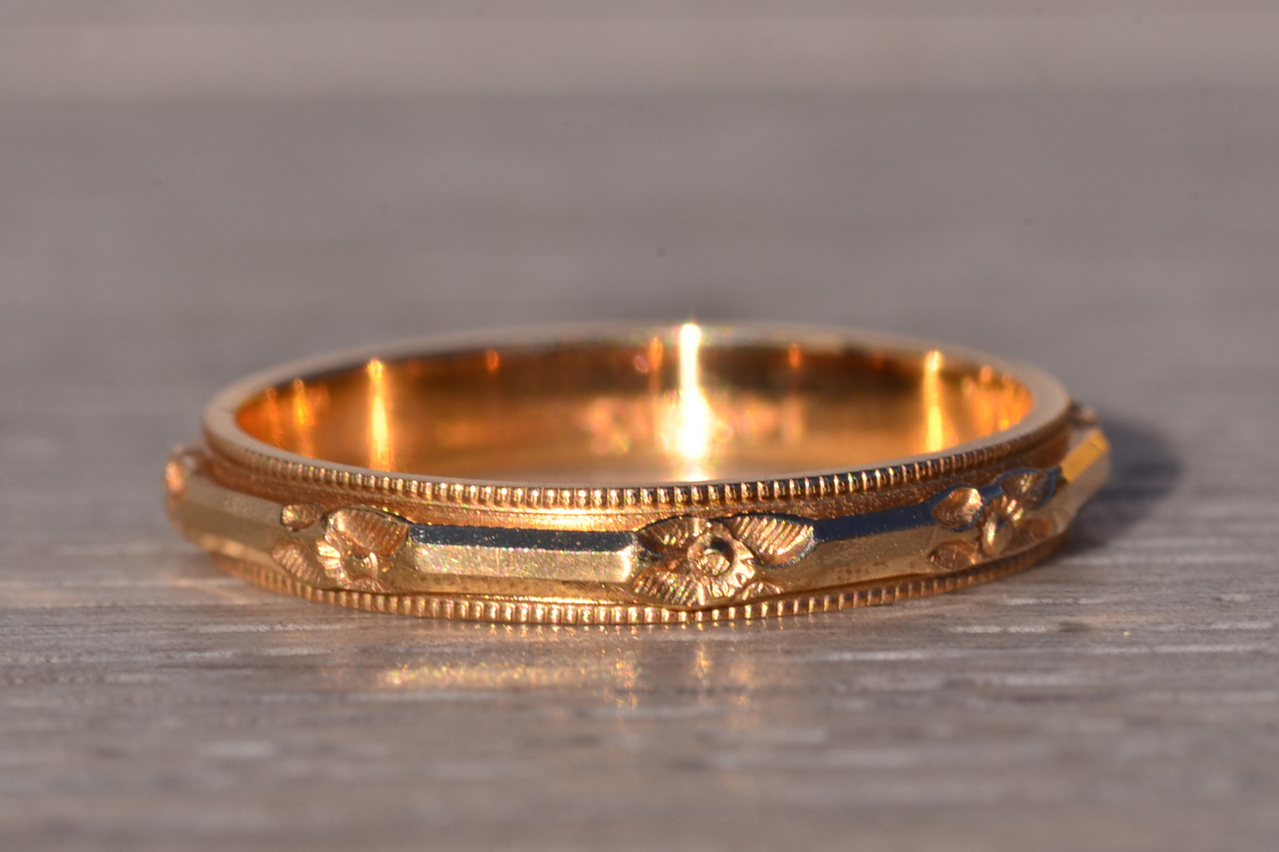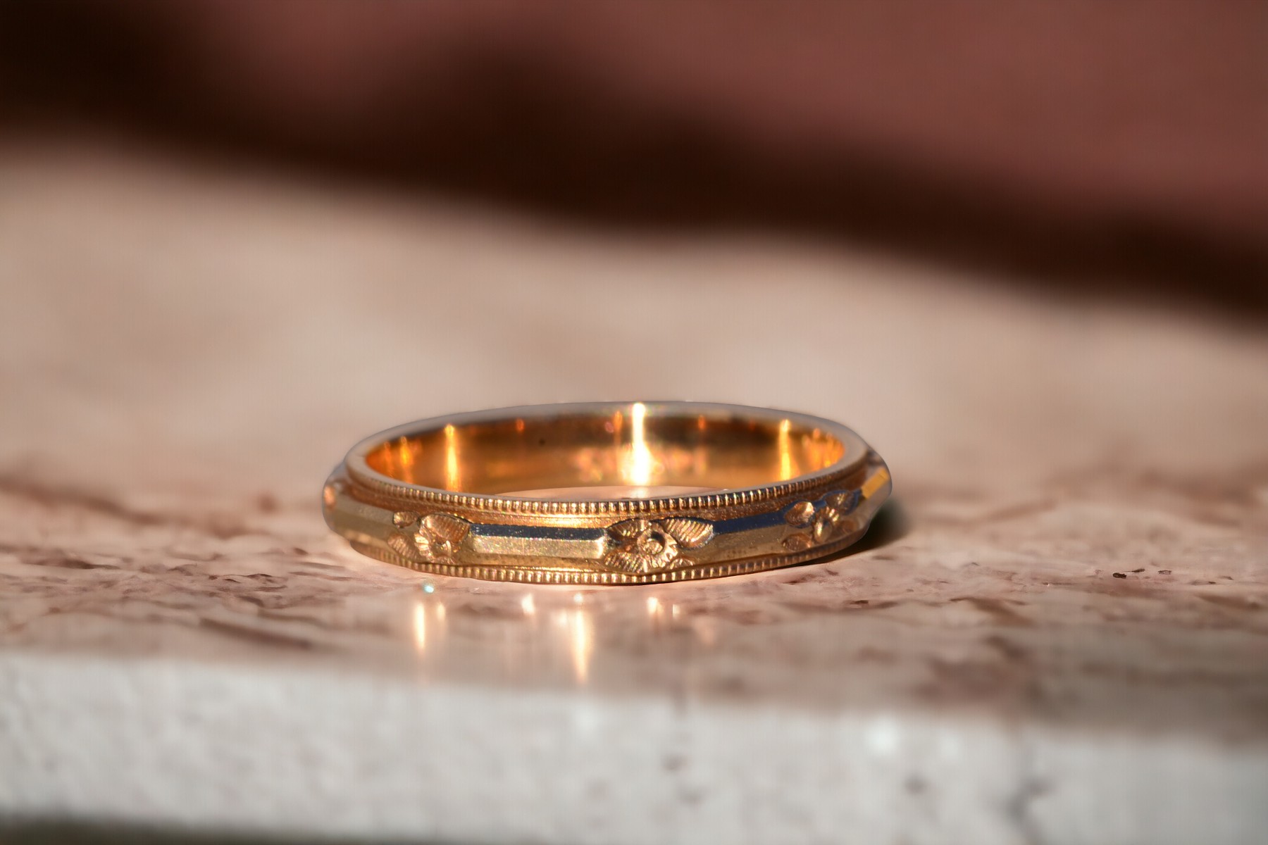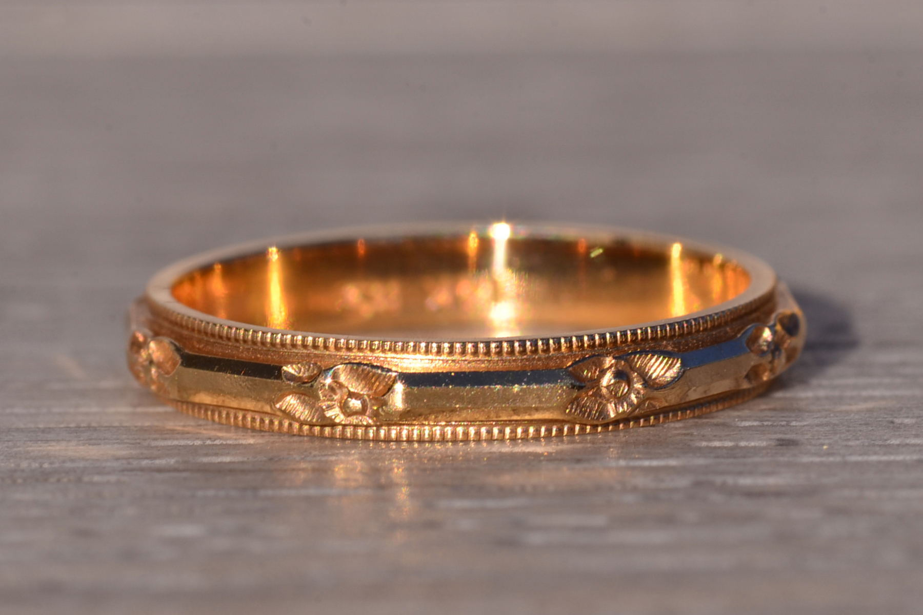 Classic Tapered Baguette Semi Mount in White and Yellow Gold. This exquisite new old stock antique wedding band showcases delicate floral stations nestled between a polished dome center, exuding vintage charm and elegance. The outer edge is meticulously adorned with fine milgrain detailing, adding a touch of refinement to the design. Crafted in lustrous 14 karat yellow gold, the band is currently sized at 5.75, waiting to adorn the finger of its new owner with its timeless allure.