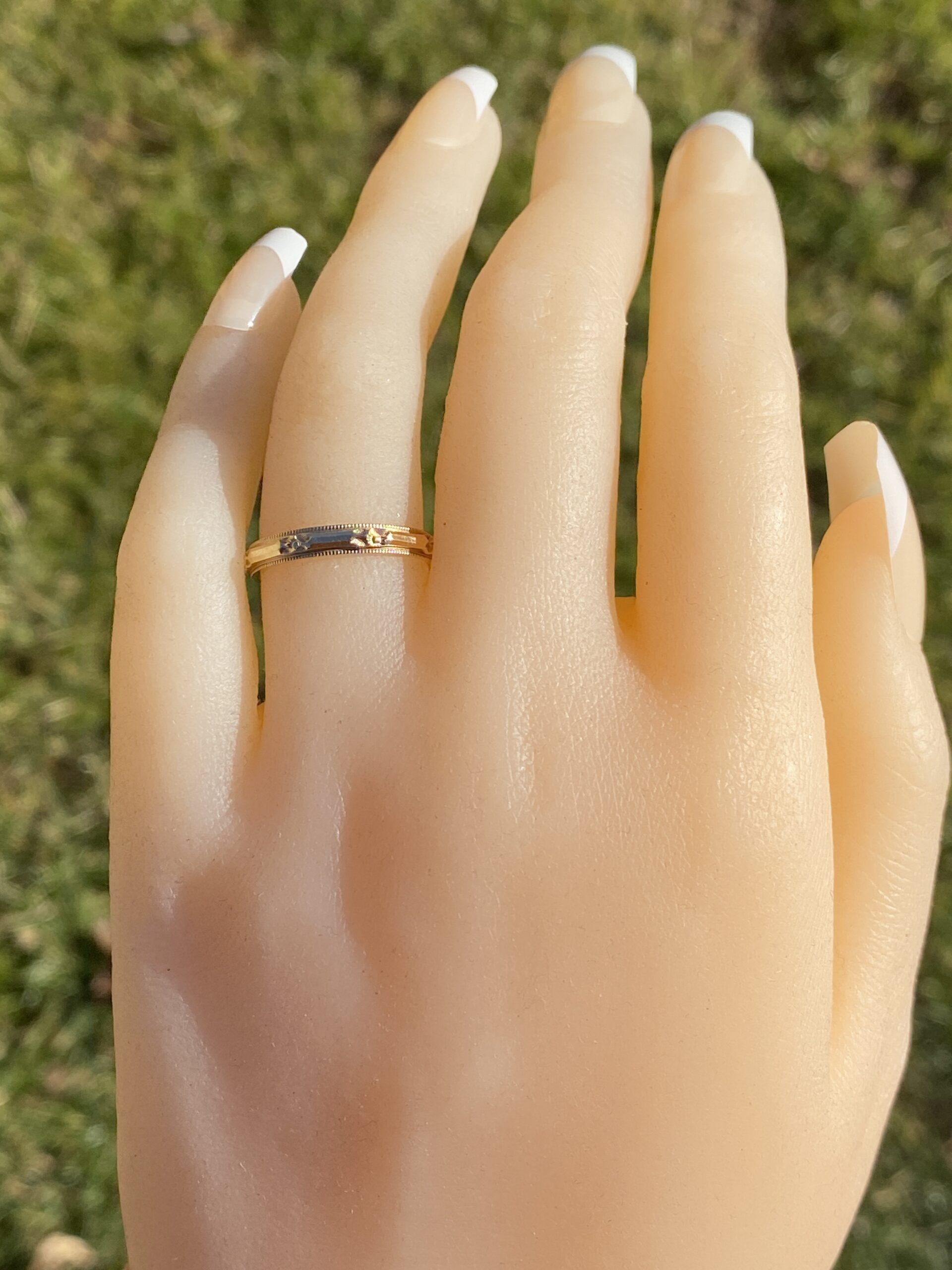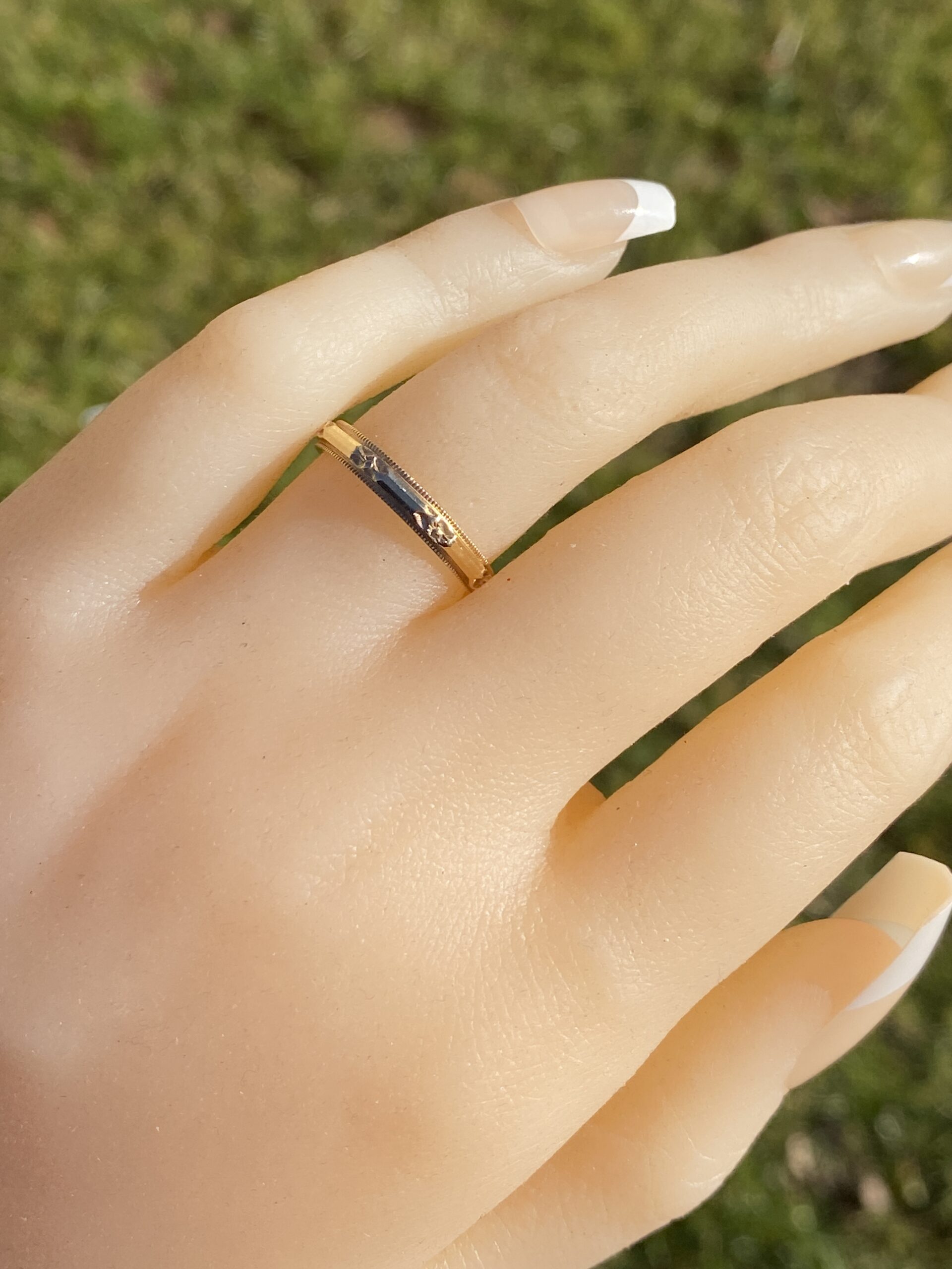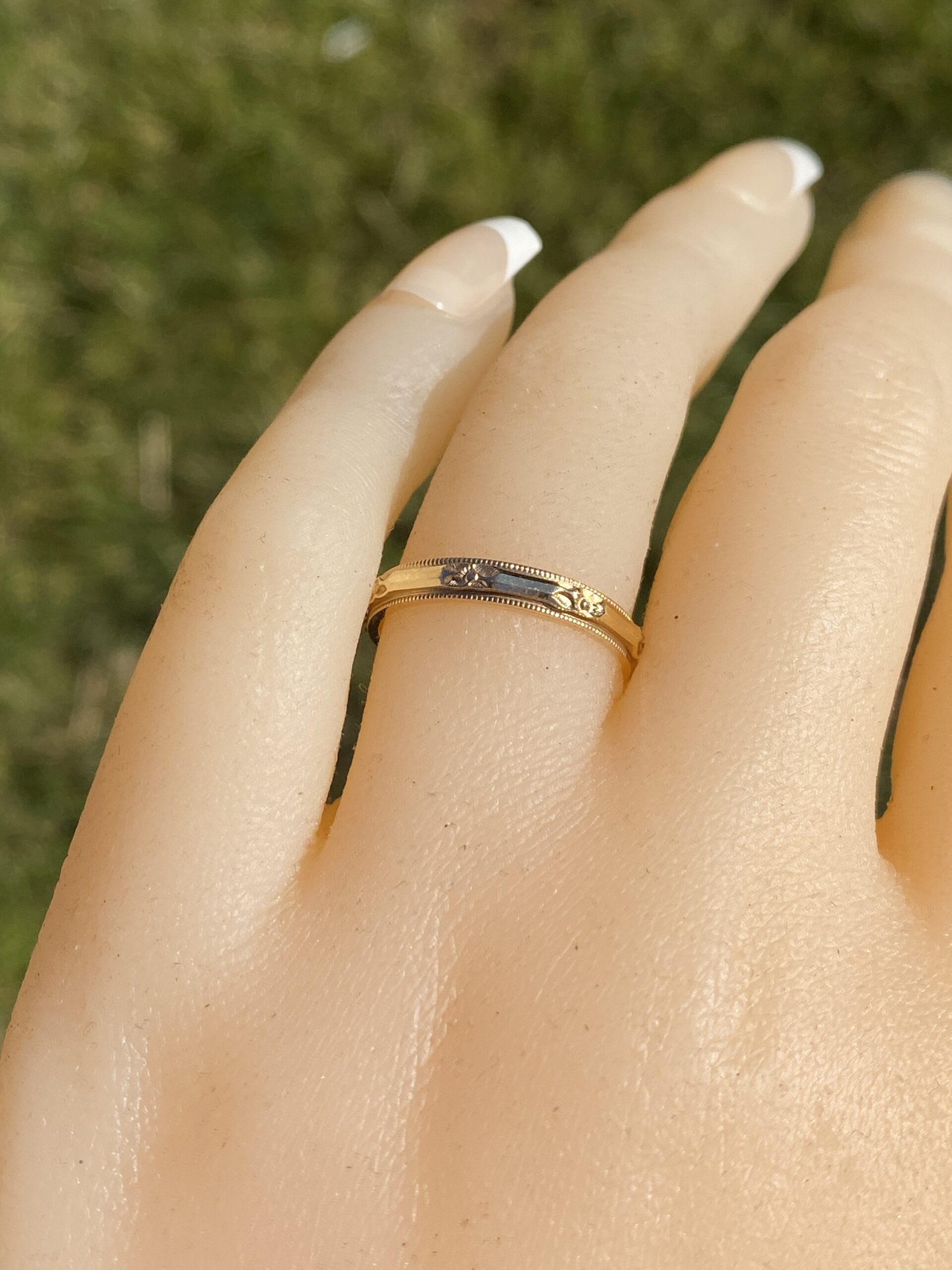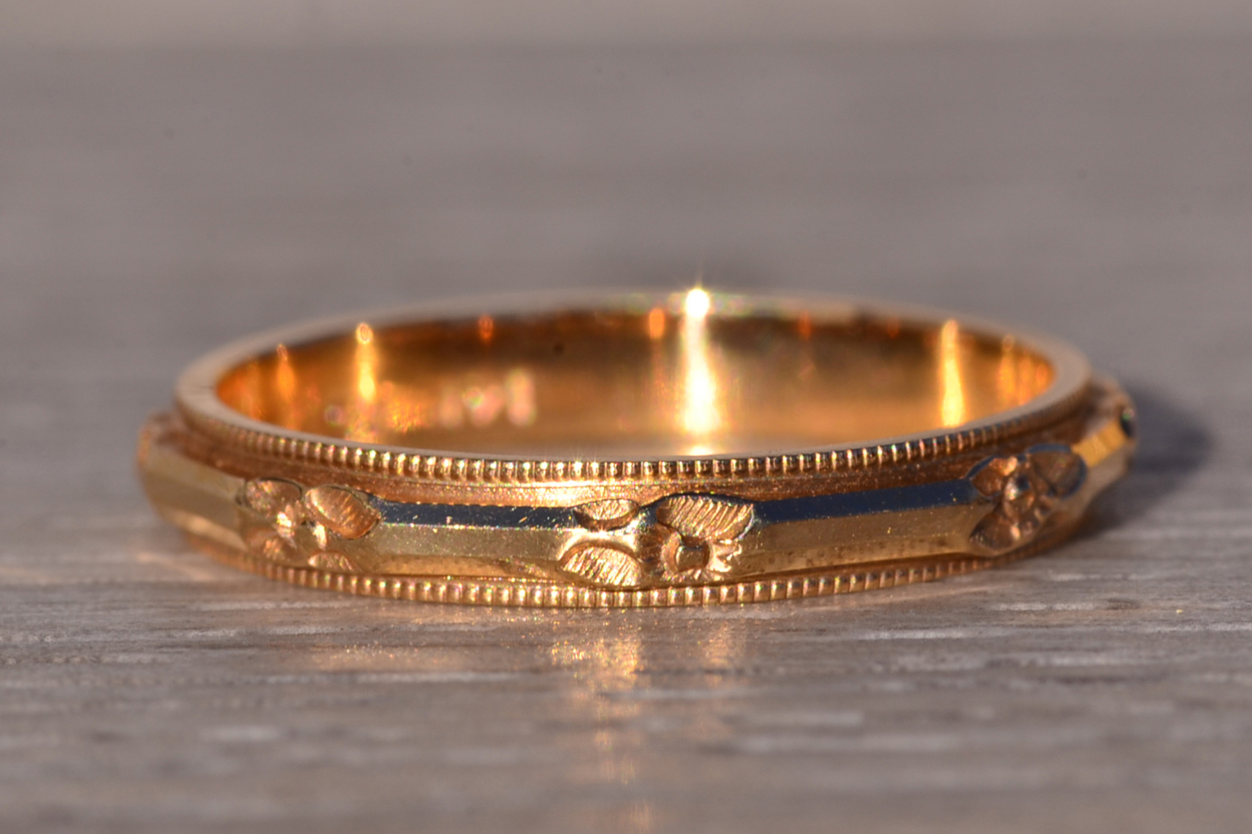 Classic Tapered Baguette Semi Mount in White and Yellow Gold. This exquisite new old stock antique wedding band showcases delicate floral stations nestled between a polished dome center, exuding vintage charm and elegance. The outer edge is meticulously adorned with fine milgrain detailing, adding a touch of refinement to the design. Crafted in lustrous 14 karat yellow gold, the band is currently sized at 5.75, waiting to adorn the finger of its new owner with its timeless allure.