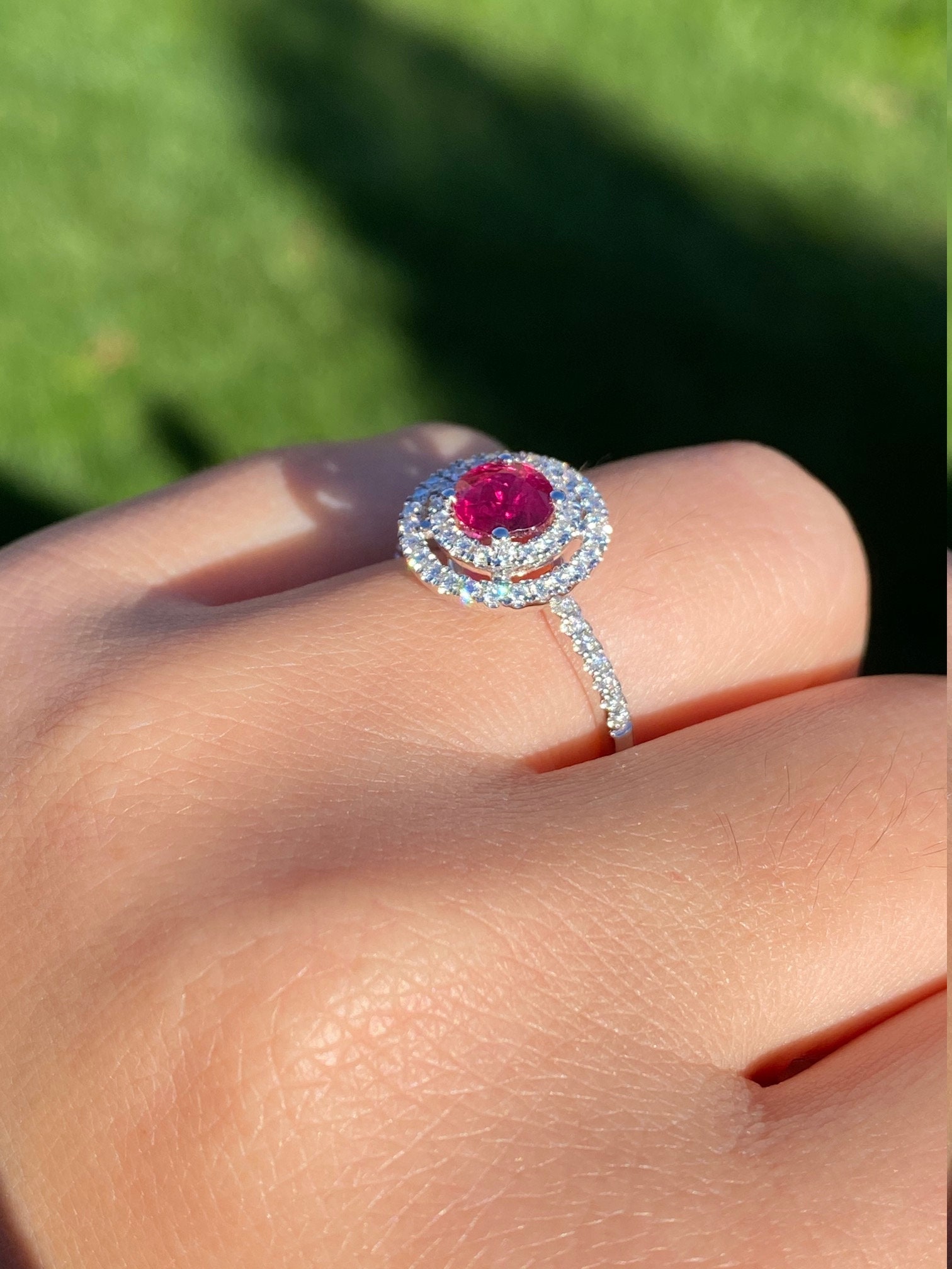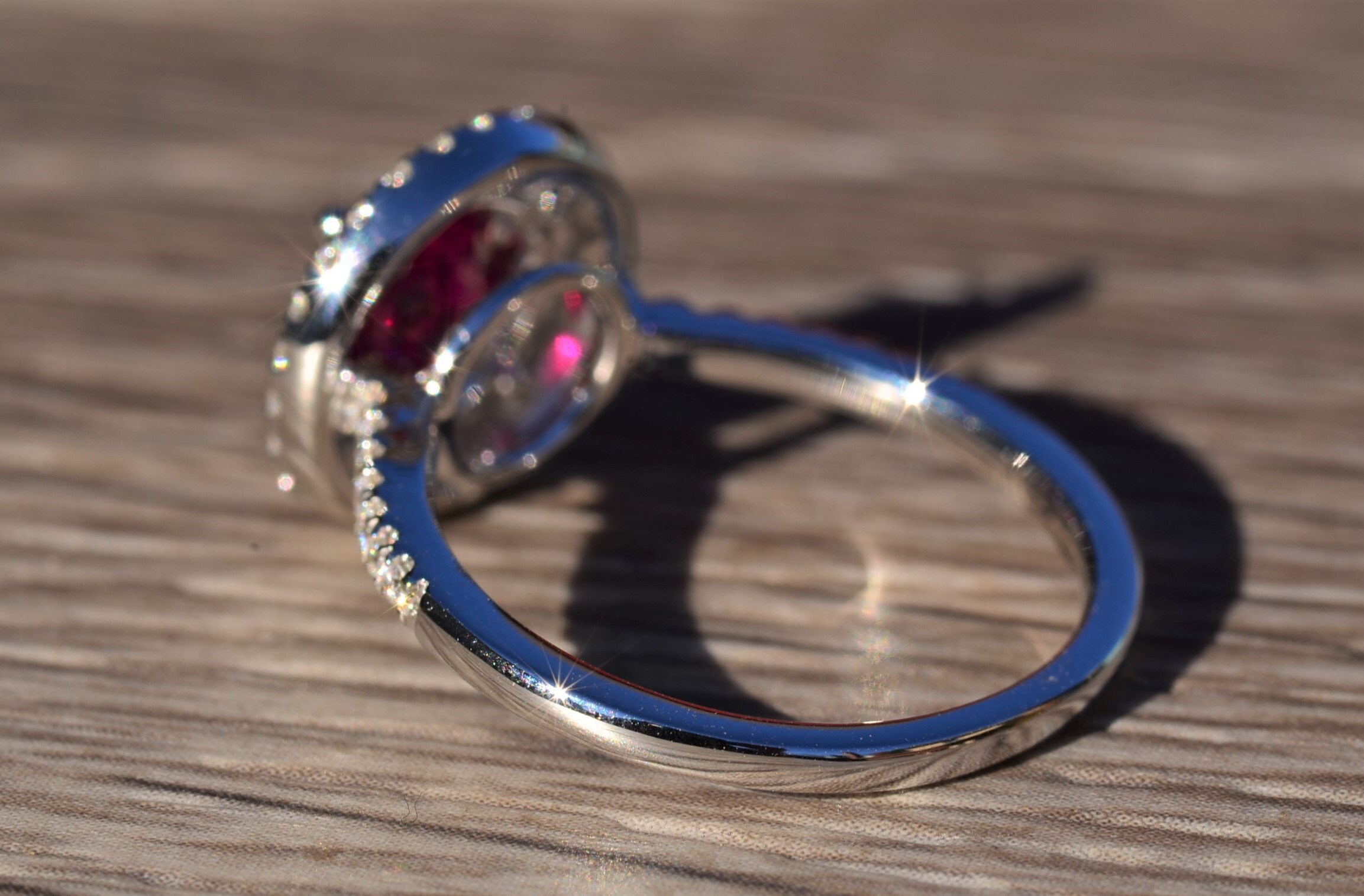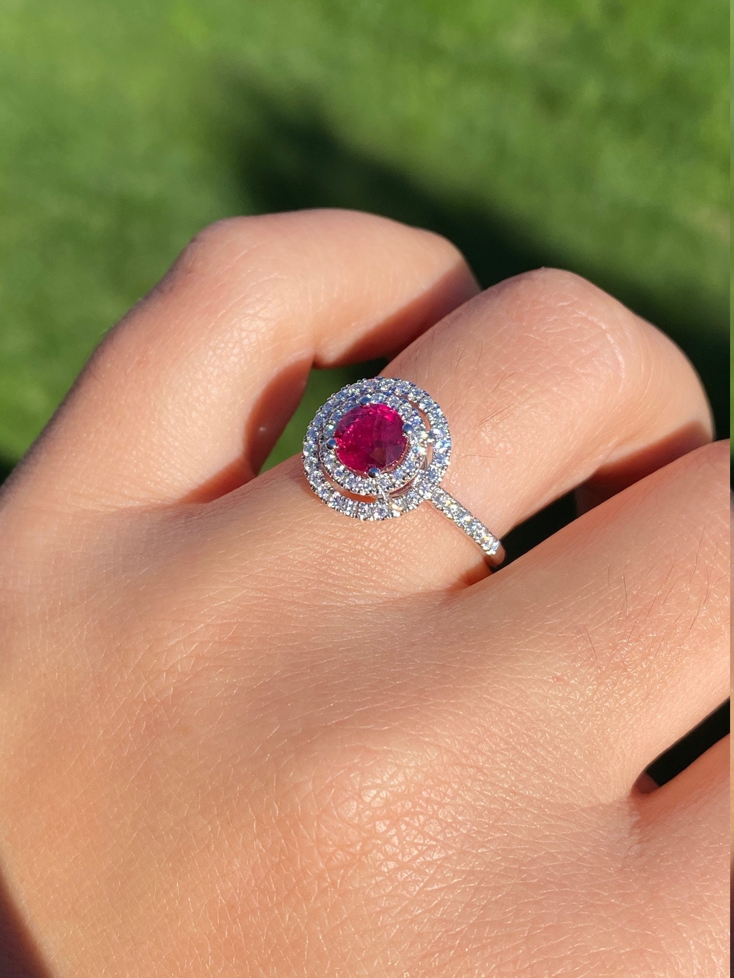 Double Halo Ruby and Diamond Ring in 14 Karat White Gold. This contemporary cocktail ring centers on a 1.05 carat ruby. The ruby is encircled by a double diamond halo with diamonds continuing down either side of the shank. The mounting has 0.58 total carats of diamonds. This modern ring is a finger size 6 3/4, yet can be adjusted to any size.