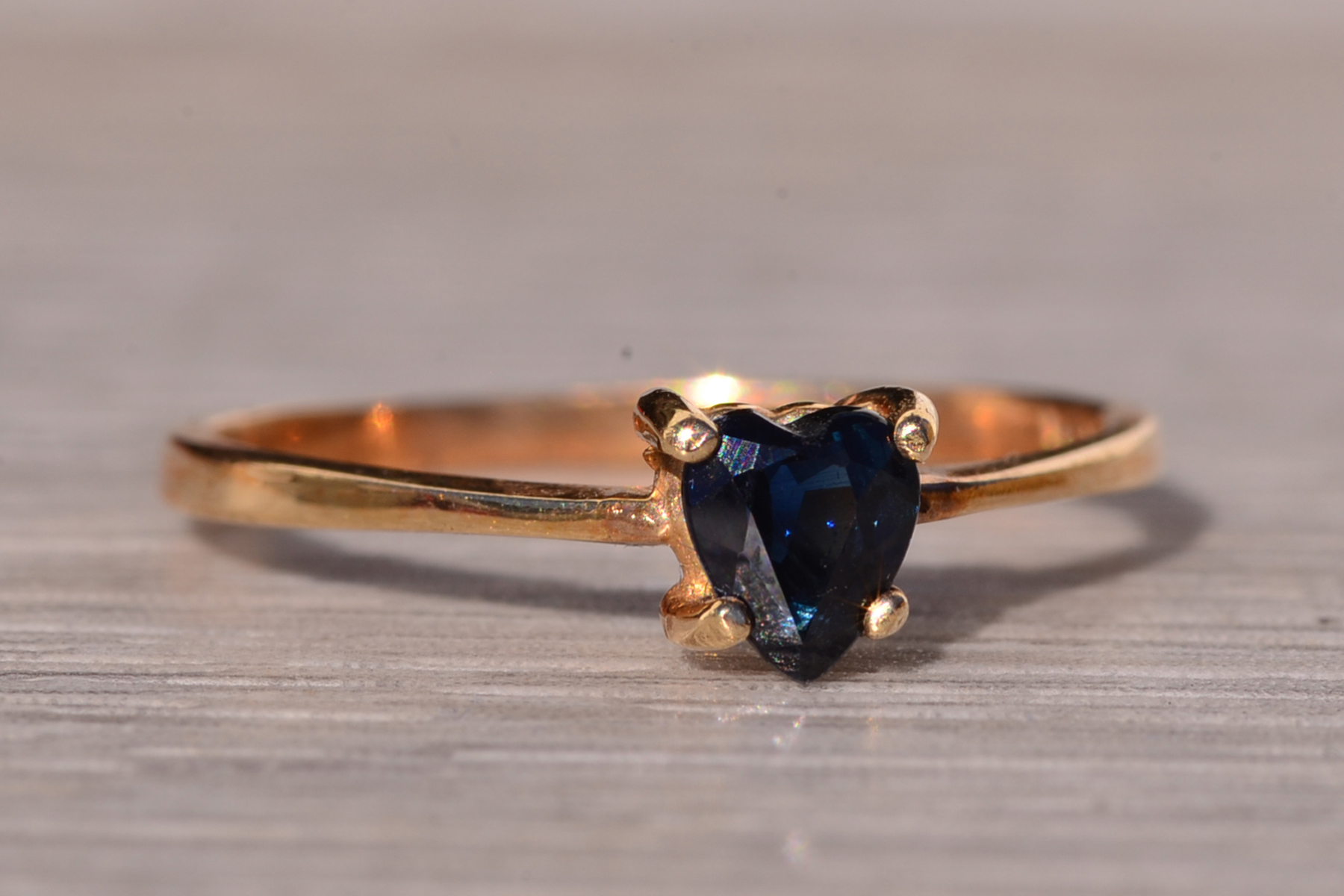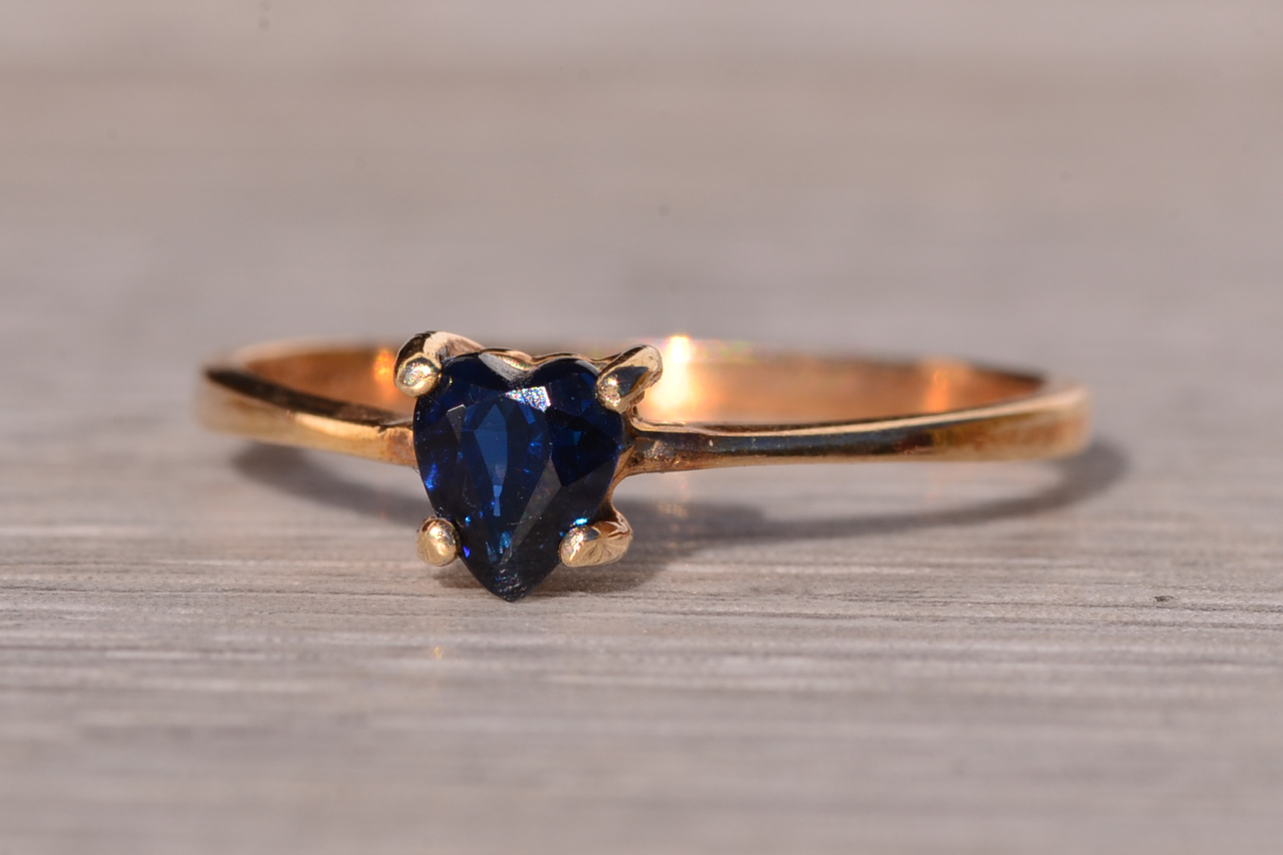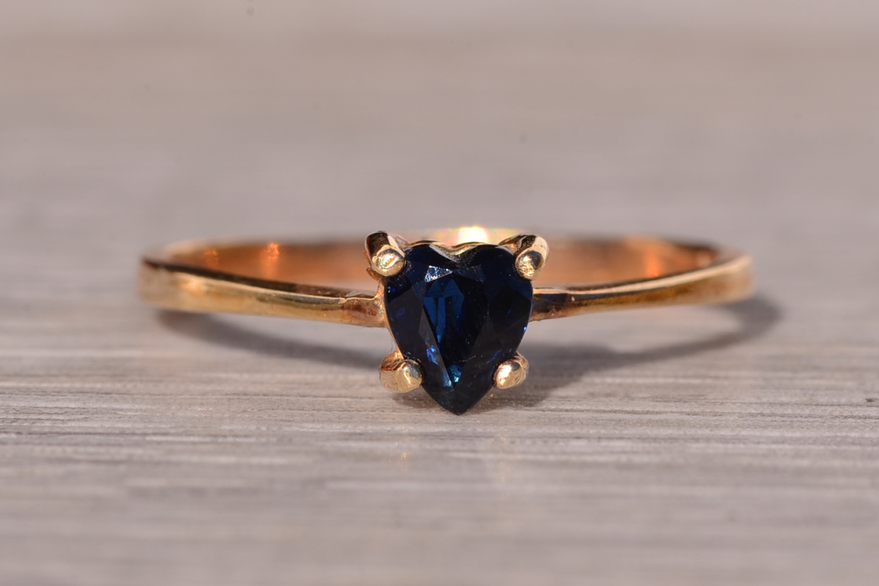 The Titanic: Natural Blue Heart Shaped Sapphire Ring in Yellow Gold. This simple ring centers on a midnight blue natural sapphire with an approximate weight by measurement of 0.28 carats. The ring is finished with a tapered shank to complete the look. The ring is crafted in yellow gold and is currently a finger size 6 yet can be adjusted to any finger size for an additional charge on request.