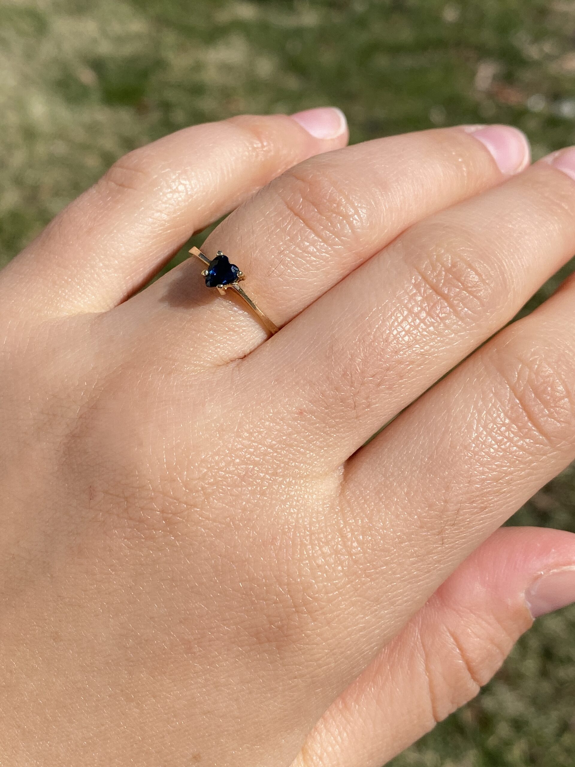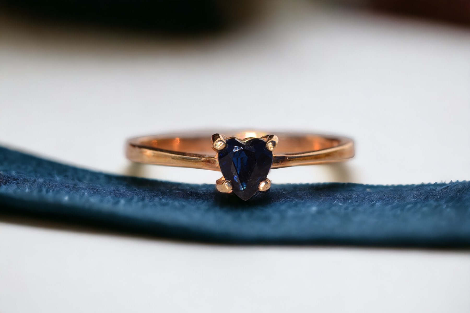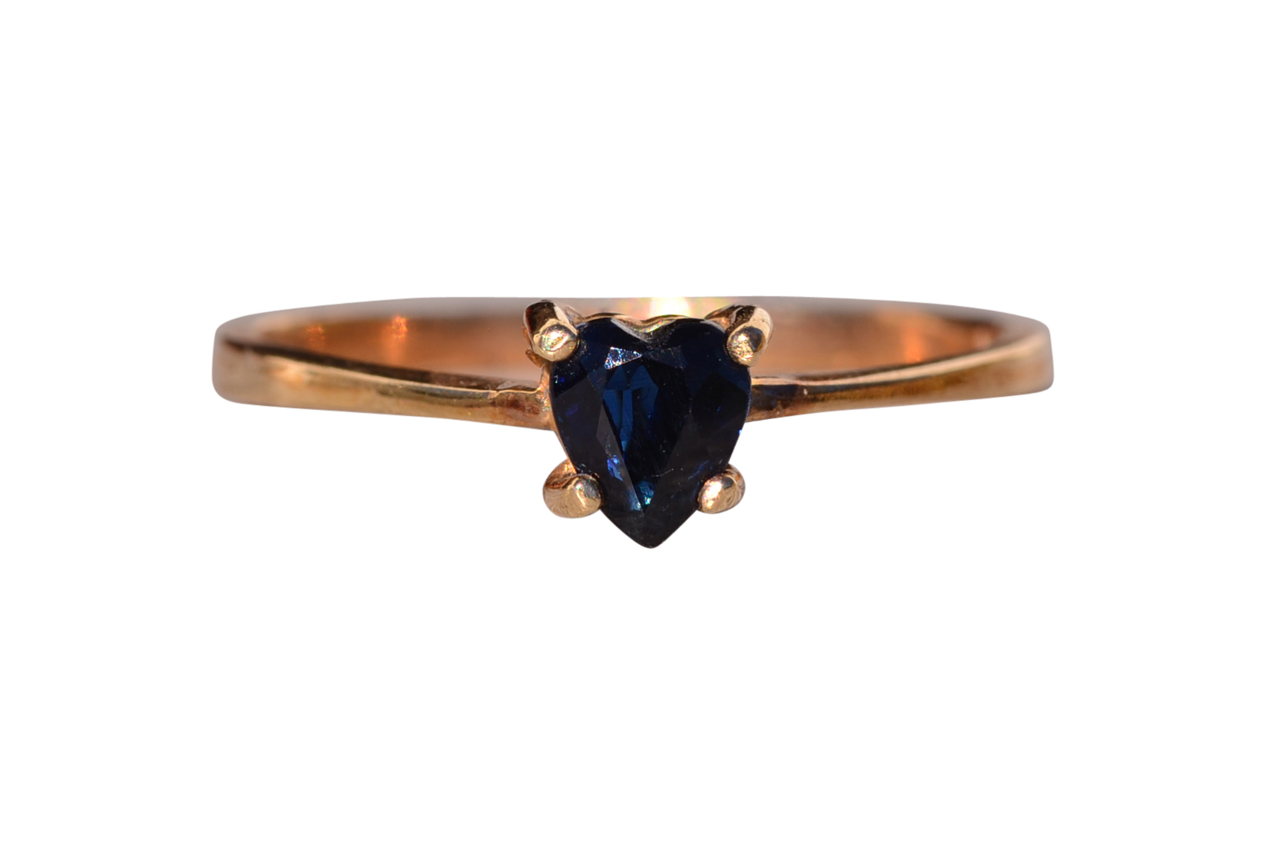 The Titanic: Natural Blue Heart Shaped Sapphire Ring in Yellow Gold. This simple ring centers on a midnight blue natural sapphire with an approximate weight by measurement of 0.28 carats. The ring is finished with a tapered shank to complete the look. The ring is crafted in yellow gold and is currently a finger size 6 yet can be adjusted to any finger size for an additional charge on request.