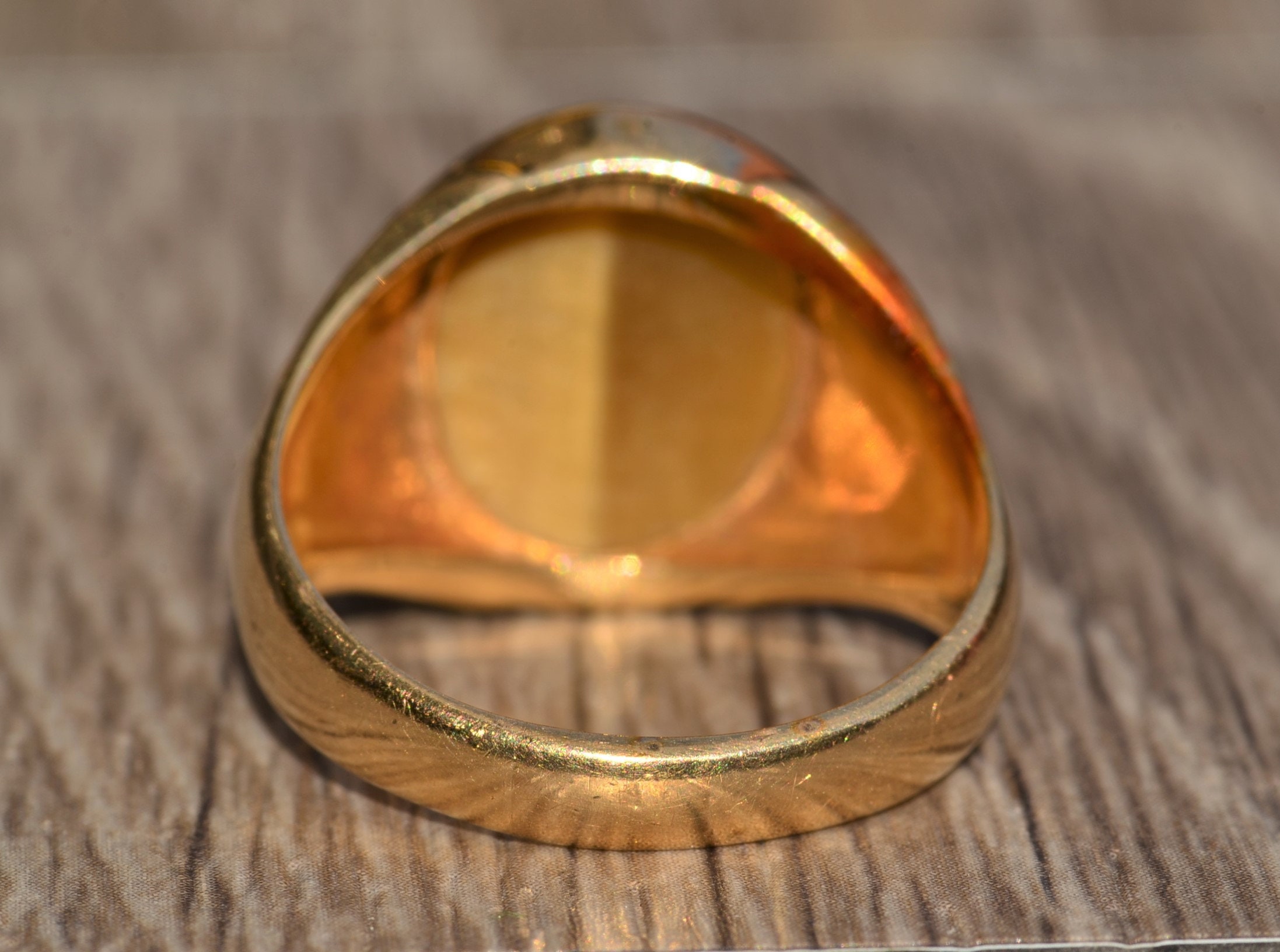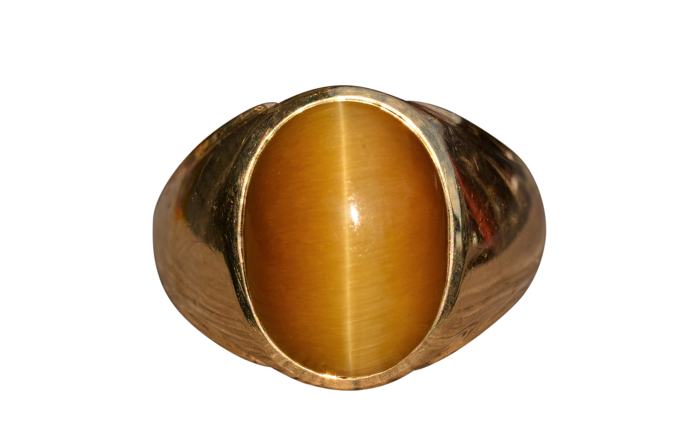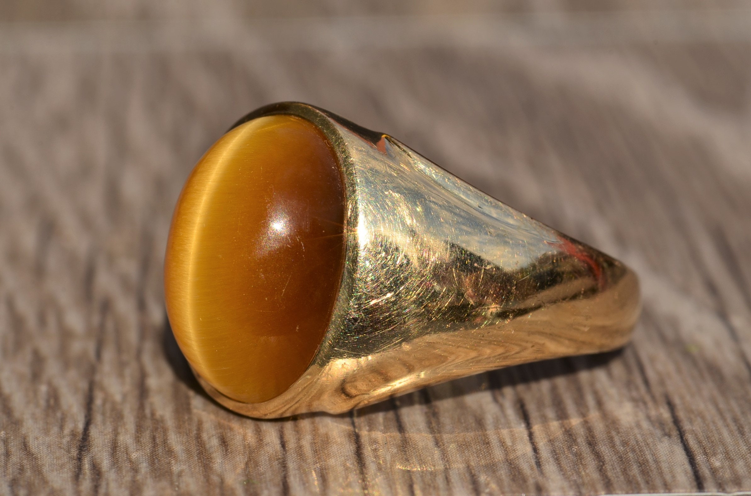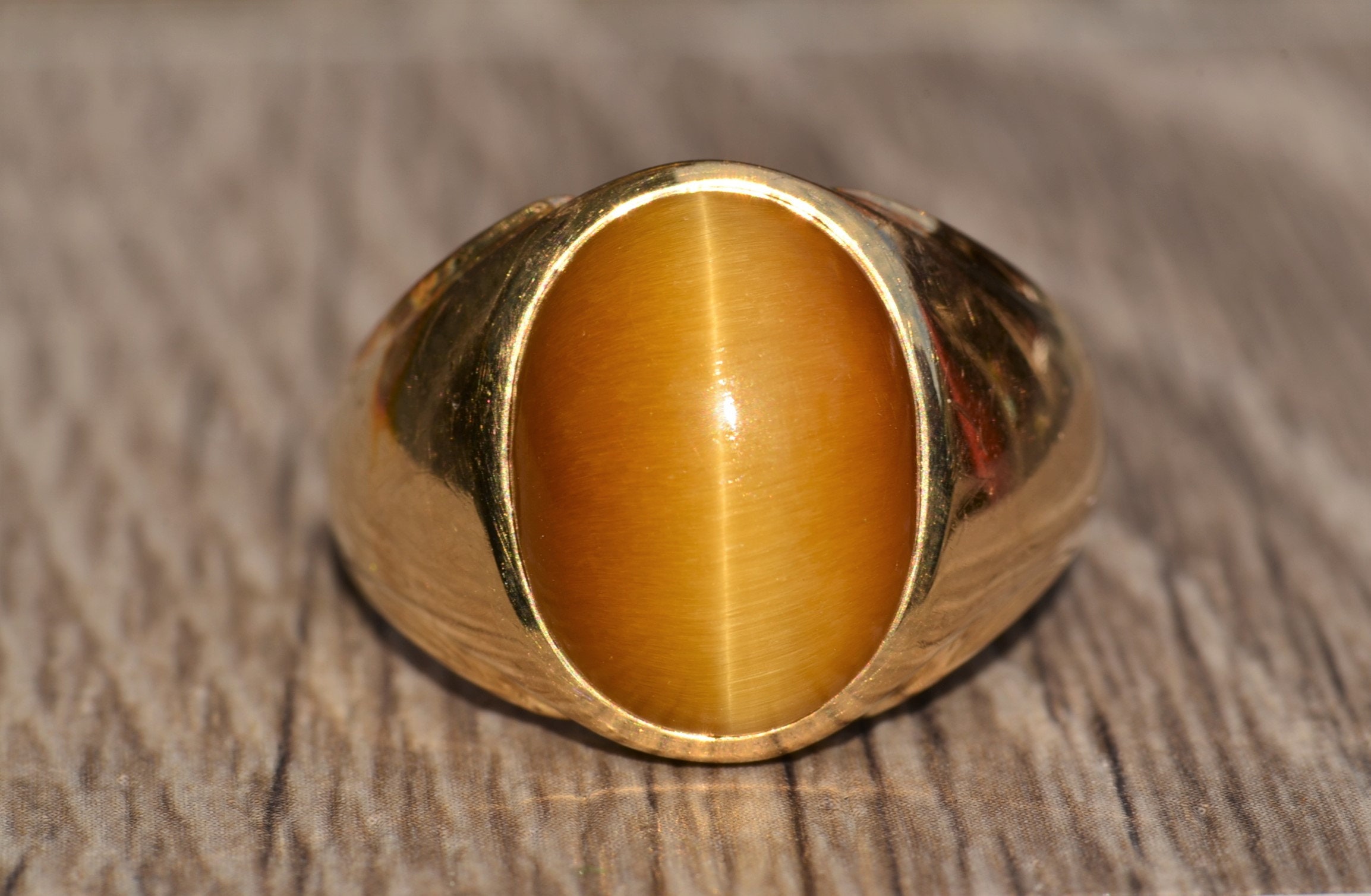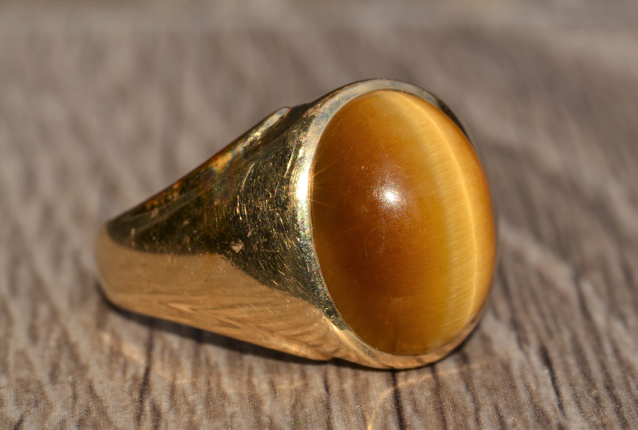Men’s Vintage Signed Baden and Foss Tiger’s Eye Cocktail Ring. Crafted in 14 karat yellow gold, this ring centers on a cabochon tiger’s eye center stone with perfect straight alignment and the original milk and honey effect. This ring was created by Baden and Foss Inc. from New York, New York in the mid 1960’s. Currently a finger size 12, this ring can be resized if needed.