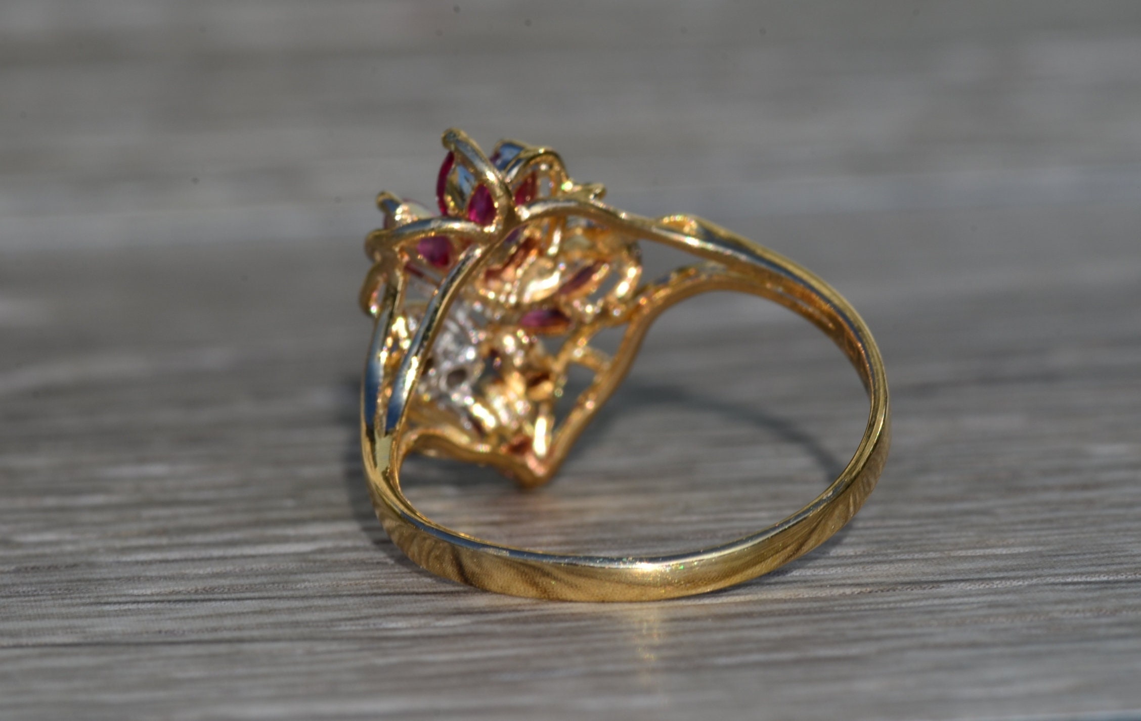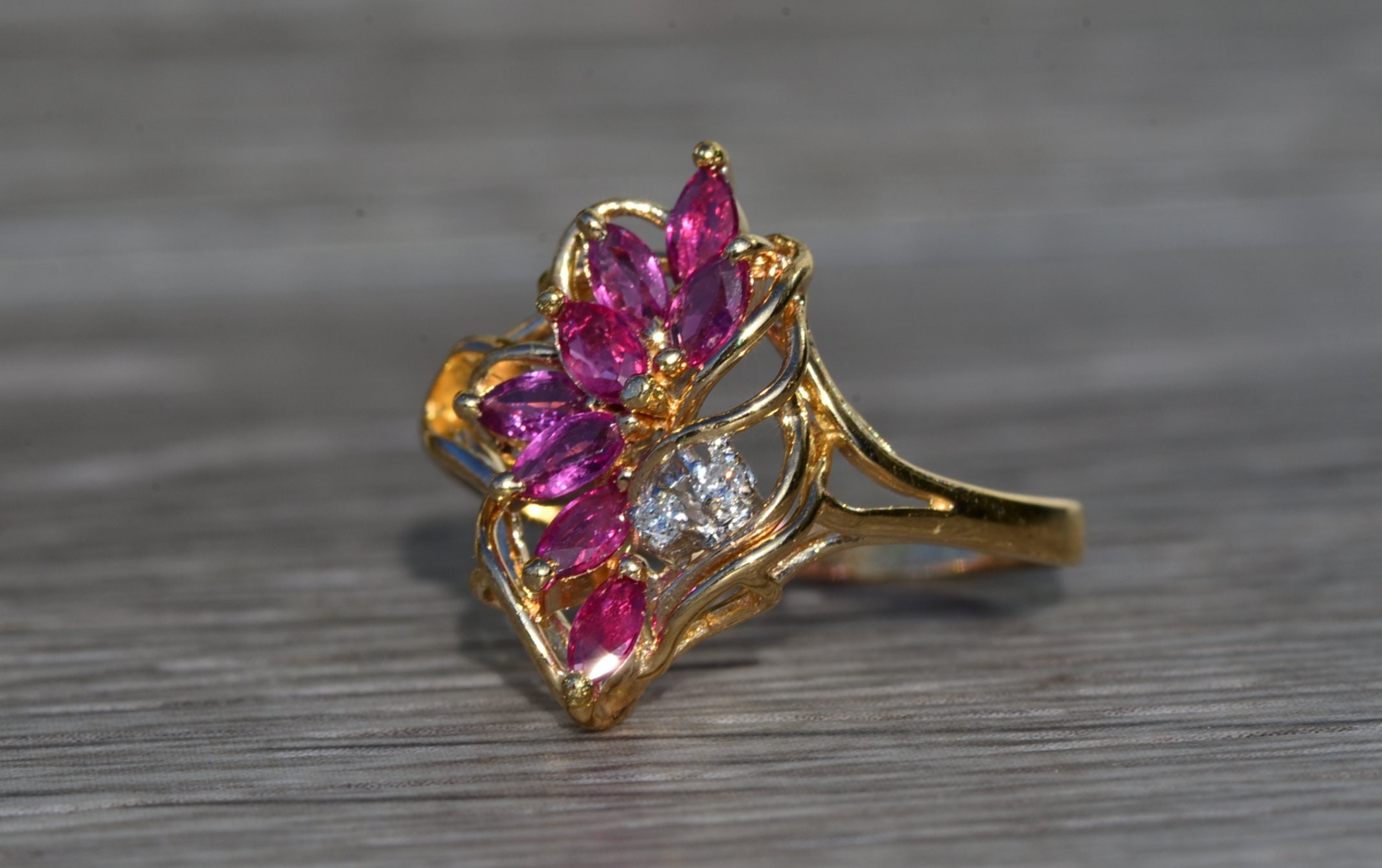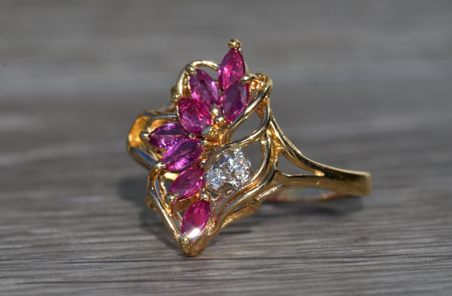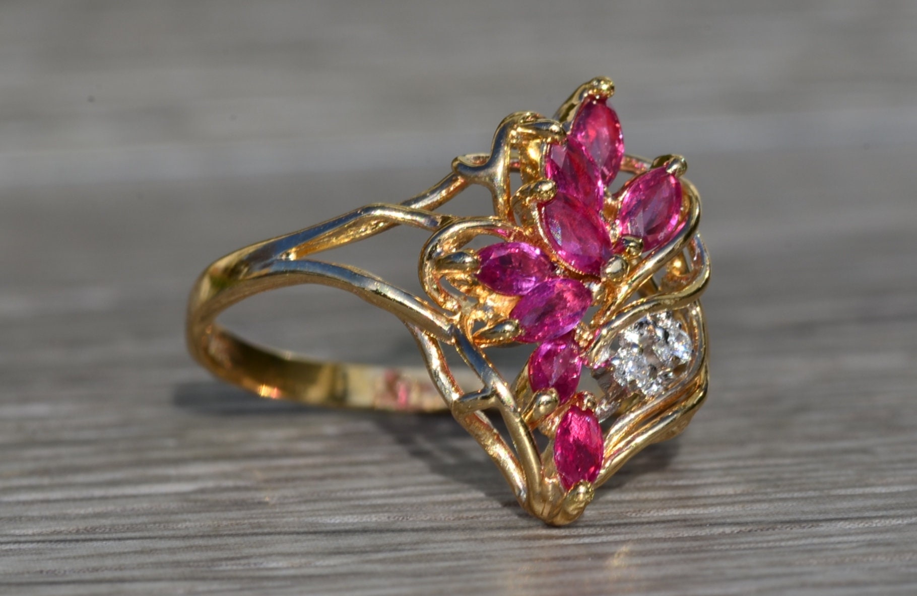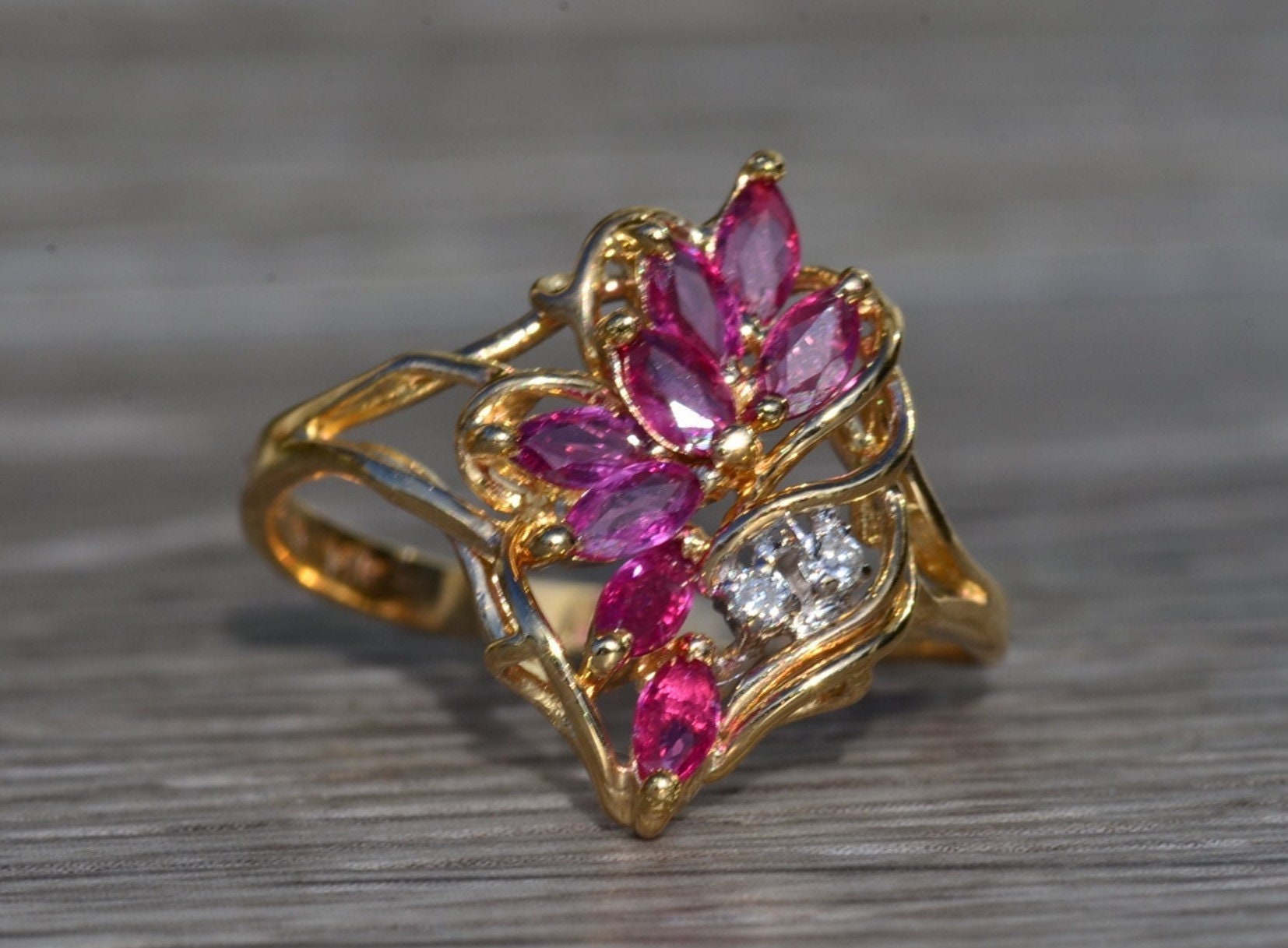 The Tuscumbia: Ladies 14K Gold Ring set with Rubies and Diamonds. Crafted in 14 karat yellow gold, this ladies cocktail ring features a cluster of navette shaped rubies accented by two round diamonds. The ring is stamped with a serial number on the inner band. Currently a finger size 7.25, this ring can be resized for an additional charge.
