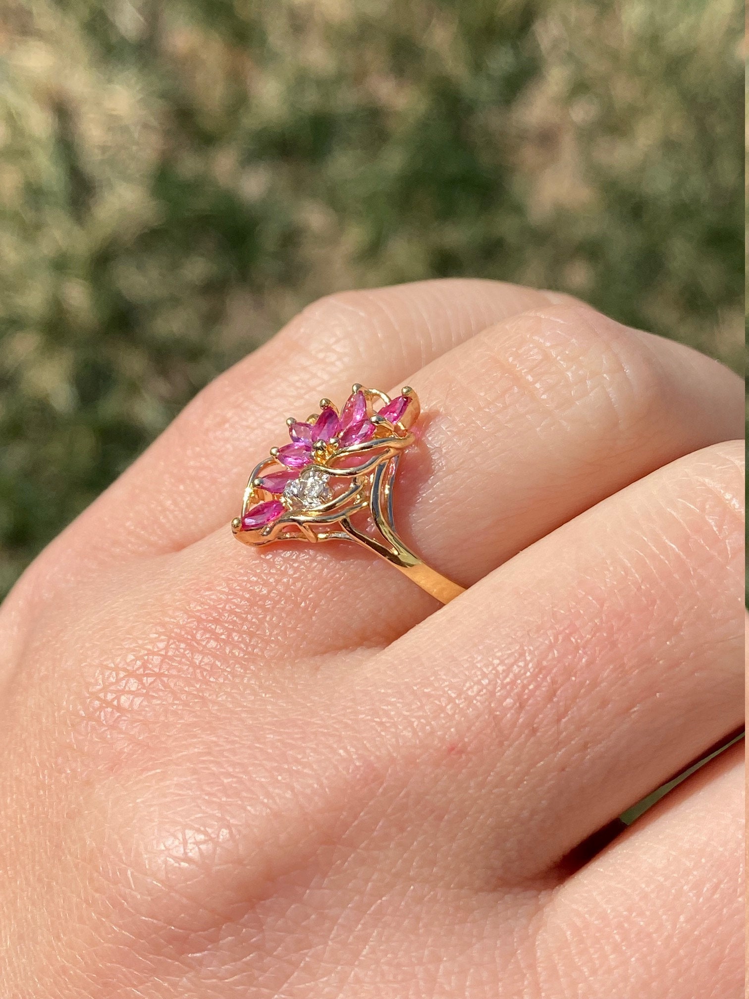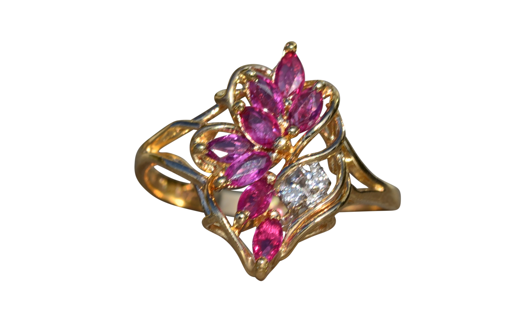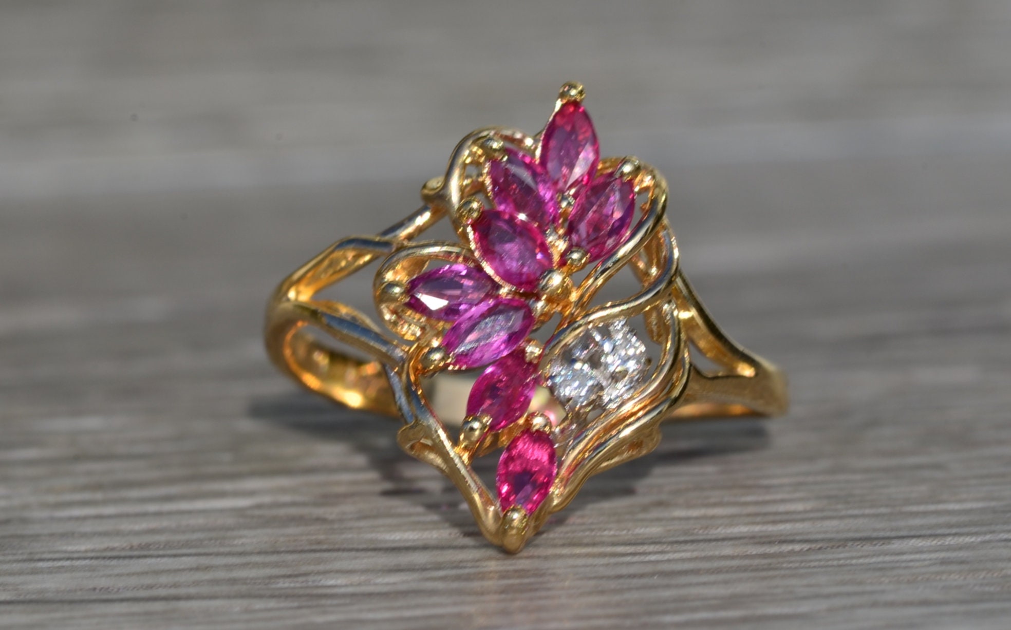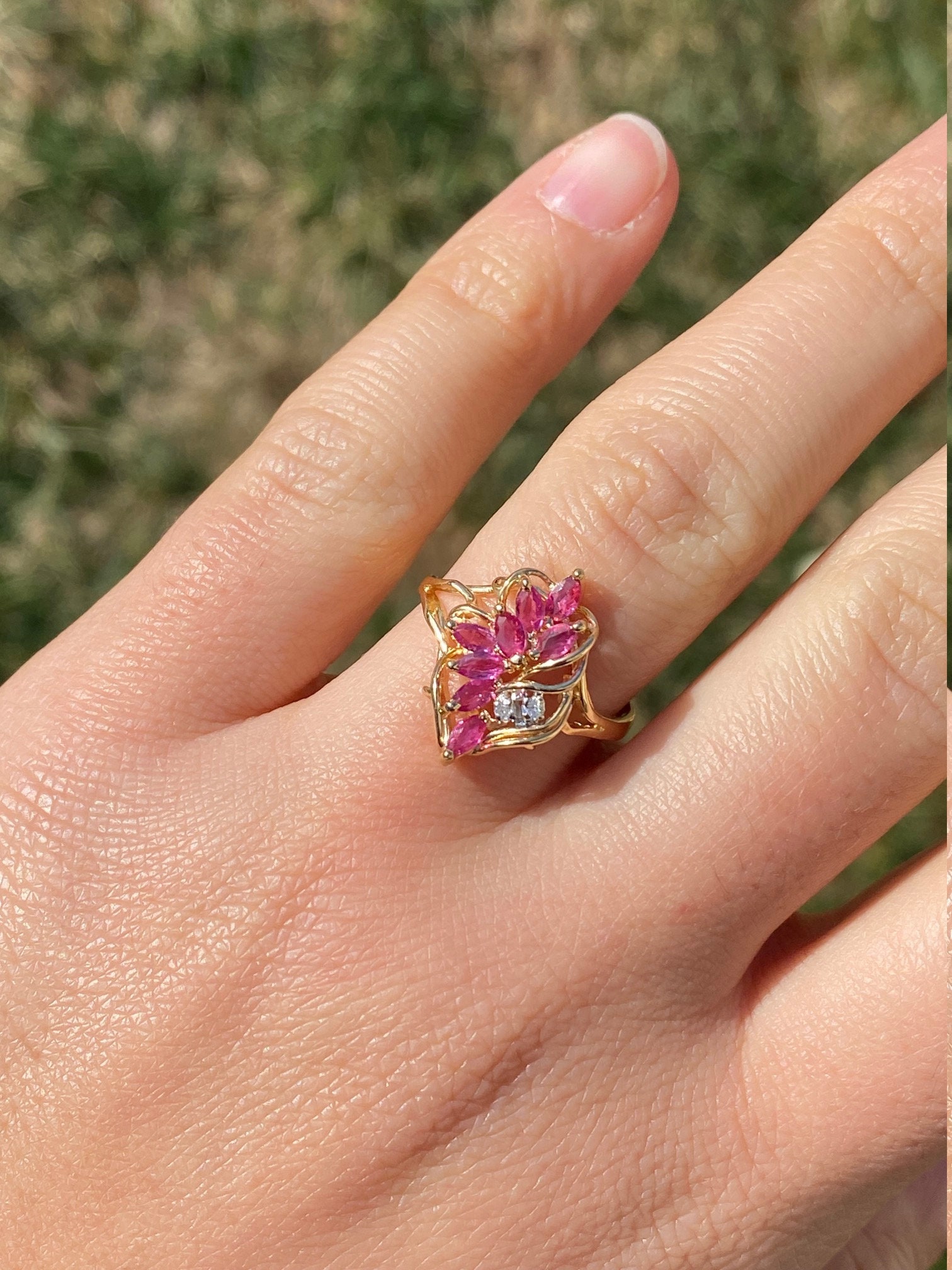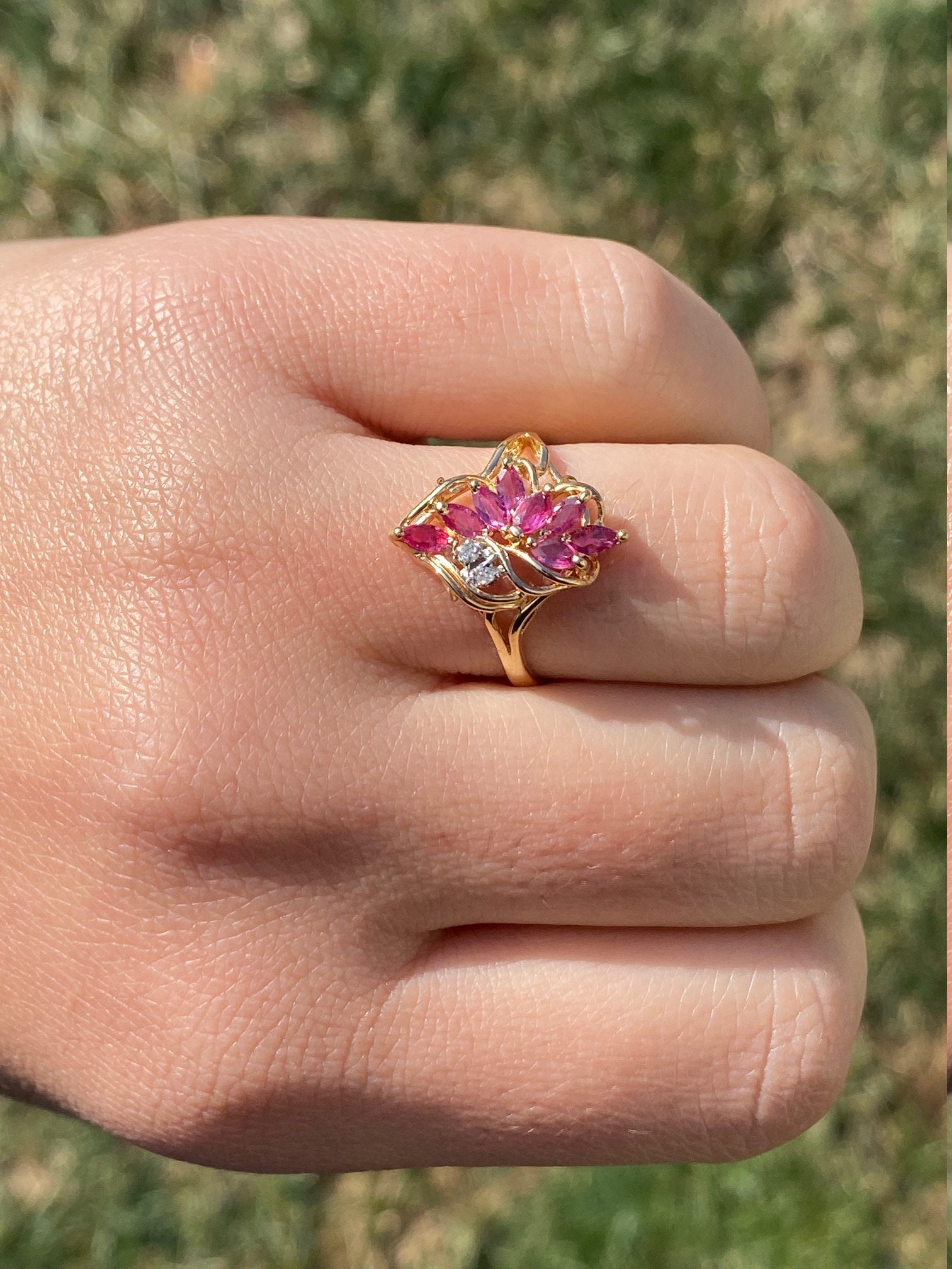 The Tuscumbia: Ladies 14K Gold Ring set with Rubies and Diamonds. Crafted in 14 karat yellow gold, this ladies cocktail ring features a cluster of navette shaped rubies accented by two round diamonds. The ring is stamped with a serial number on the inner band. Currently a finger size 7.25, this ring can be resized for an additional charge.