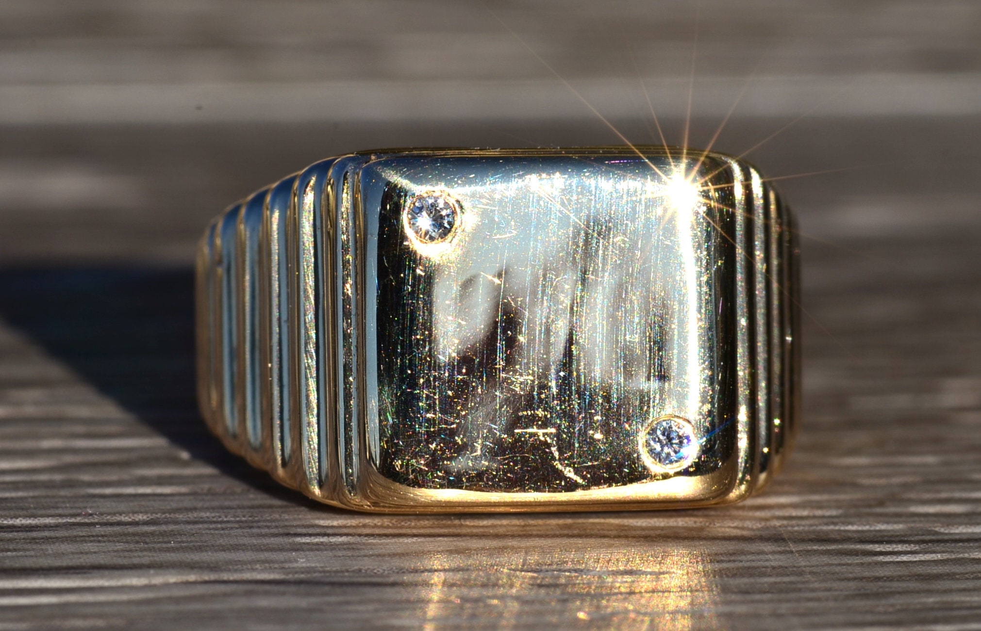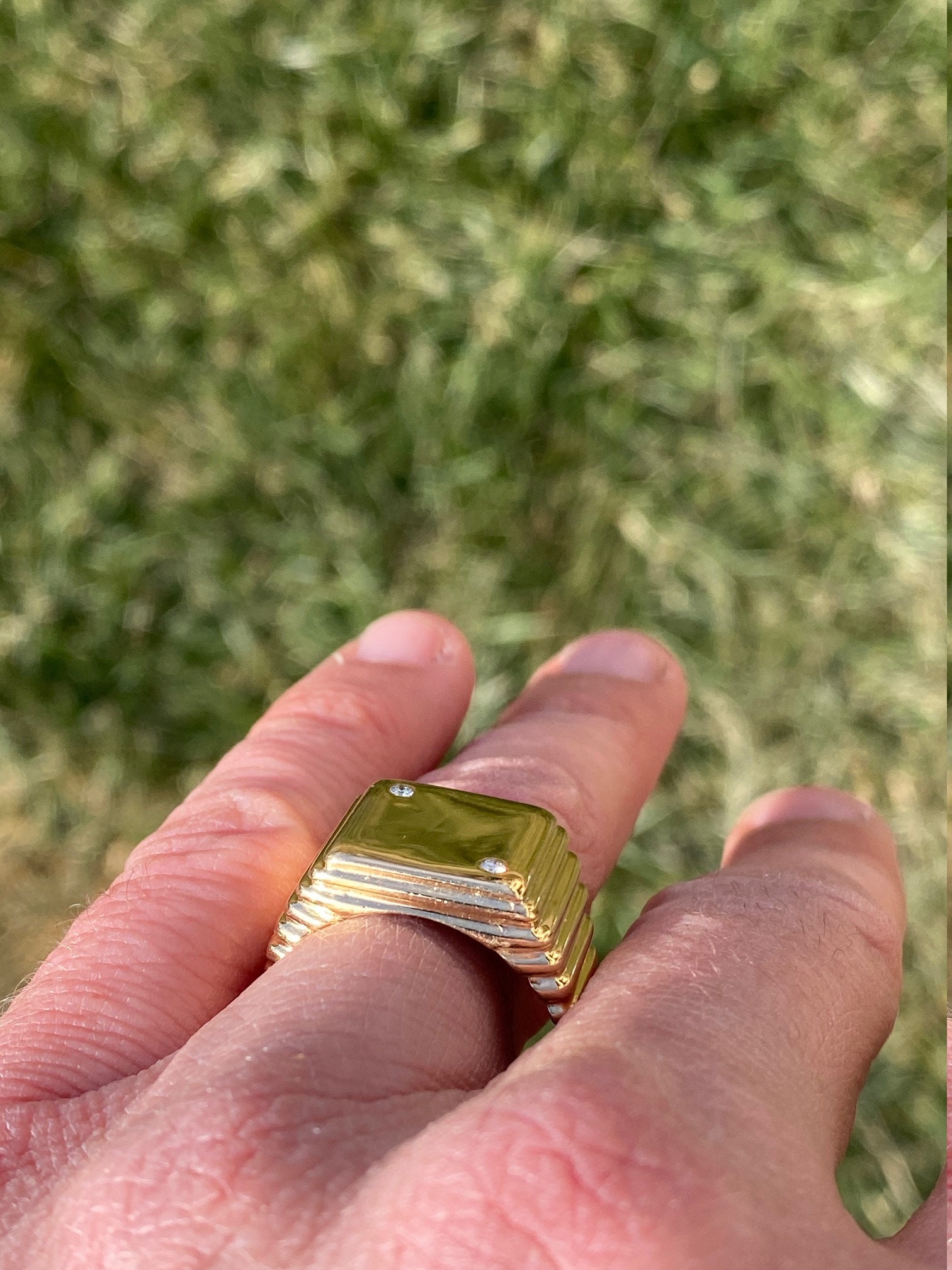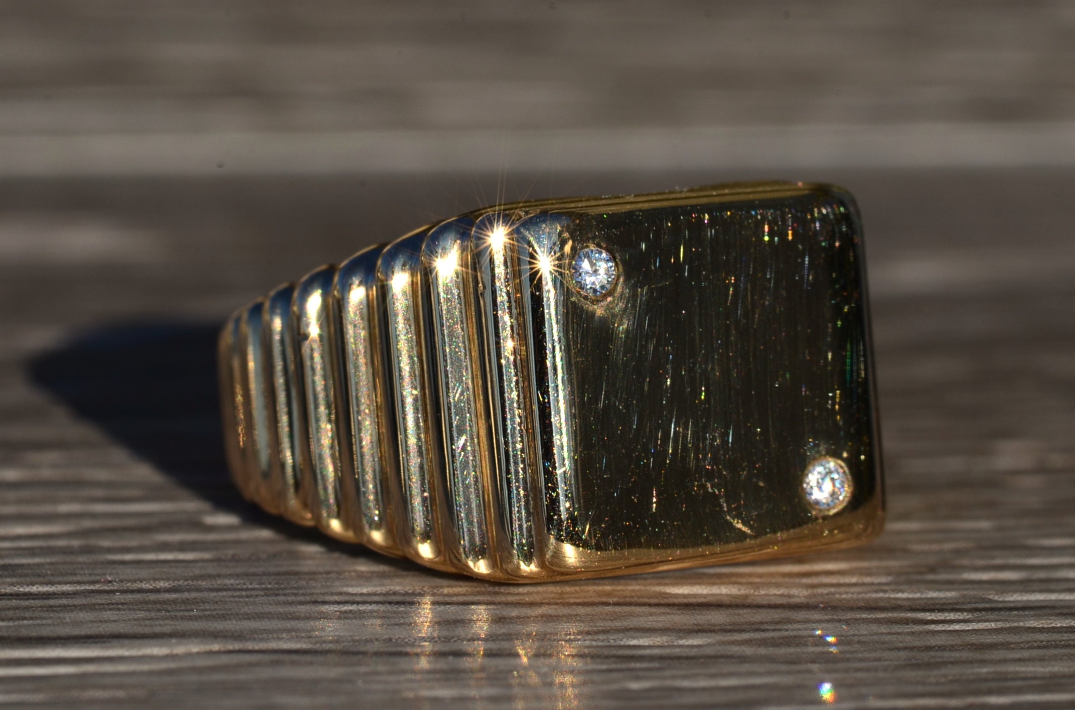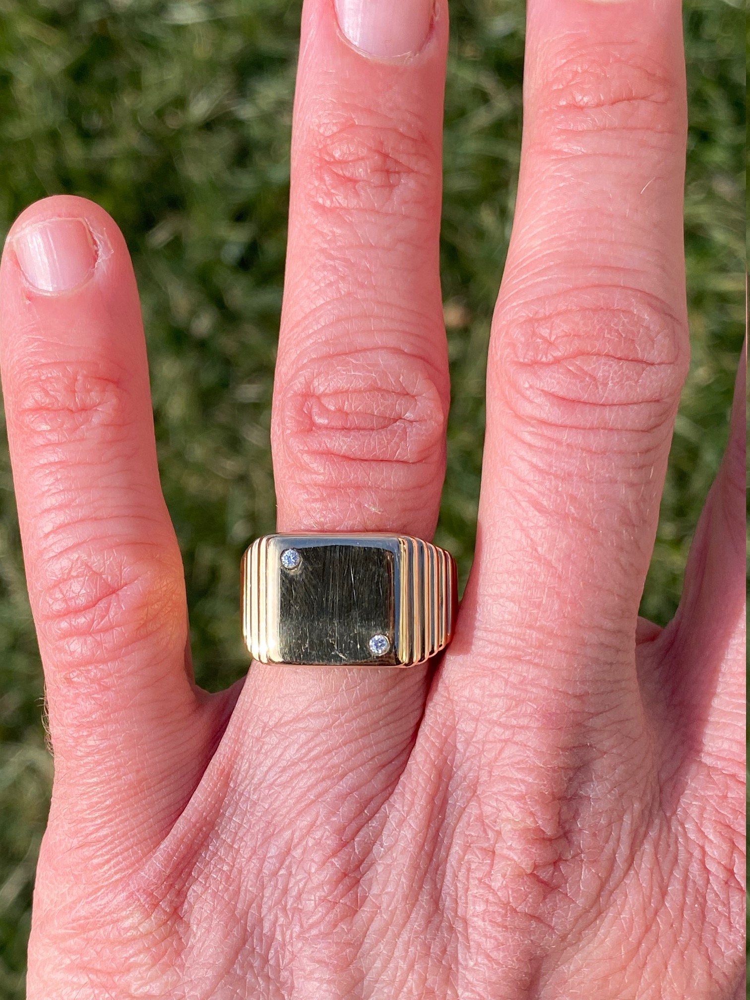 The Vandiver: Gentlemen’s Yellow Gold and Diamond Dice Cocktail Ring. Simple in design, this ring resembles a die set with two accent diamonds. Currently a finger size 9.75, this ring can be resized for an additional charge.