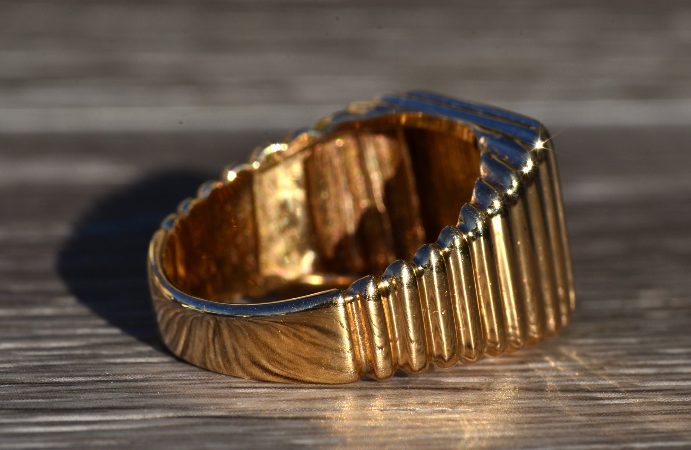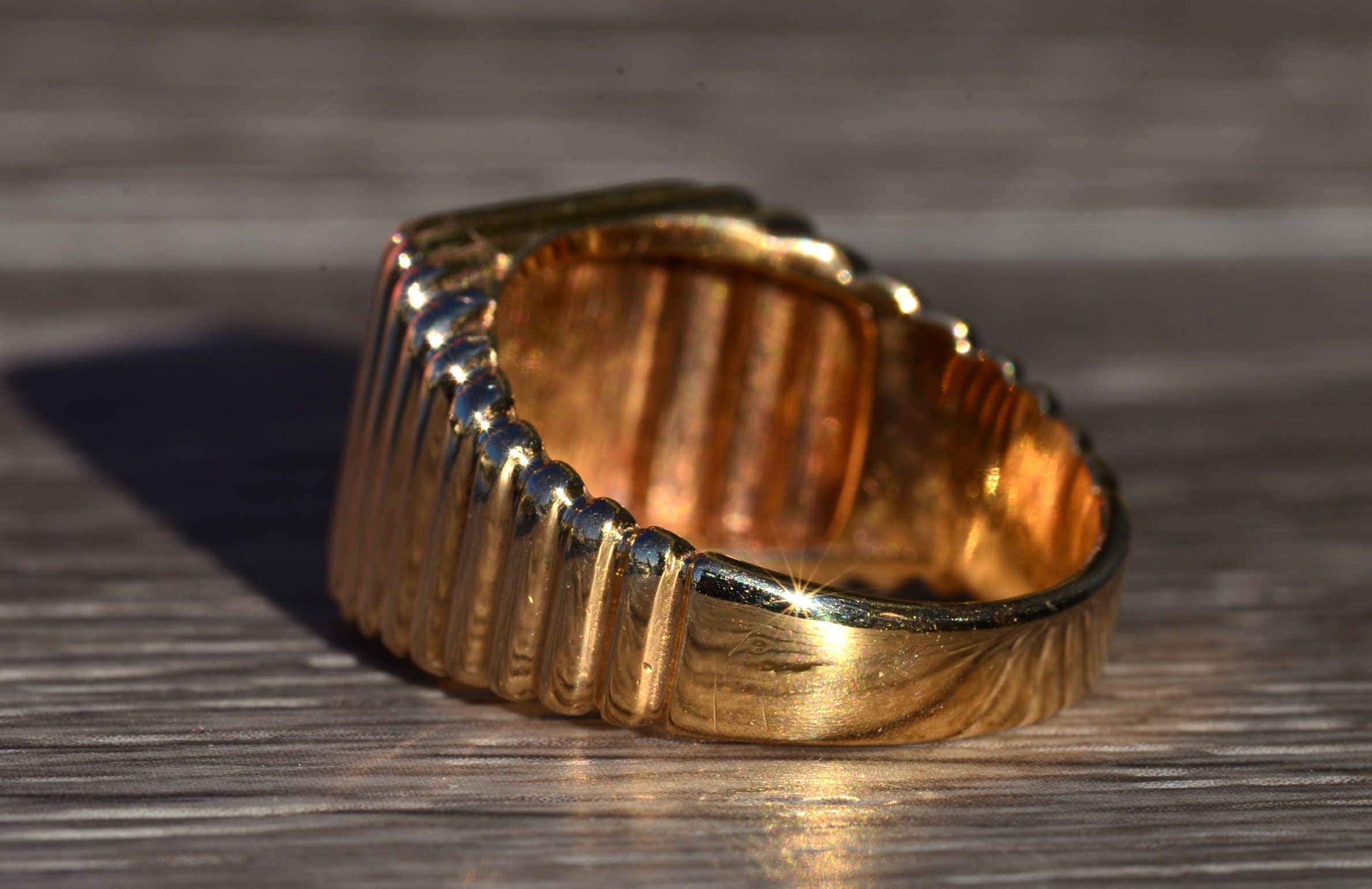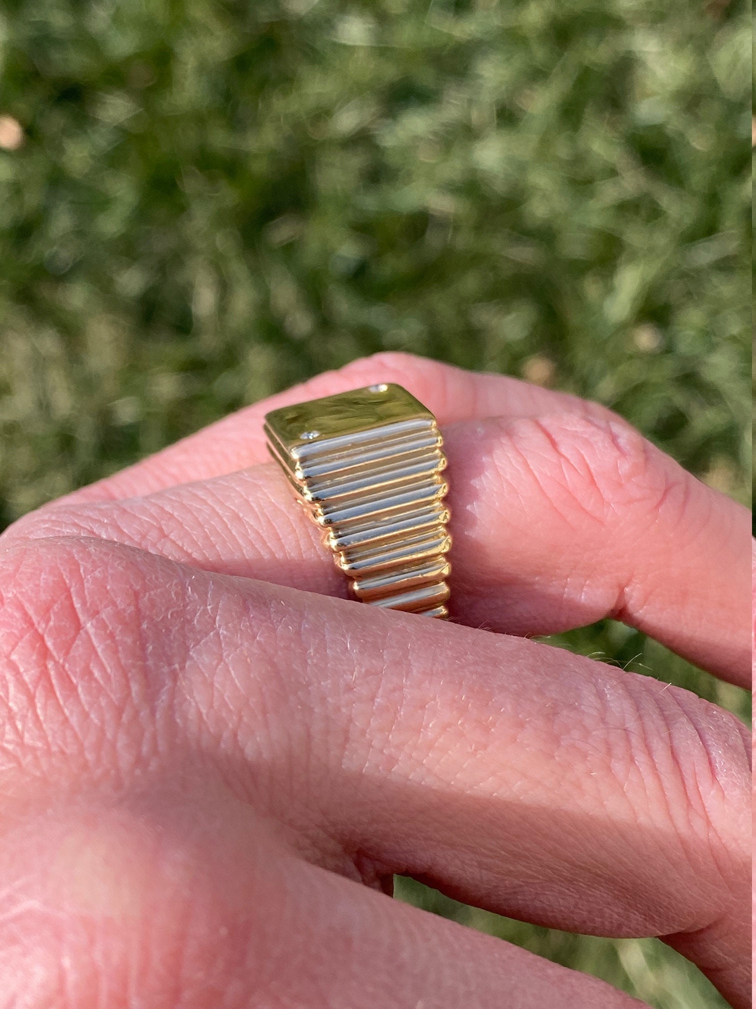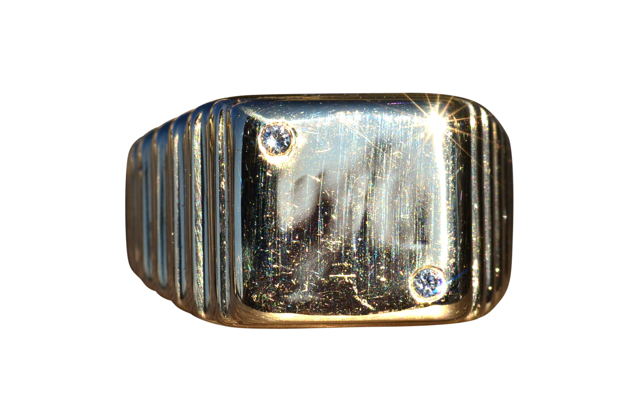 The Vandiver: Gentlemen’s Yellow Gold and Diamond Dice Cocktail Ring. Simple in design, this ring resembles a die set with two accent diamonds. Currently a finger size 9.75, this ring can be resized for an additional charge.