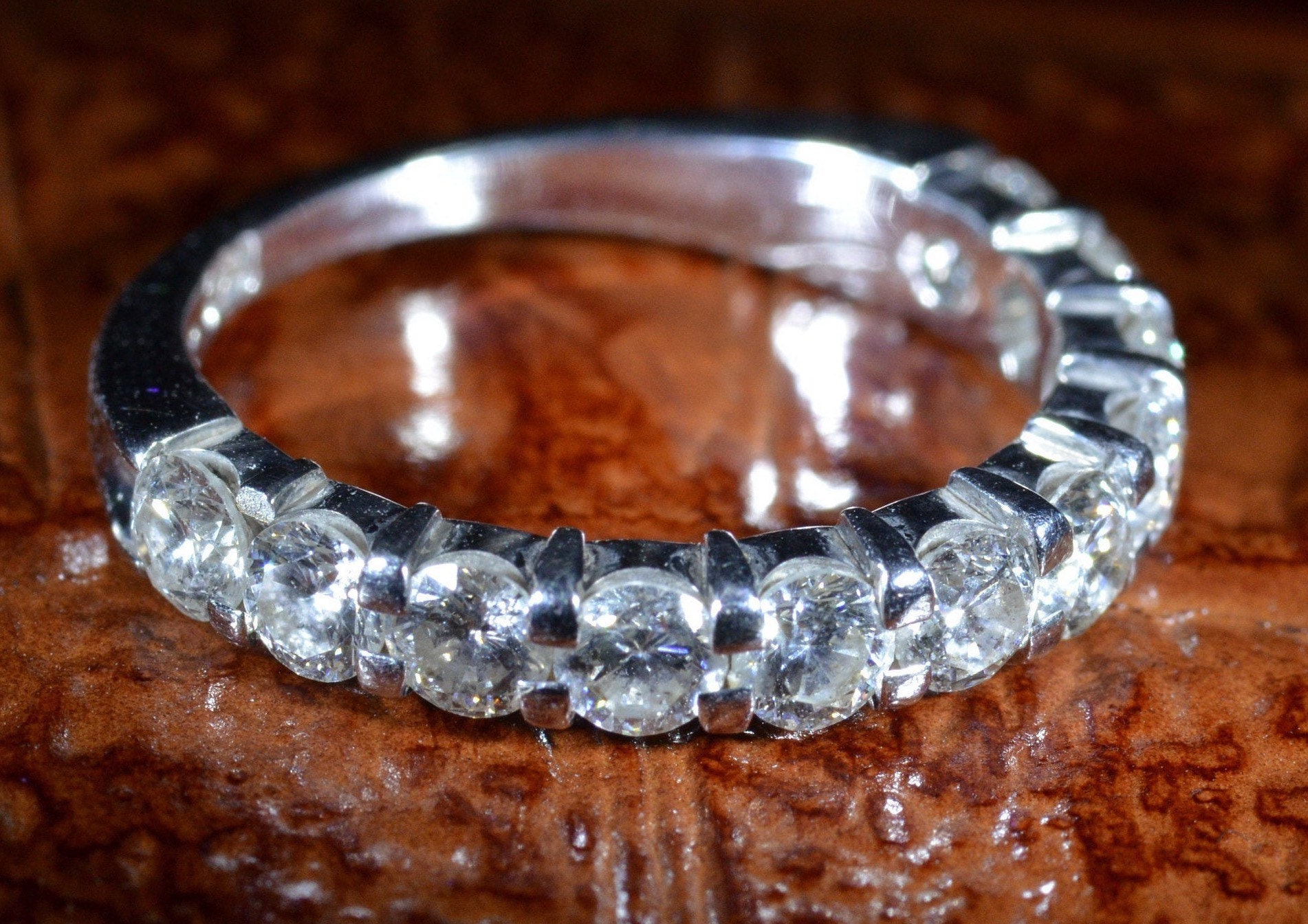 Ladies 14 Karat white gold Shared Prong Band Set with 1.08 Carats Total Weight in Diamonds. The diamonds have an approximate Gemological Institute of America clarity grade ranging from Si1 to Si2 and a color grade of H. The diamonds are set low for comfort of wear. It’s currently a finger size 3 1/2 yet can easily be adjusted to any finger size!