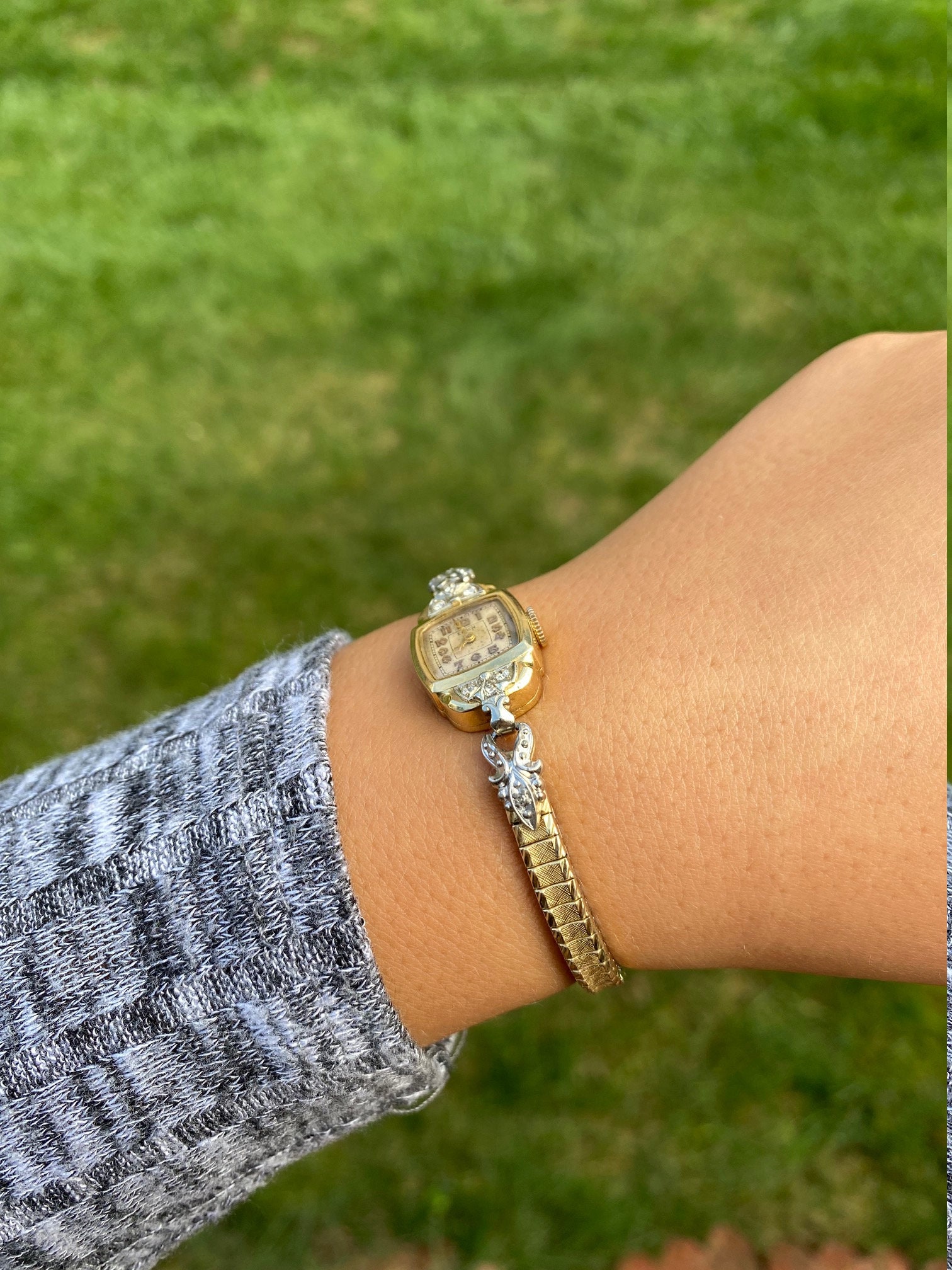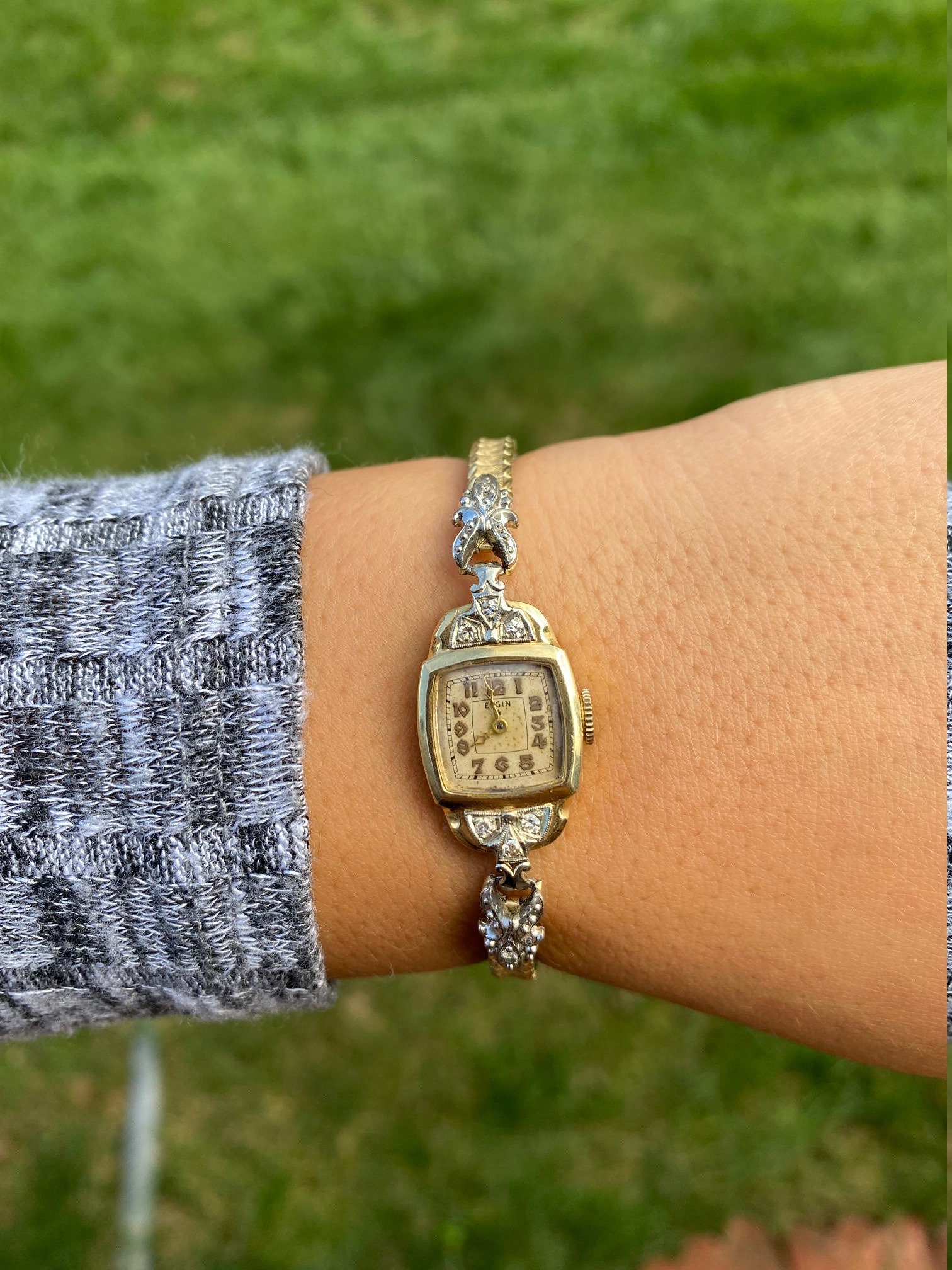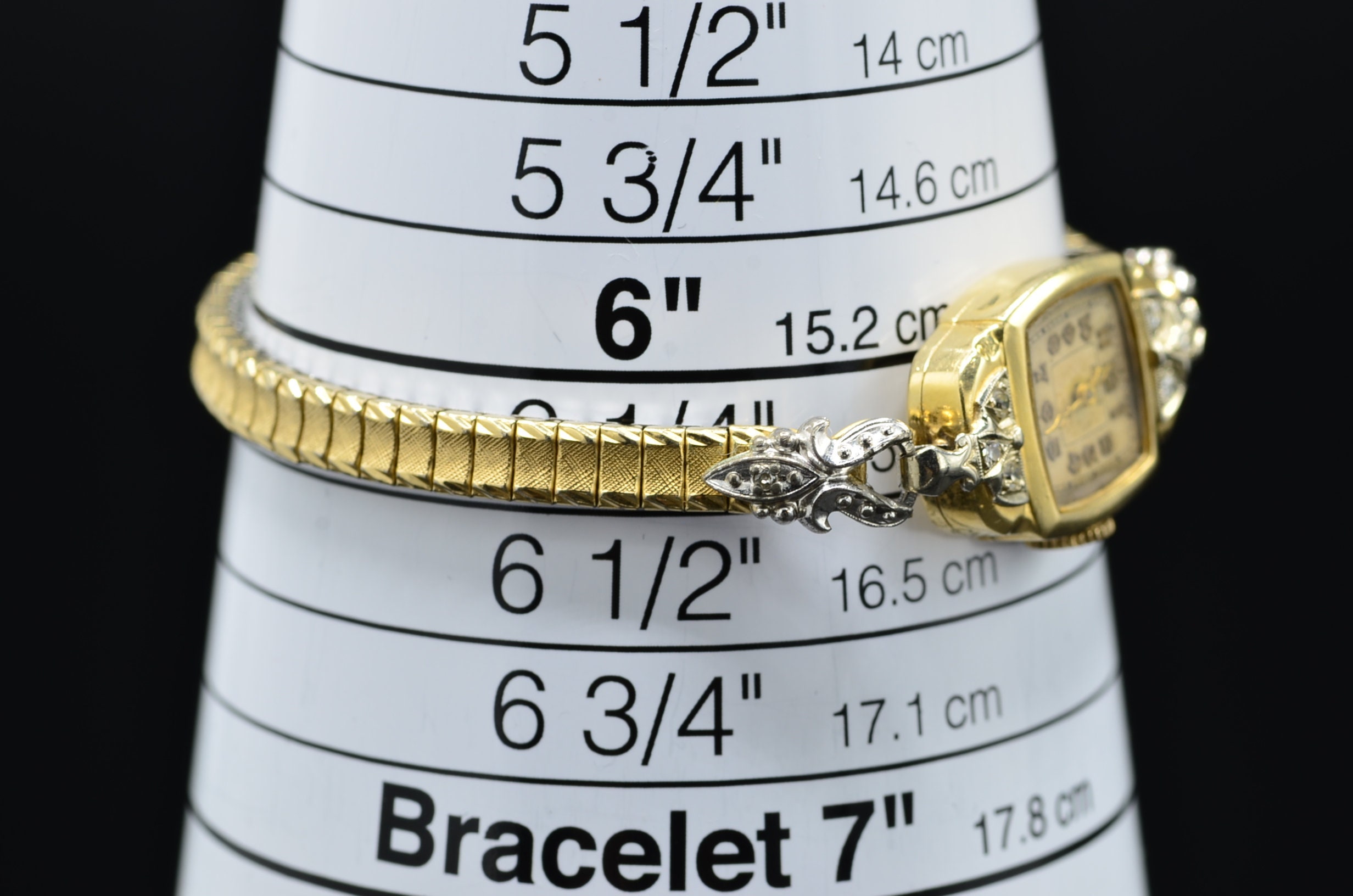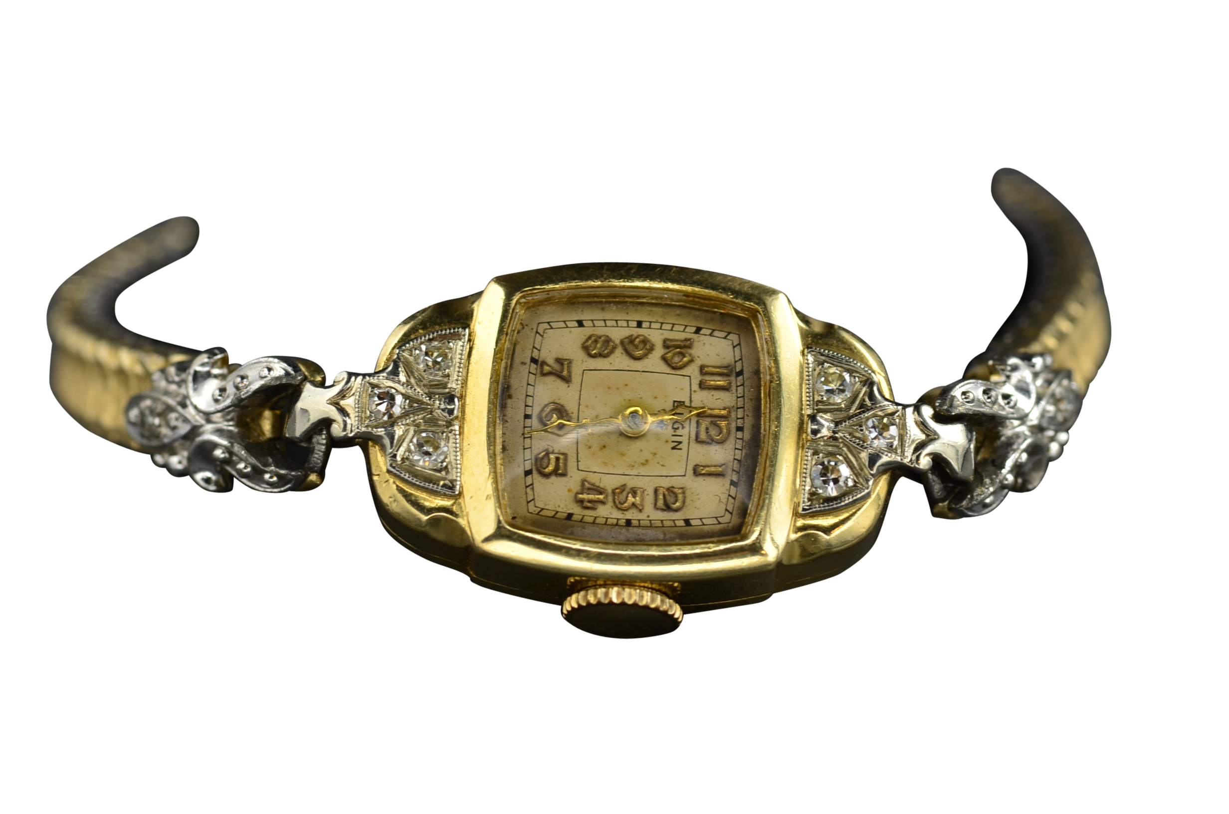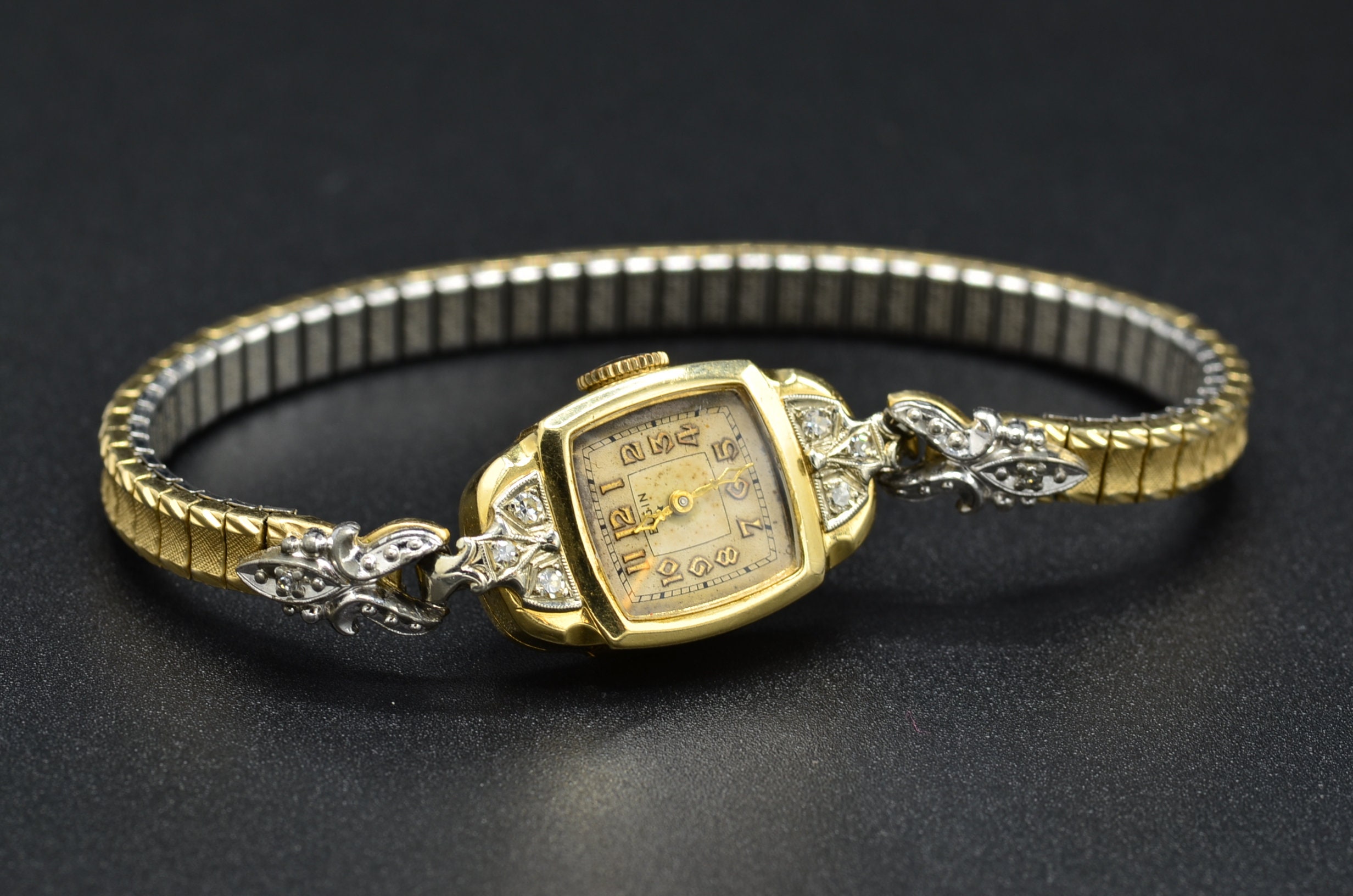 Vintage Ladies Lord Elgin Wristwatch in 14 Karat Gold. This watch is crafted in 14 karat white and yellow gold and features diamonds. The watch measures 6 1/4 inches in length and features a stretchable band that forms to your wrist at almost any wrist size. The band is silky smooth and comfortable to wear. The back of the case is engraved with the initials GAT and the date 12-6-41.