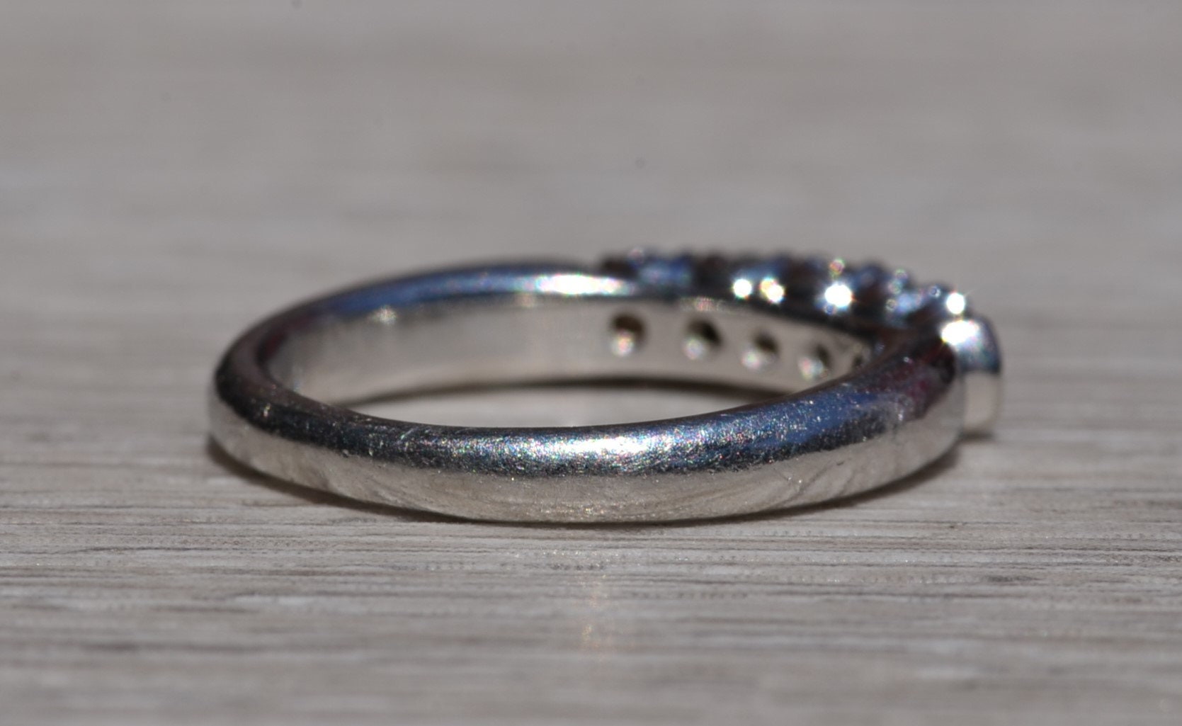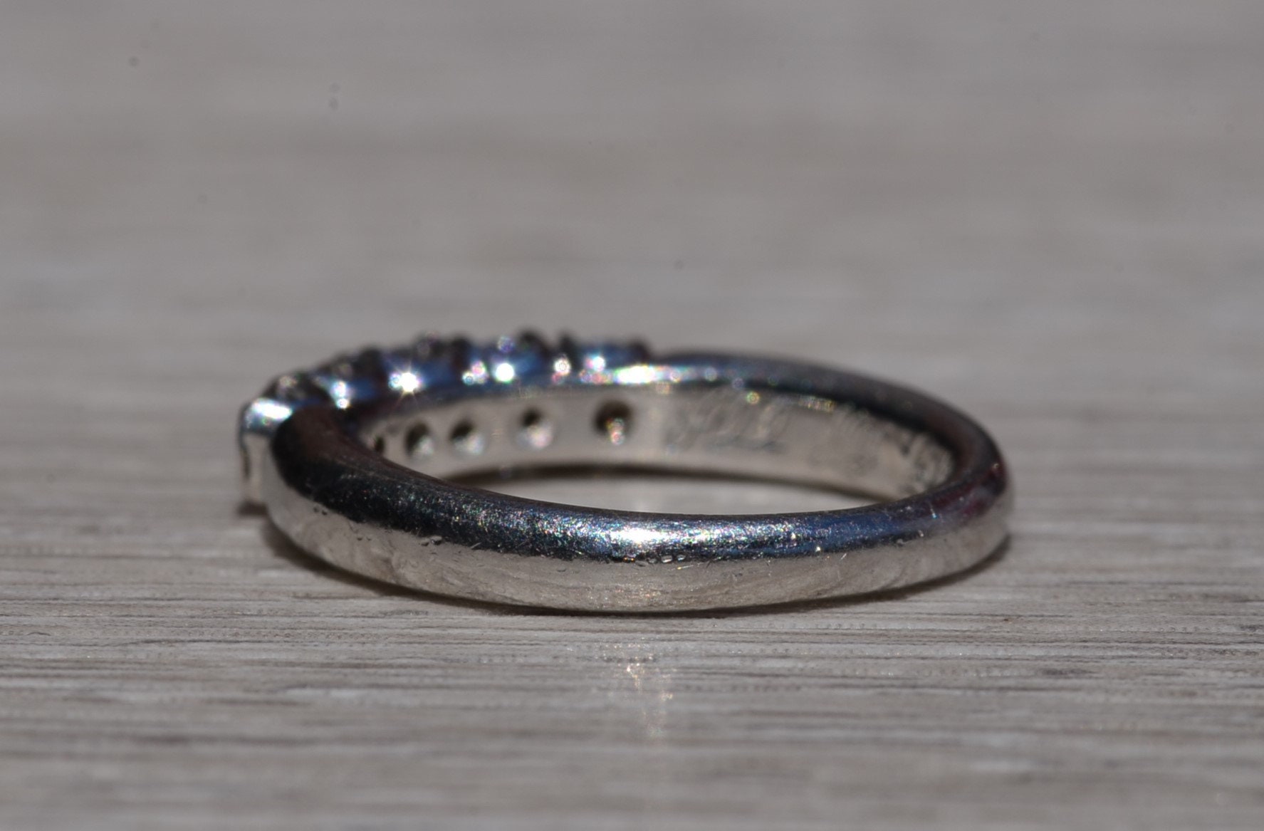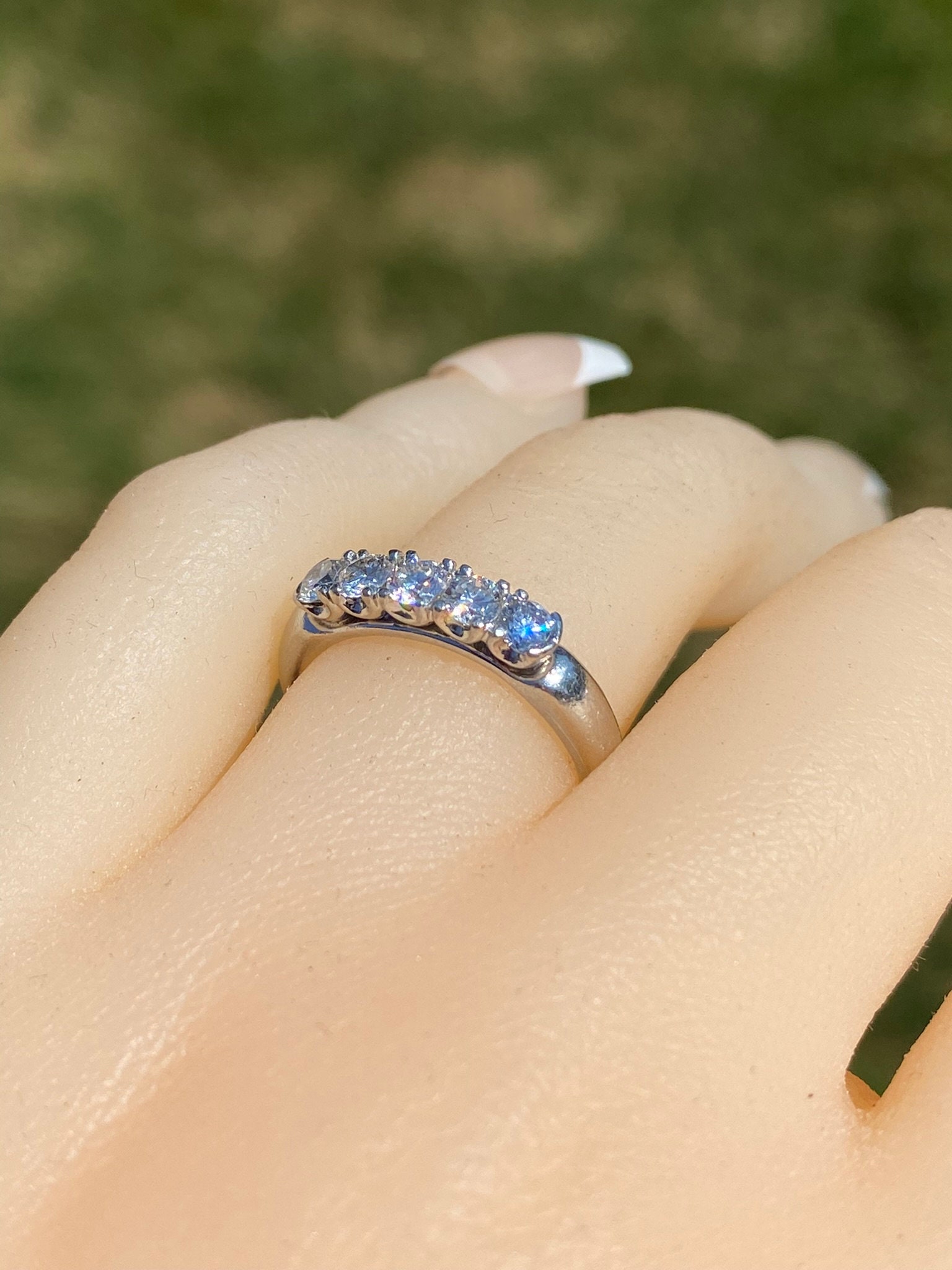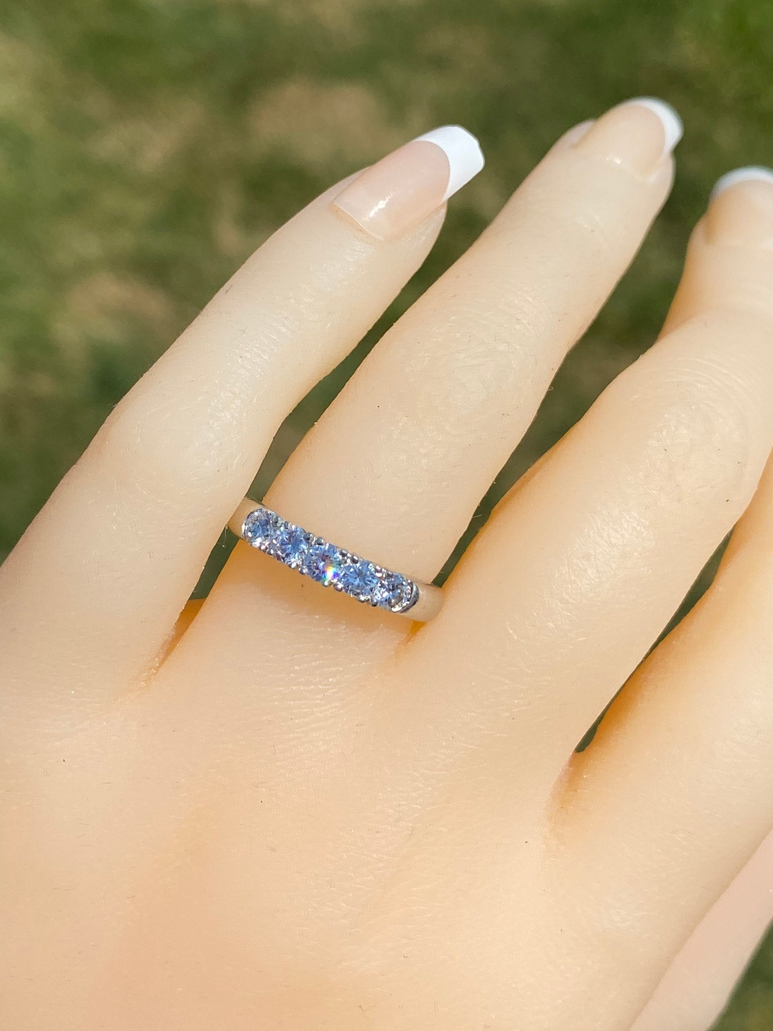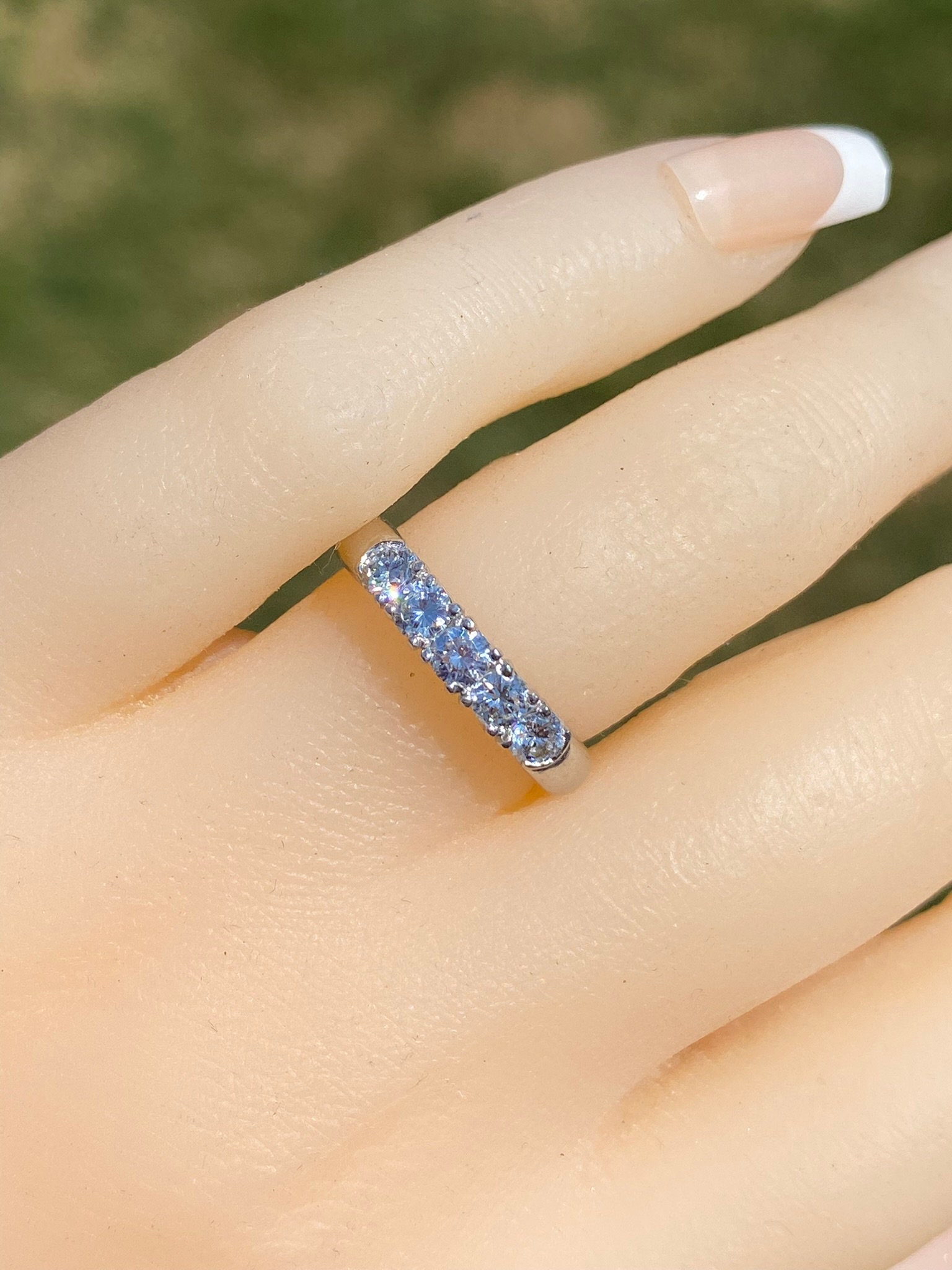 The Westville: Platinum and Diamond Stackable Band. The band features five (5) round brilliant cut diamonds across the top. The diamonds have an approximate weight by measurement of 0.50 carats. The ring is crafted in platinum and is currently a finger size 5 1/4 yet can be adjusted to any finger size for an additional charge on request.