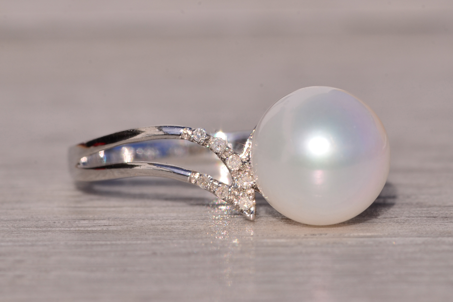 The White Sand: Pearl and Natural Diamond Ring in White Gold. This ring showcases a lustrous 8.50mm white cultured pearl nestled between the open ends of a bypass-style shank. Each end of the shank is adorned with a series of round-cut natural diamonds, adding a touch of sparkle to the design. Crafted in 14 karat white gold, this elegant piece is currently sized at 7 but can be adjusted to any finger size for an additional charge upon request.