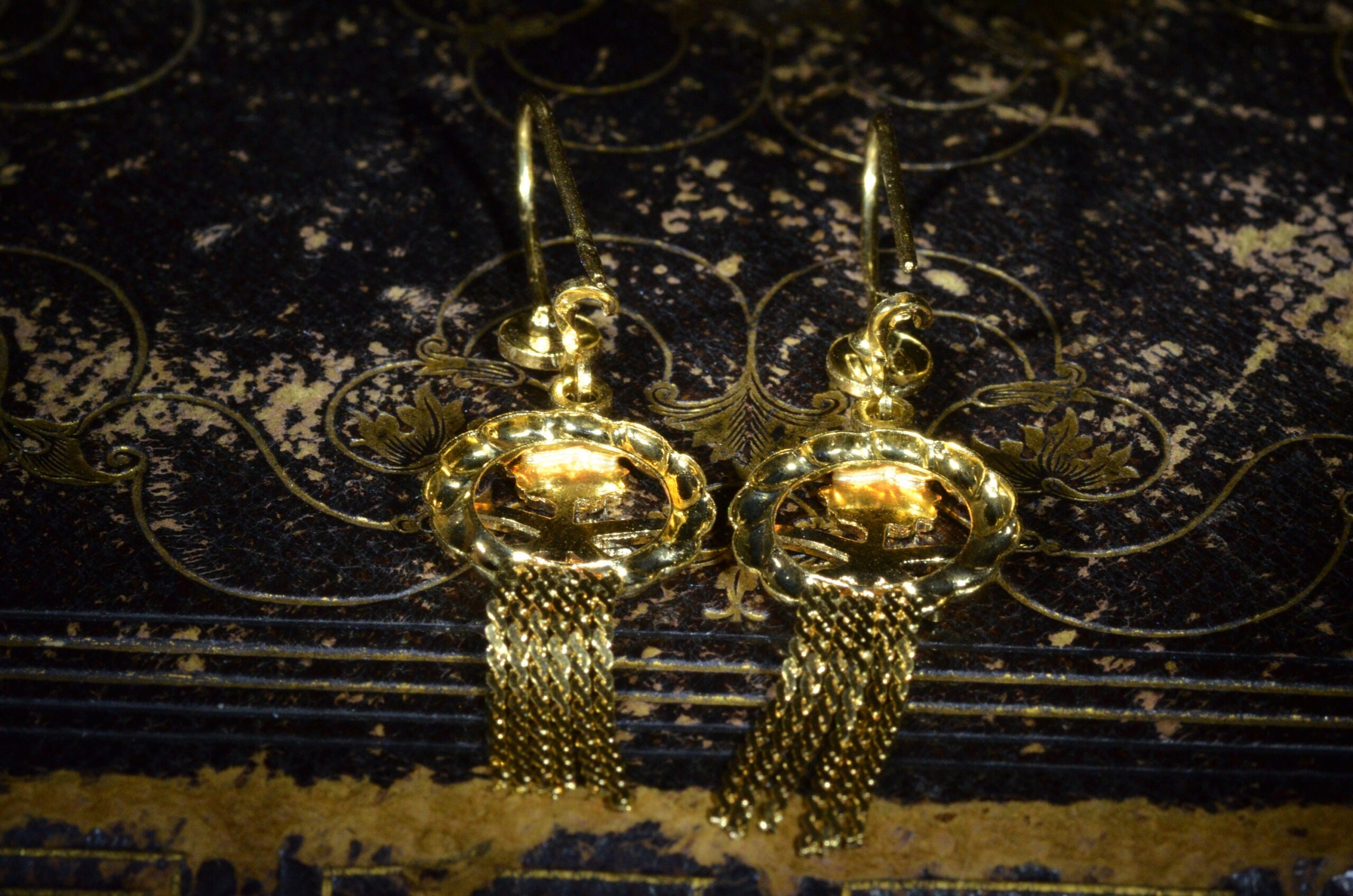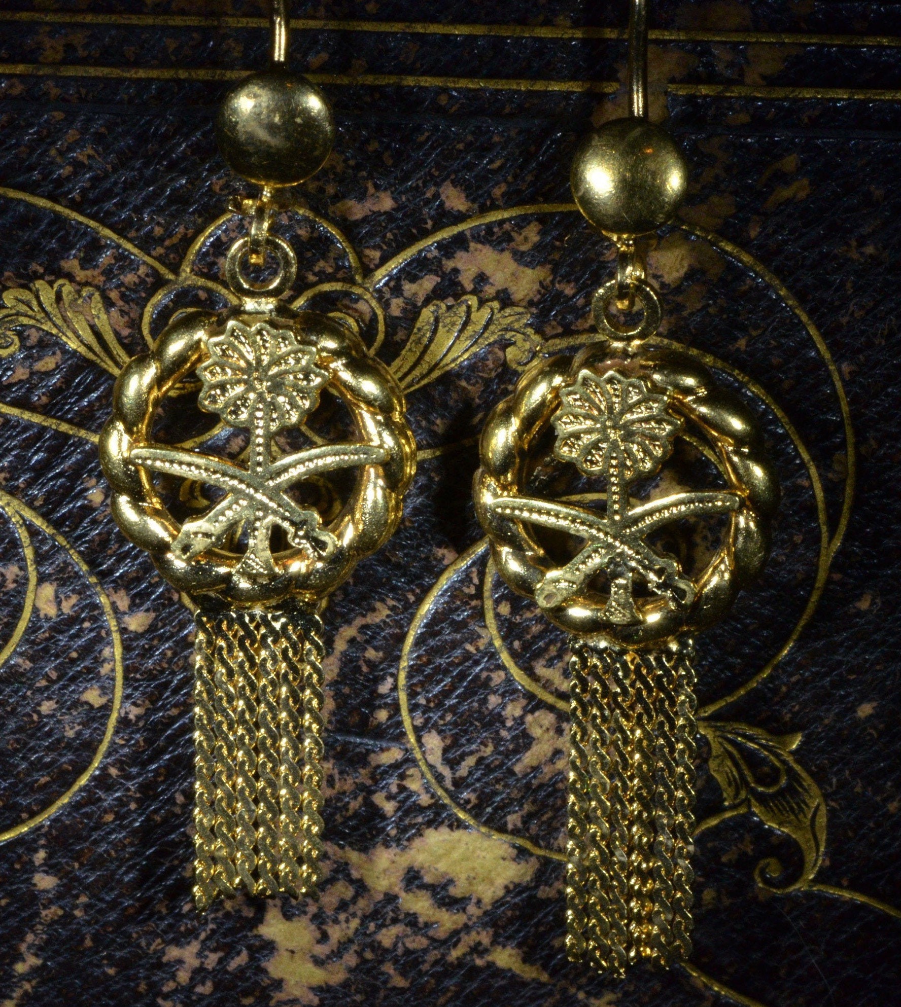Vintage Saudi Dangling Earrings. The earrings feature the iconic Saudi symbol in the center with a playful dangle of gold below and in interested buttoned gold french top. The earrings are crafted in 18 Karat Yellow gold and are very comfortable to wear. The have a fun dangle to them and create a nice presence on the ear.