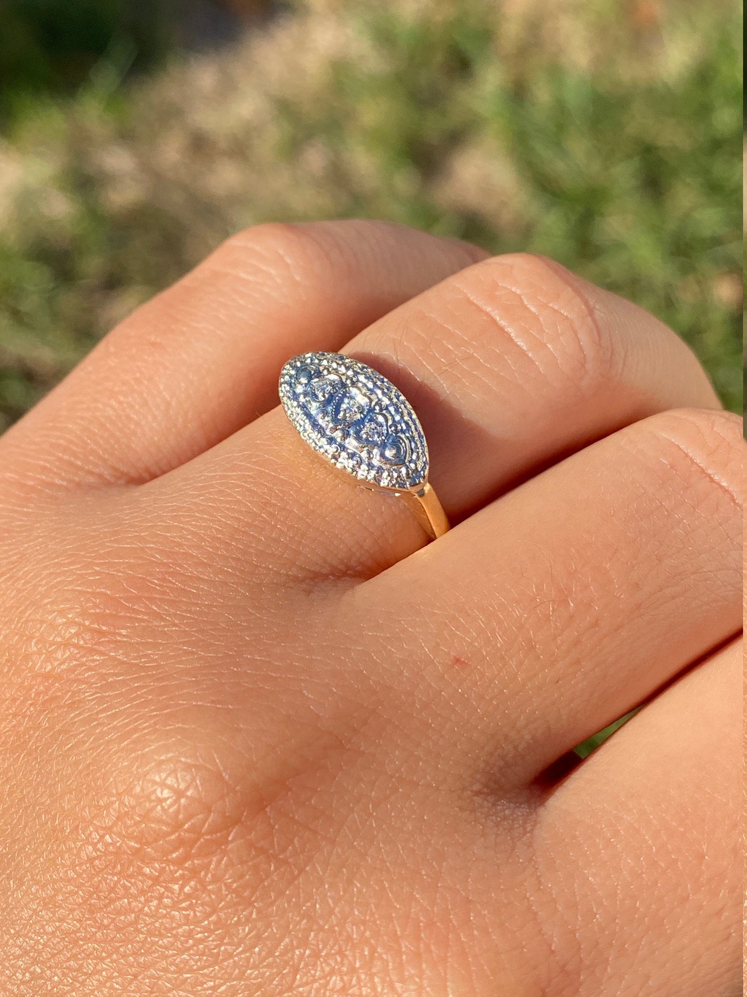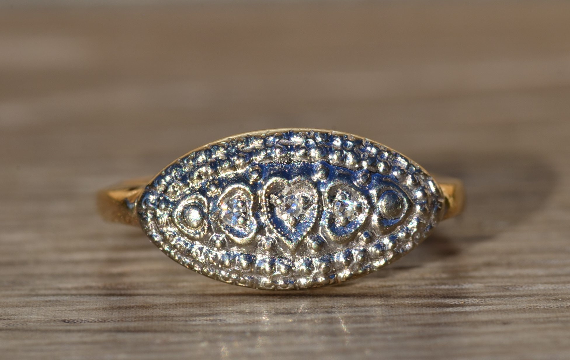 Ladies Signed Devotion 14K Gold Cocktail Ring. Crafted in 14 karat yellow gold, this designer cocktail ring features three accent diamonds set within heart shaped boxes. The ring is signed Devotion and is currently a finger size 6.25. We are able to resize this ring for an additional charge upon request.