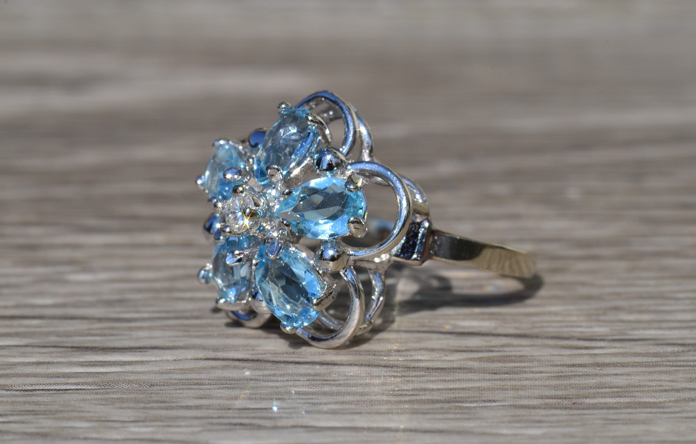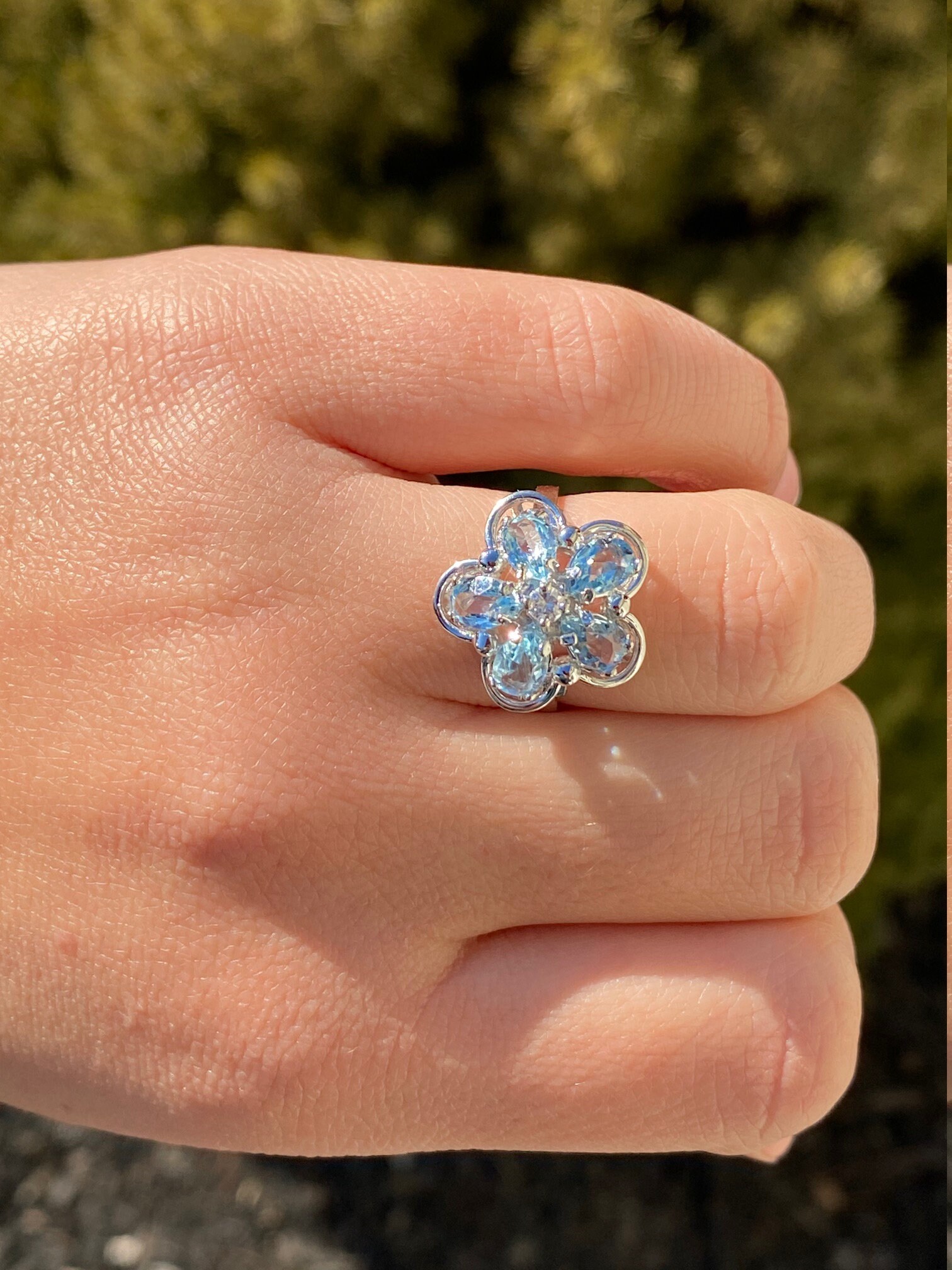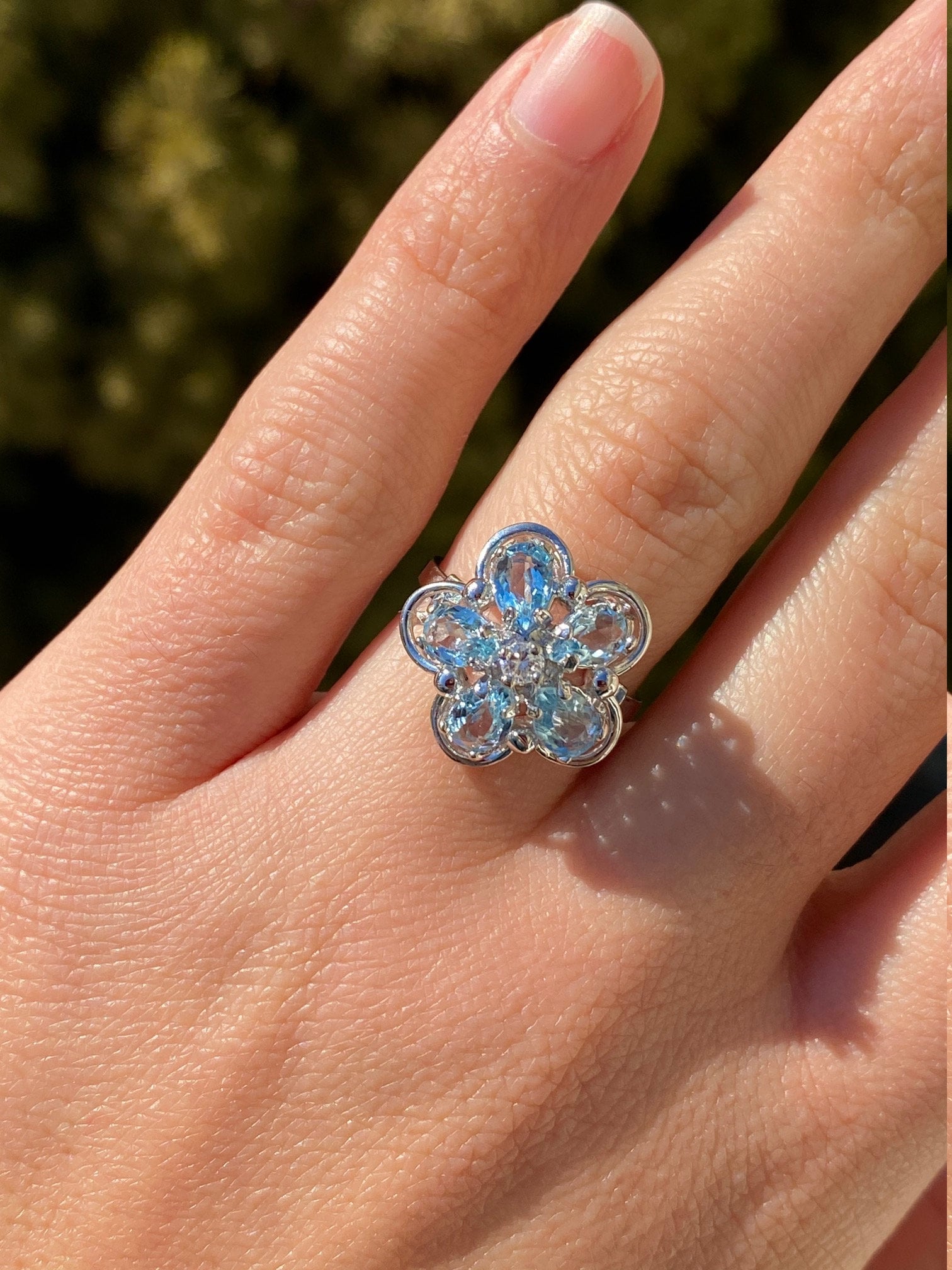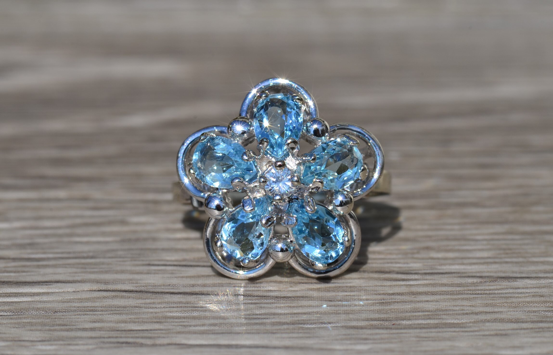 Ladies 14K Aquamarine and Diamond Floral Ring. Expertly crafted in 14 karat white gold, this ladies ring features a floral design set with pear shaped aquamarine as the flower’s petals. A central diamond brings the whole design together. The ring is currently a finger size 6, yet is able to be resized.