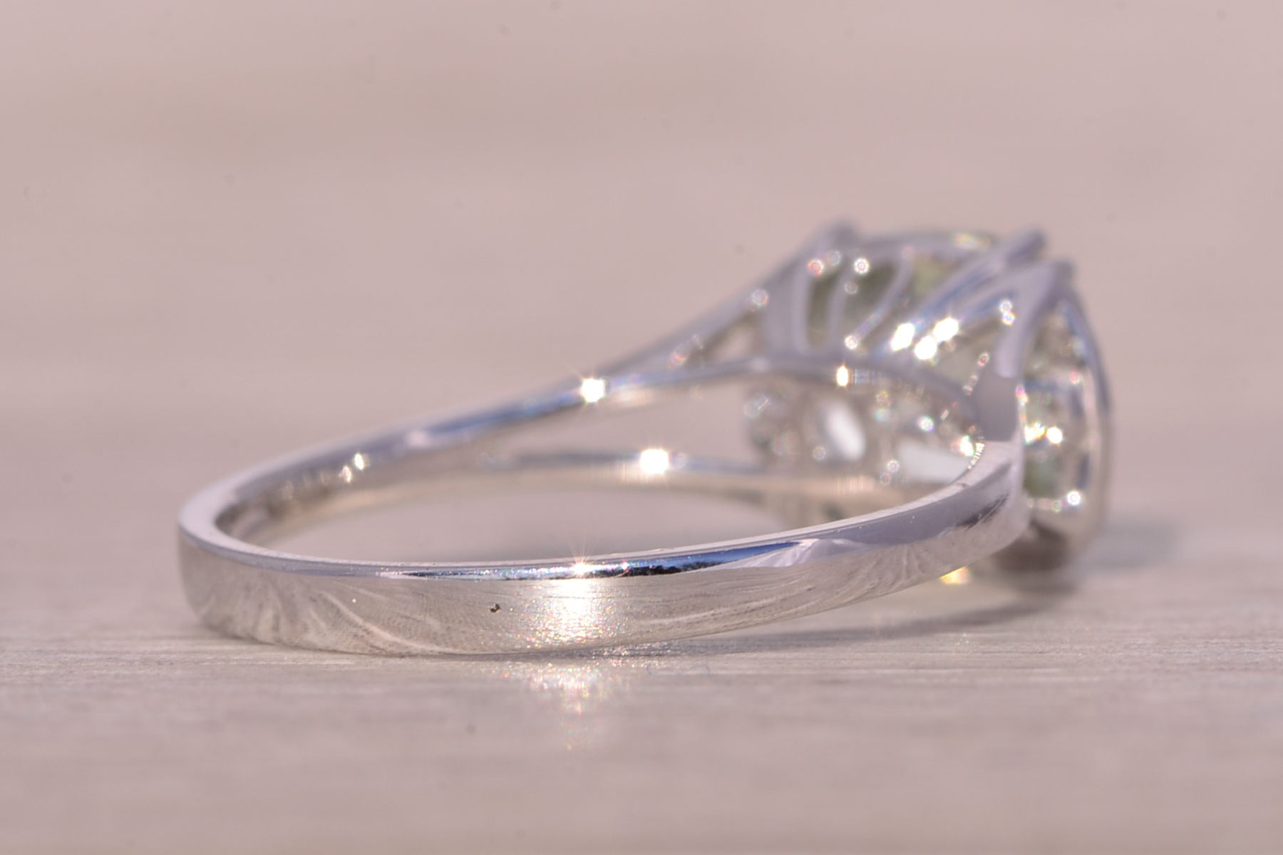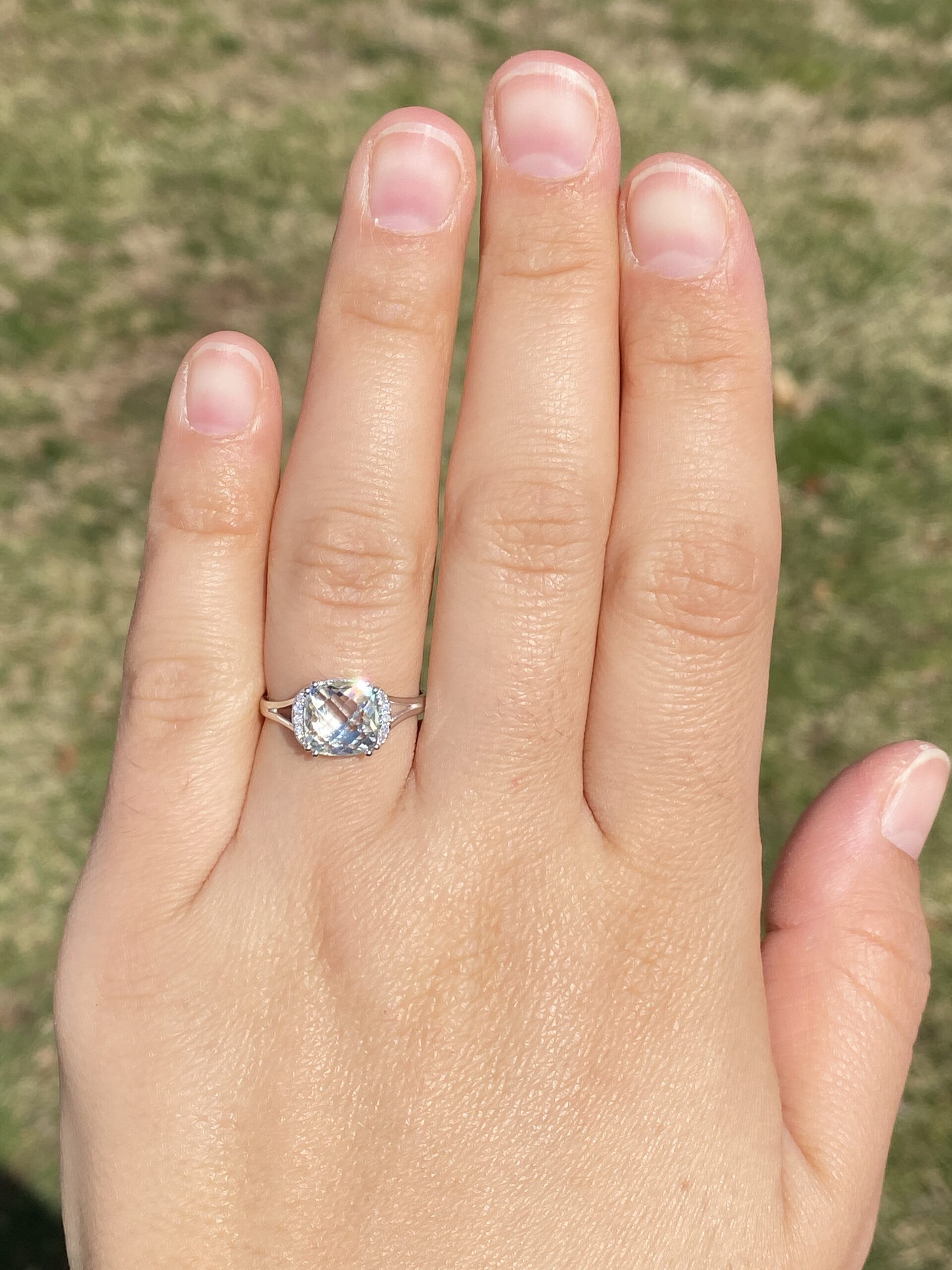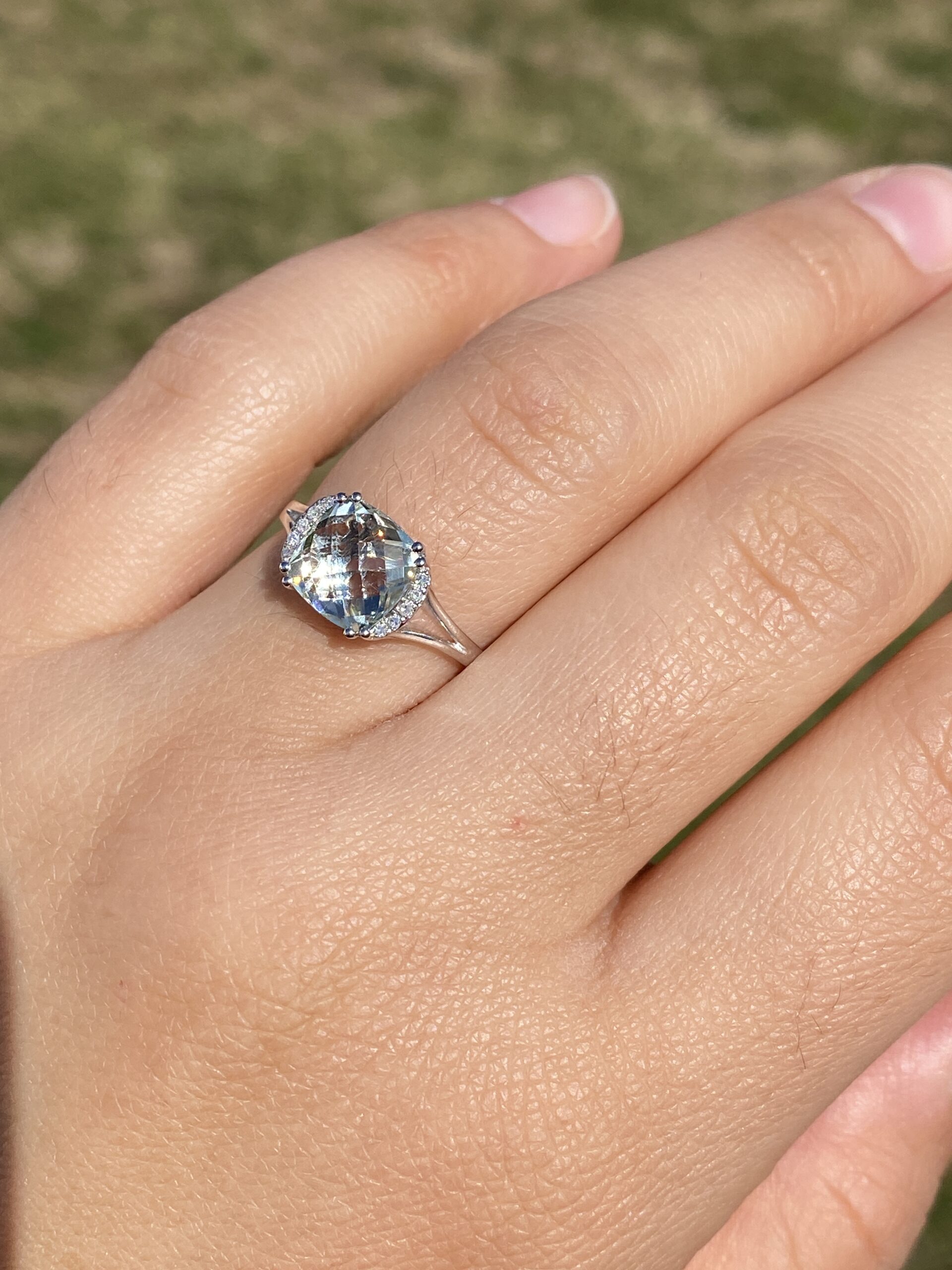 The Zazz: Prasiolite and Natural Diamond Ring in White Gold. This captivating ring showcases a cushion checkerboard-cut prasiolite, emanating a soothing medium-light green hue at its center. Adorning either side of the center stone are a series of round-cut natural diamonds, adding brilliance and elegance to the design. The ring is elegantly finished with a split shank, completing the look with grace. Crafted in luxurious 14 karat white gold, this stunning piece is currently a finger size 6.75. Adjustments to any finger size are available upon request for an additional charge, ensuring a perfect fit for your individual style.