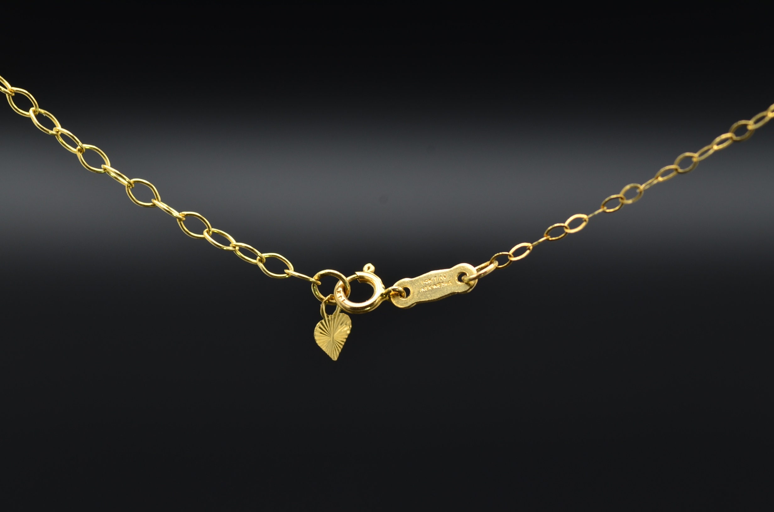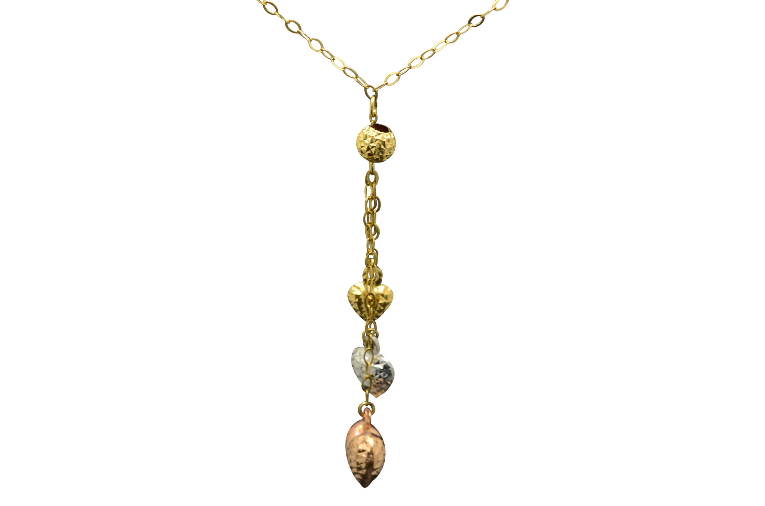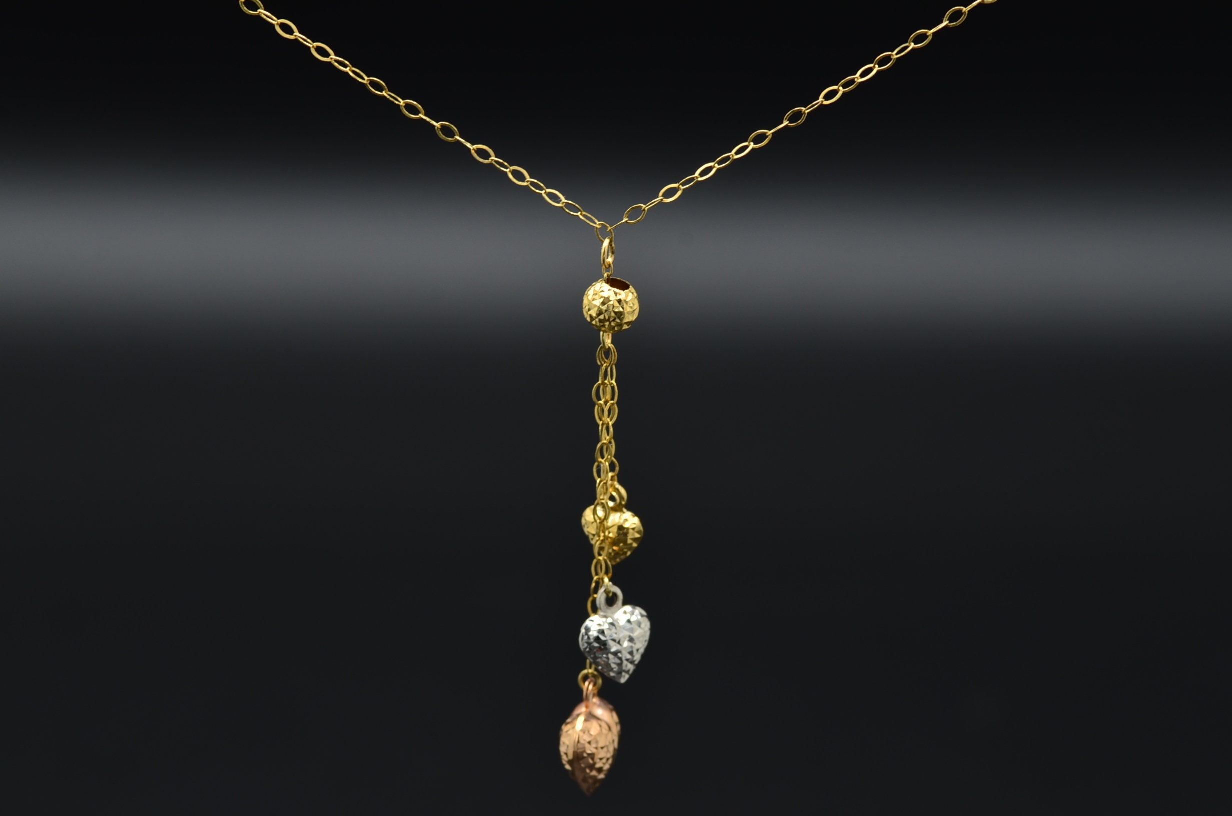 Ladies 14K Tricolor Dangling Heart Necklace. This 18 inch adjustable necklace features three dangling faceted heart pendants each in a different shade of gold. This fun necklace features an easy to close spring ring clasp and can be adjusted from 18 inches to 16 inches.