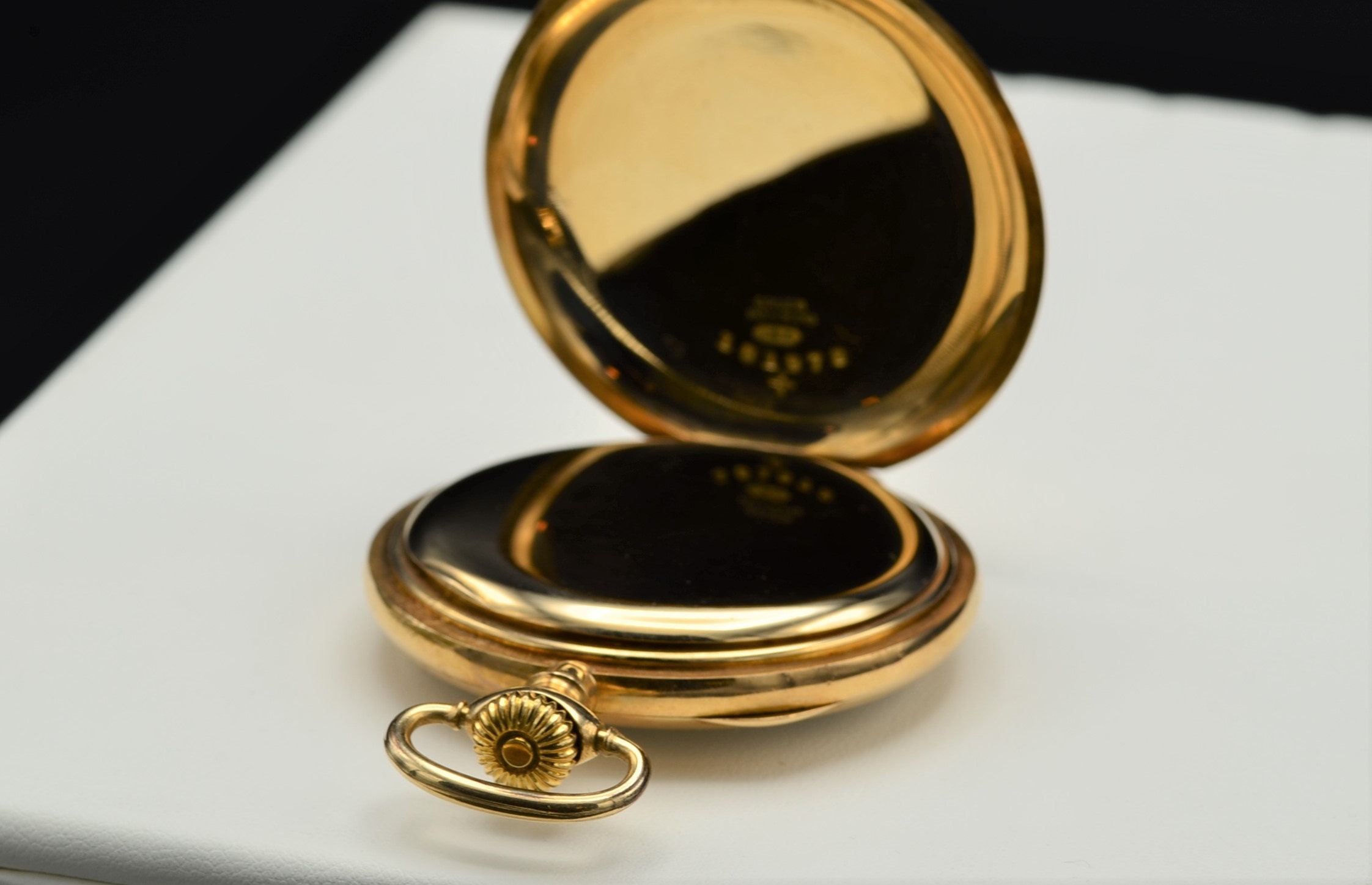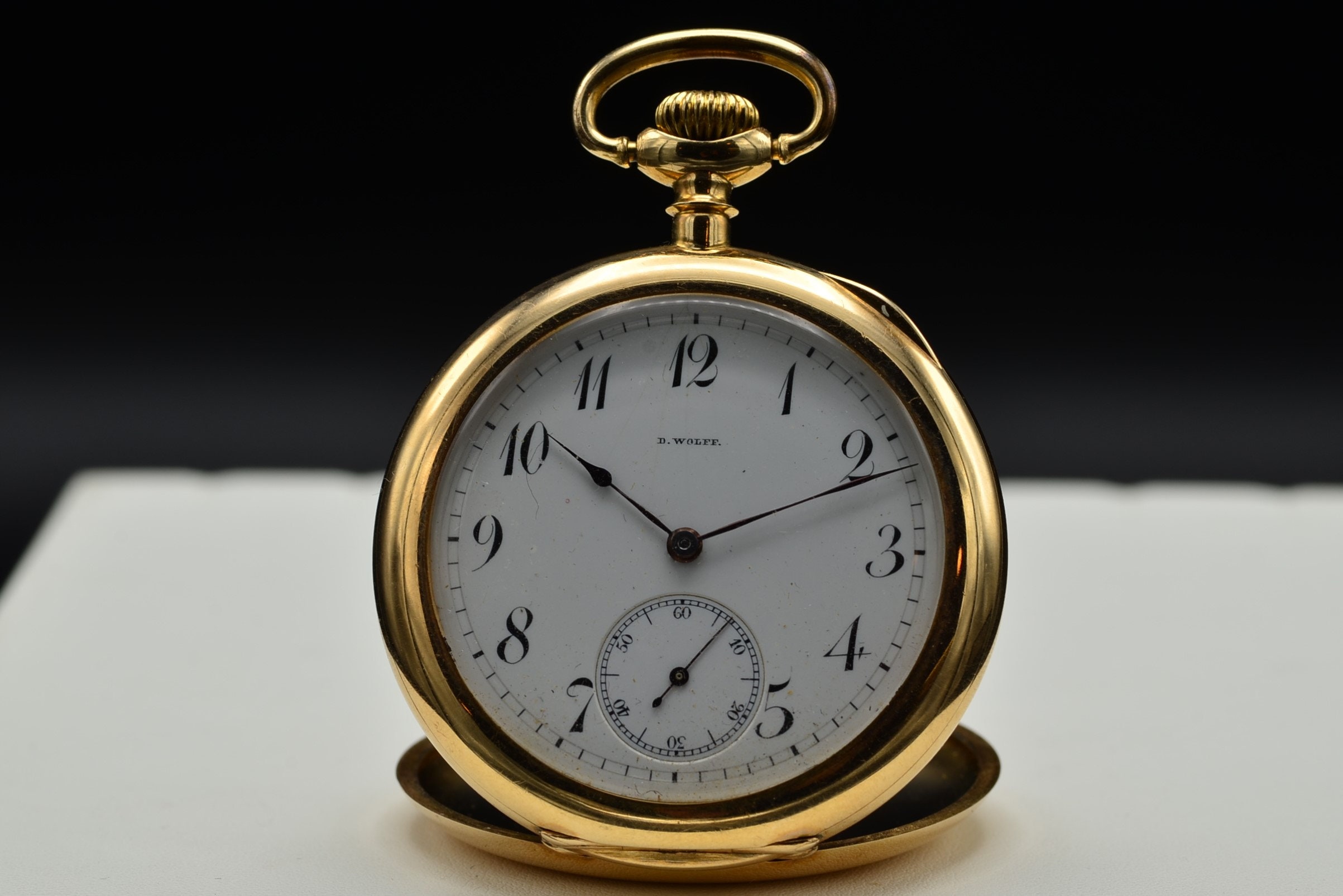 Antique Engraved B Wolff Gruen Pocket Watch in 14 Karat Yellow Gold. The timepiece has bail at the top for easy attachment to watch chain. The porcelain and enamel dial reveals Arabic hour markers and separate seconds register. The watch is engraved on the reverse and is marked 14 karat yellow gold.