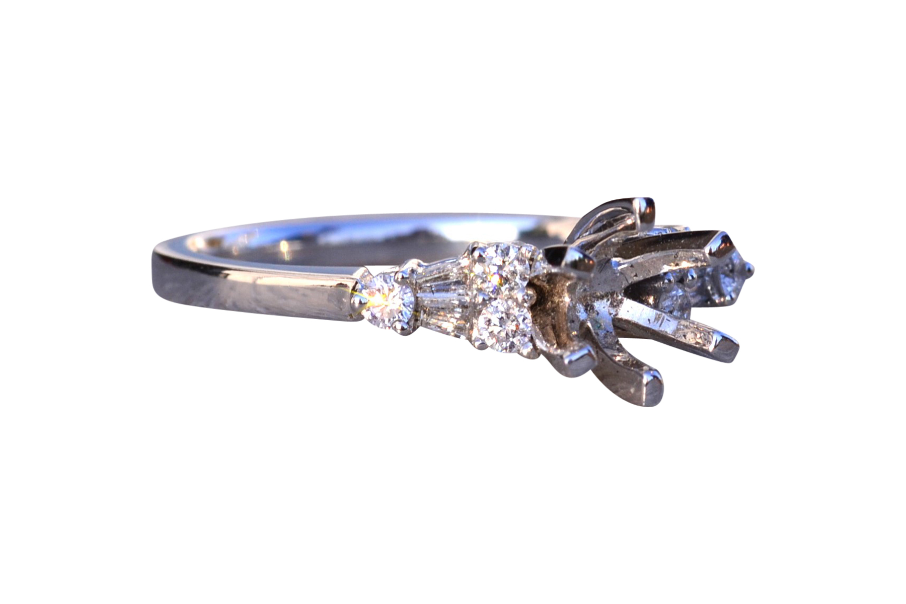 White Gold and Natural Diamond Mounting with Baguettes and Rounds. The diamonds have an approximate weight by measurement of 0.29 carats.