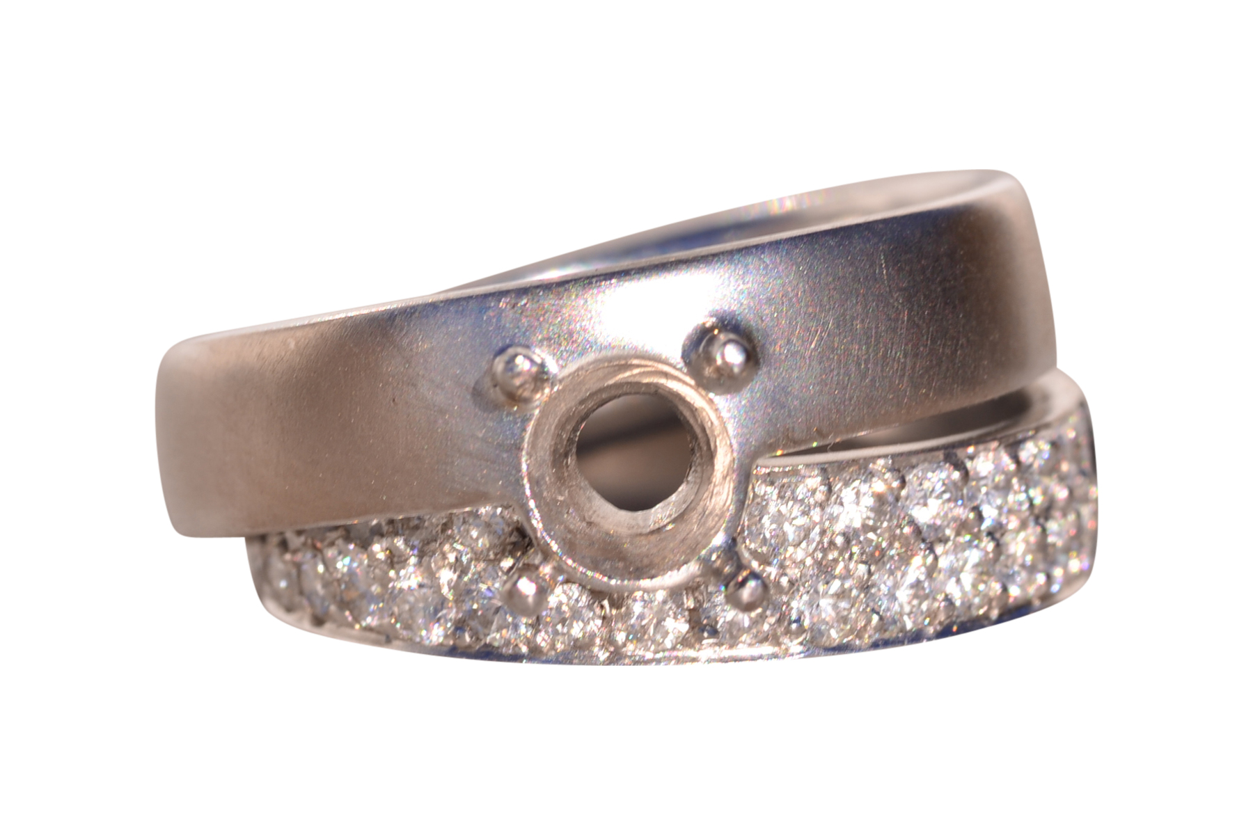 White Gold Natural Diamond Semi Mounting. The mounting features a double shank with one shank set with round brilliant cut natural diamonds with a total weight of 0.60 carats in two rows. The other shank is finished with a brushed patina to finish the look.