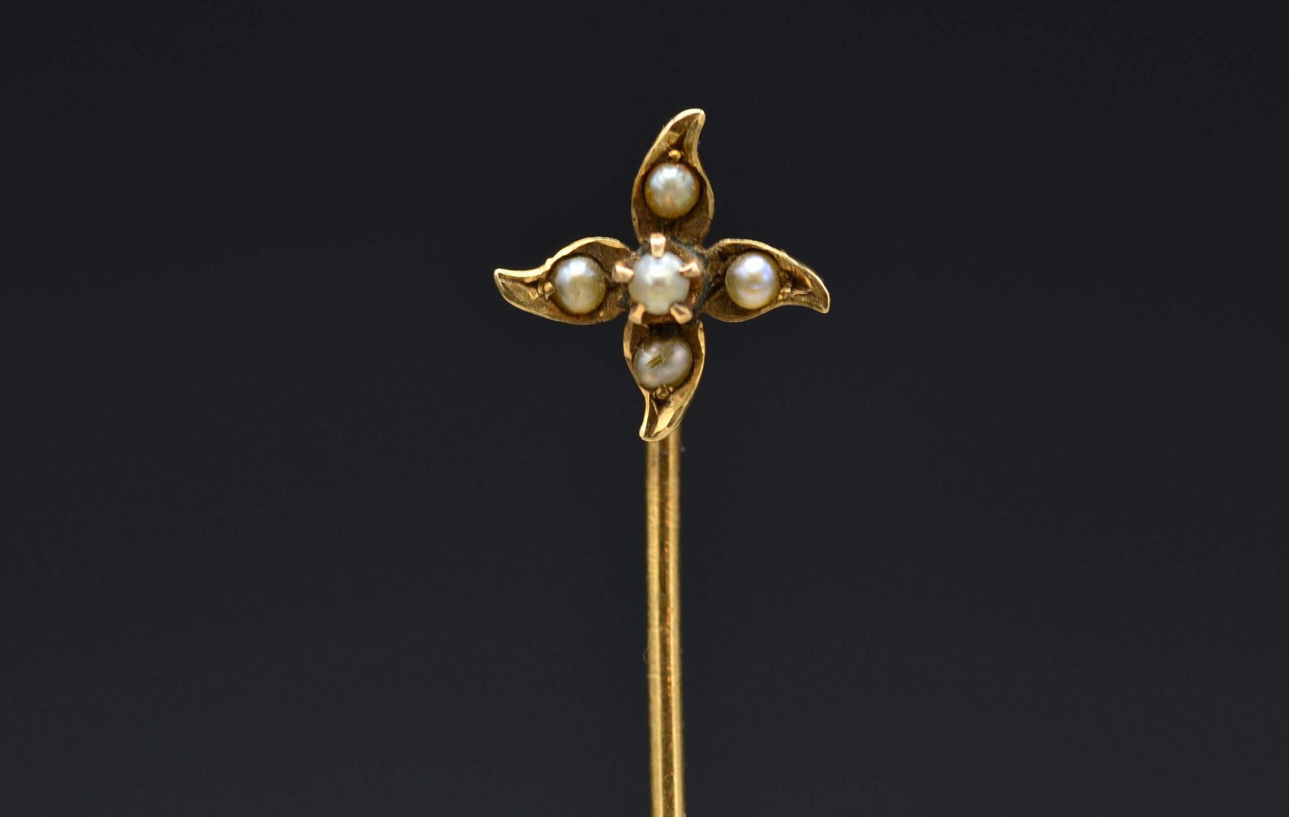 14 Karat yellow gold floral motif stickpin set with natural seed pearls. This pin measures 2 inches in length and would make a great addition to any hat or lapel.