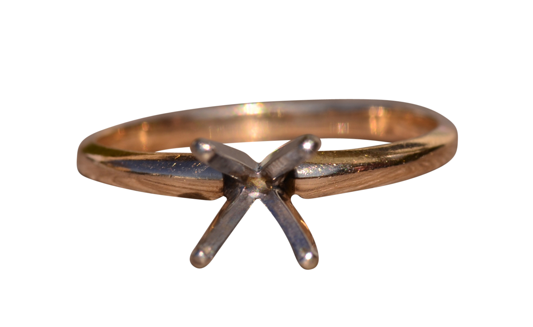 Yellow Gold Solitaire Mounting with four prong white gold head. The center will fit a one carat round brilliant cut diamond yet can be changed to accommodate any size stone.